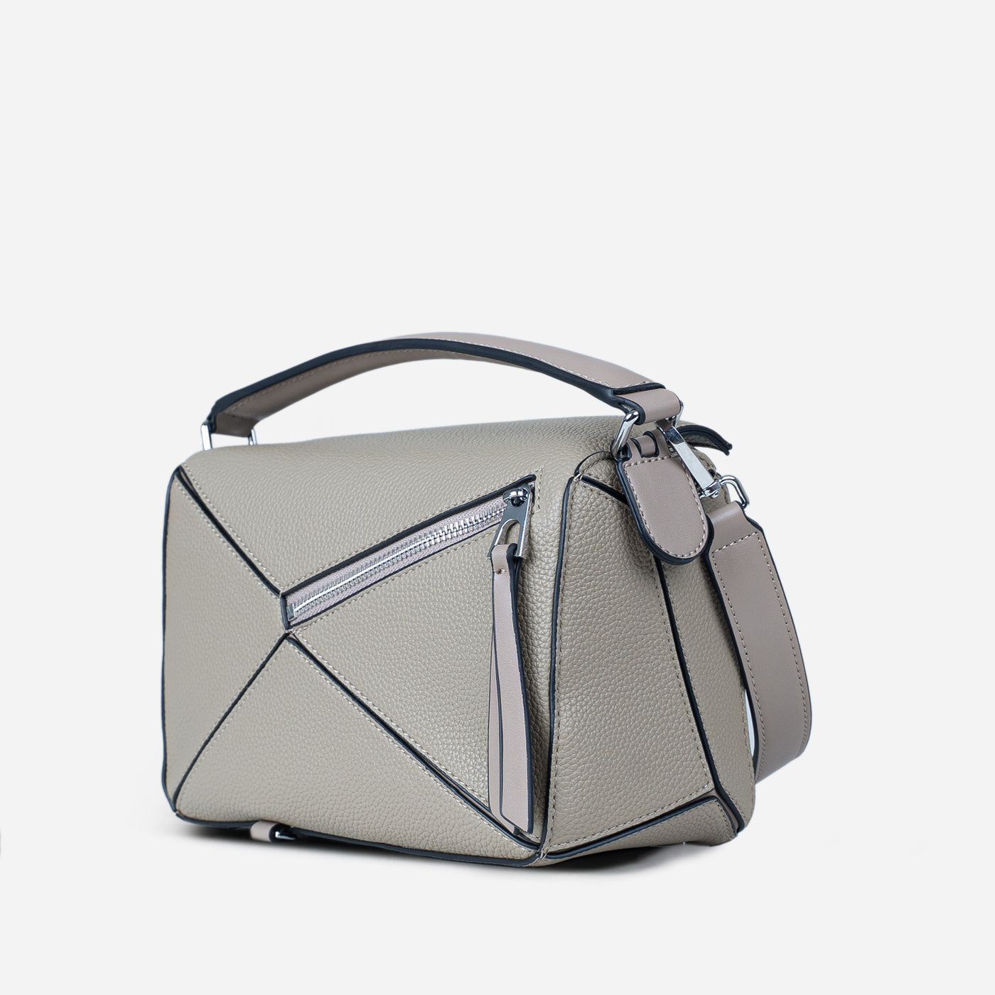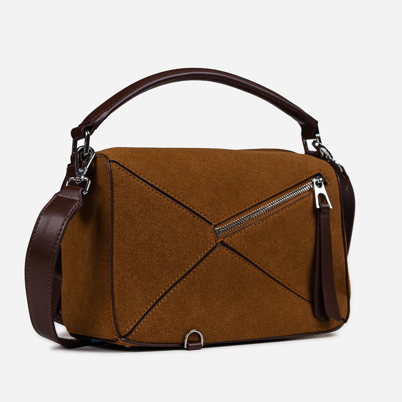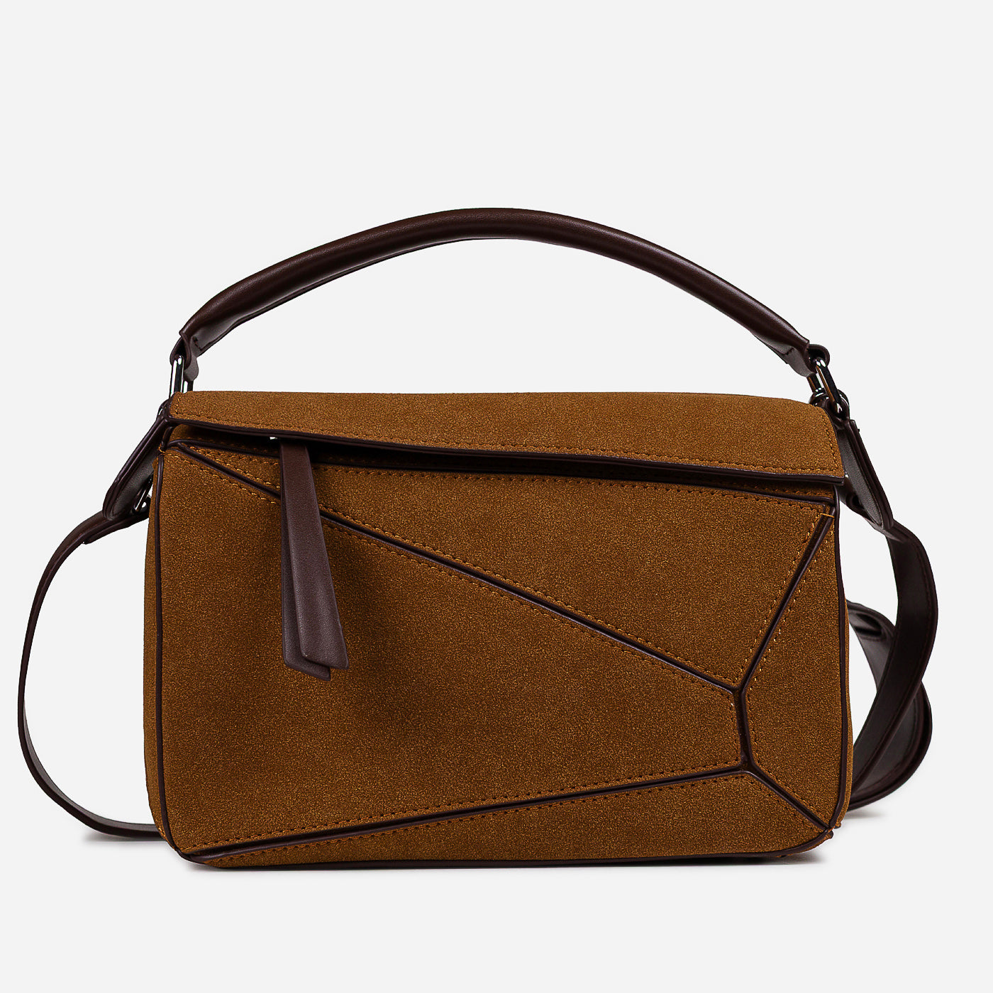 Rich and distinctive, this structured shoulder bag stands out with its soft suede-textured finish and striking geometric panel design. Accented with smooth faux leather trim and a sleek top handle, it brings a refined yet modern feel to everyday styling. Compact in size but thoughtfully designed, it’s perfect for carrying essentials while making a subtle statement.