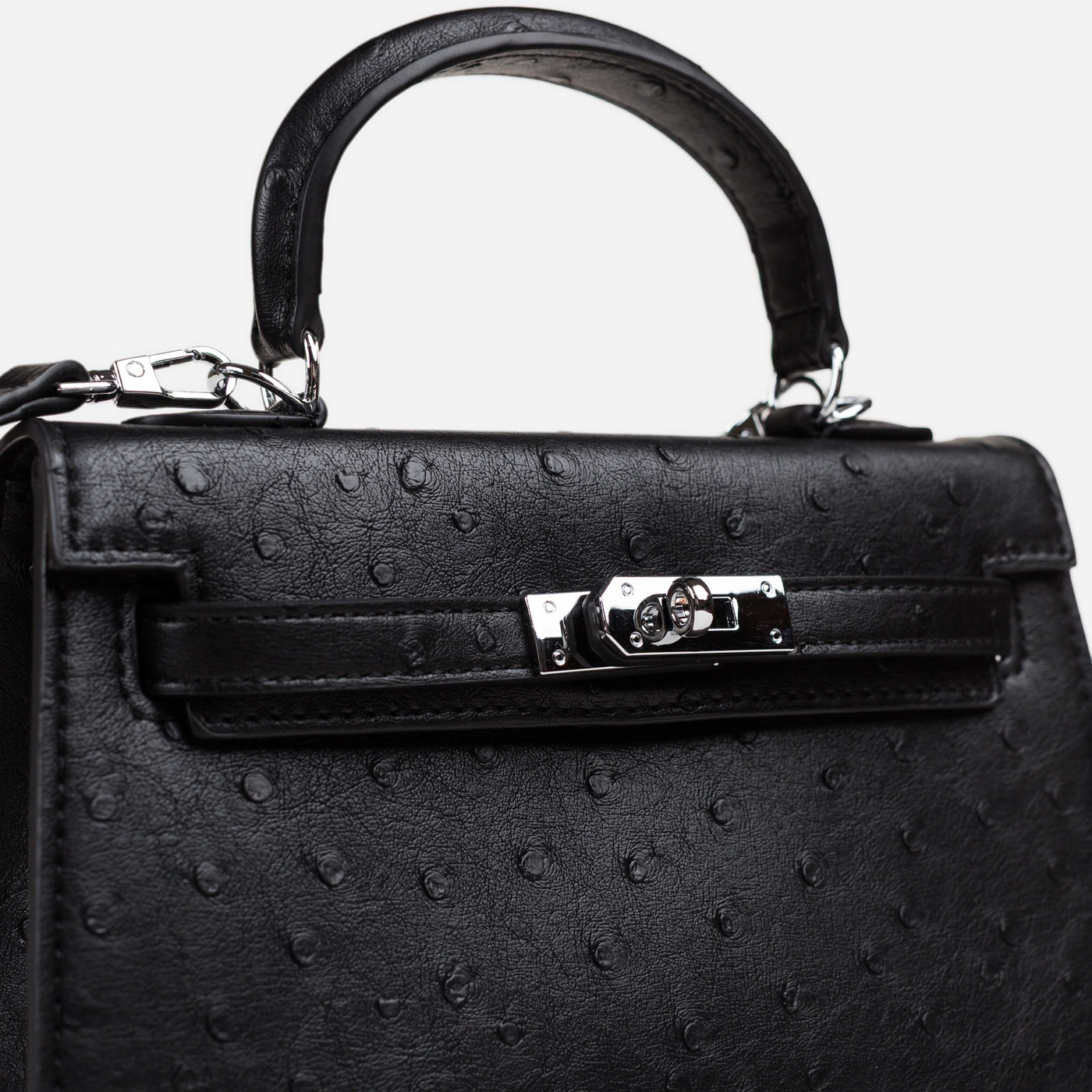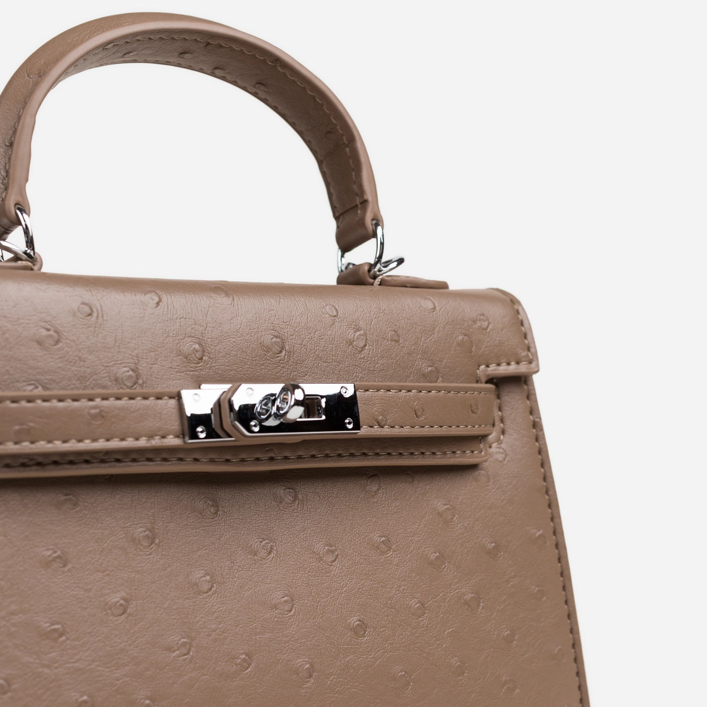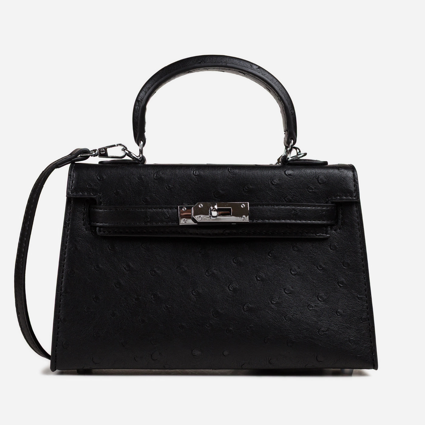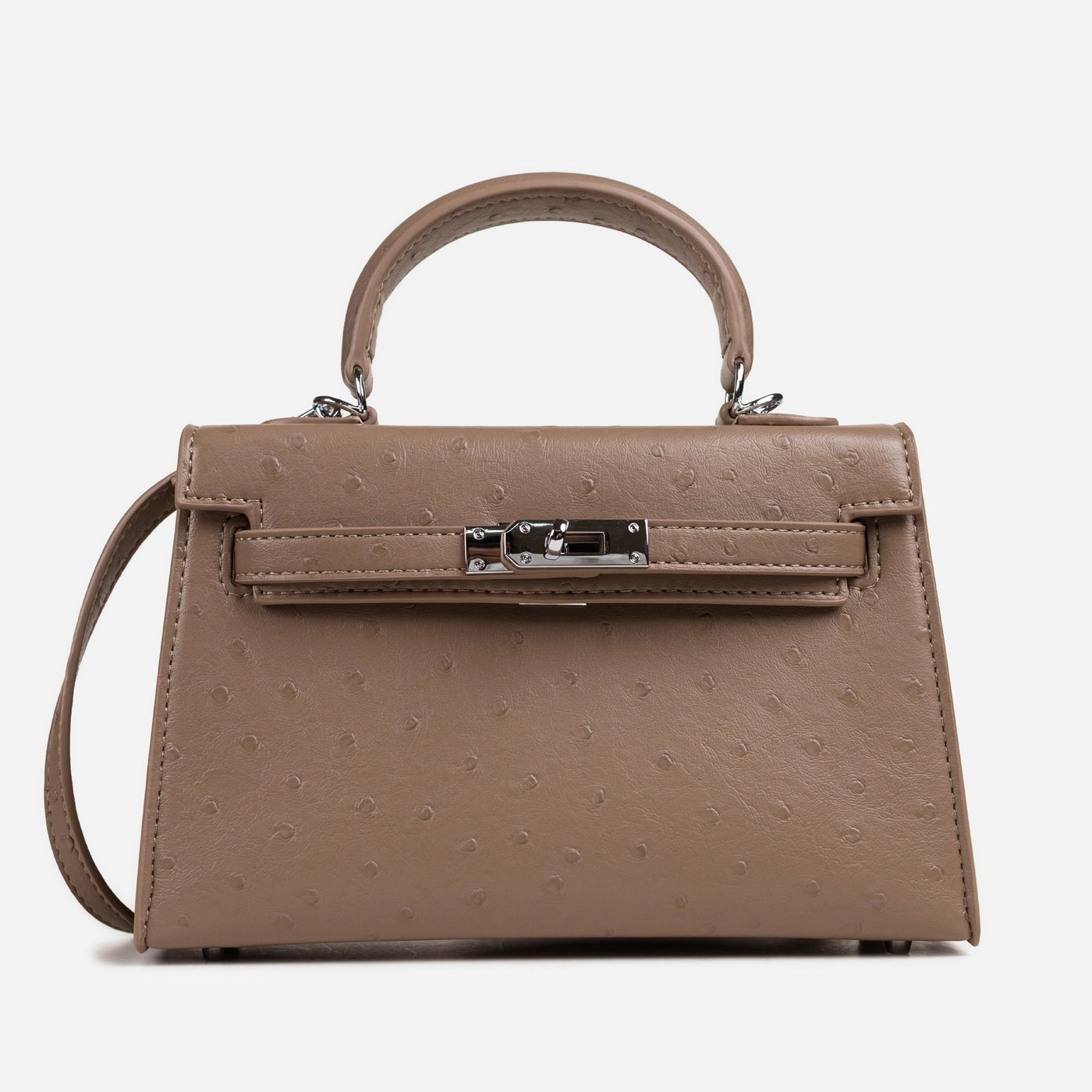 Timeless elegance in a refined structured silhouette. This piece features luxurious ostrich-embossed leather with distinctive textured finish creating sophisticated dimensional appeal. The curved top handle ensures comfortable carry, while the signature turn lock closure delivers secure elegant fastening. Detachable crossbody strap offers versatile carrying options, and the spacious interior provides organized storage for daily essentials.
