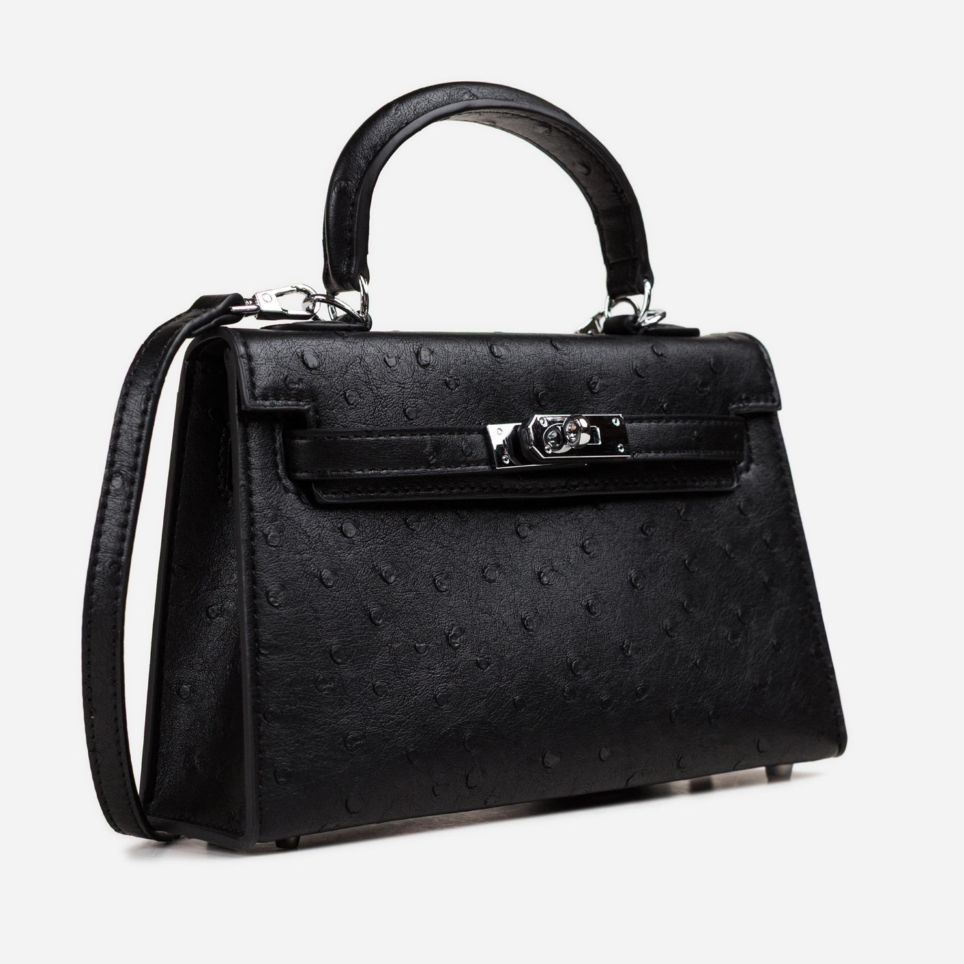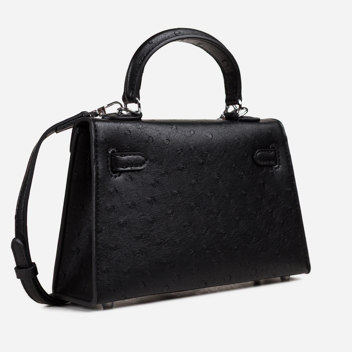 The black version of this mini bag features the same ostrich-emboss construction with the quill pattern running in a diagonal direction across the body panels, creating a directional texture that catches light differently from the other colorways. The silver-tone turn-lock and front strap sit centred on the flap, and the long flat crossbody strap extends from the side D-rings to the floor in the image, showing the full adjustable length available for shoulder or crossbody carry. The rolled top handle is finished in matching black embossed leather throughout.