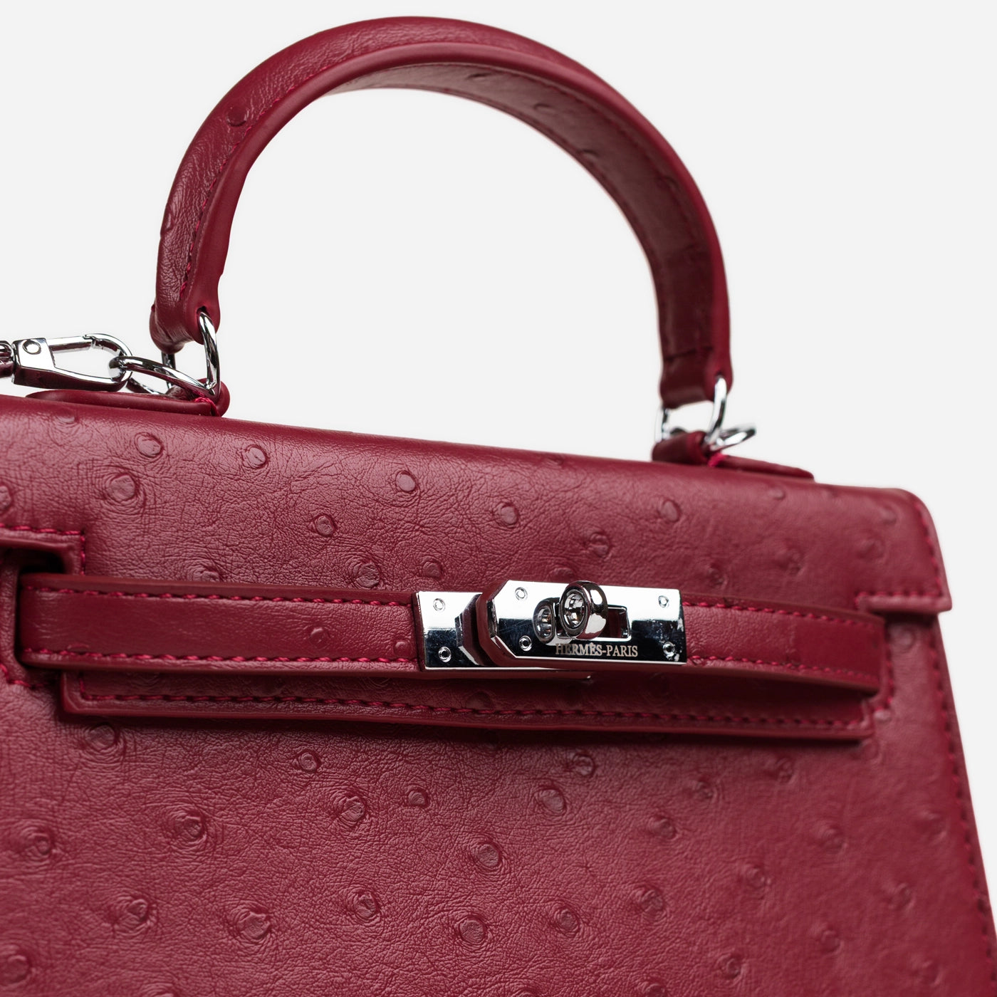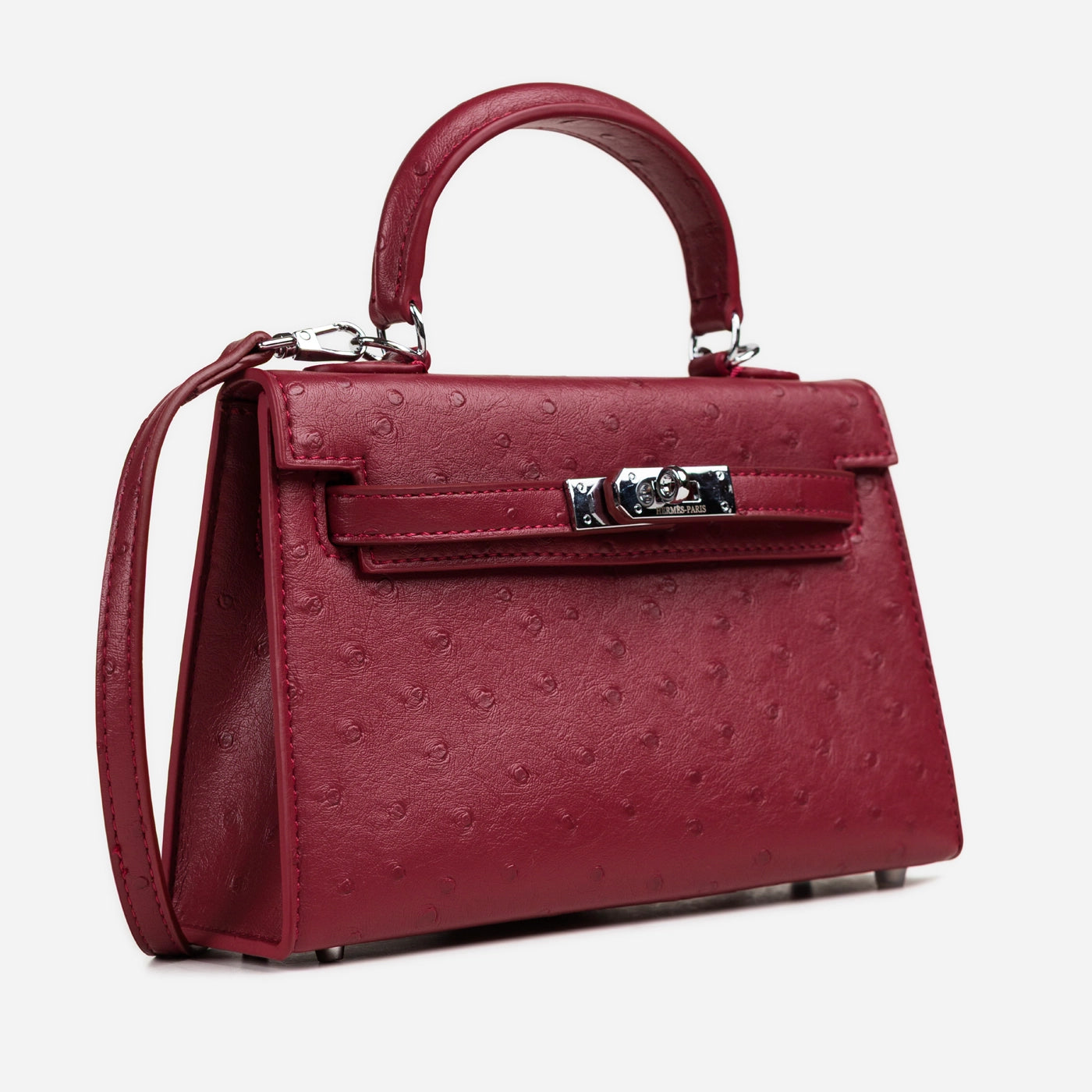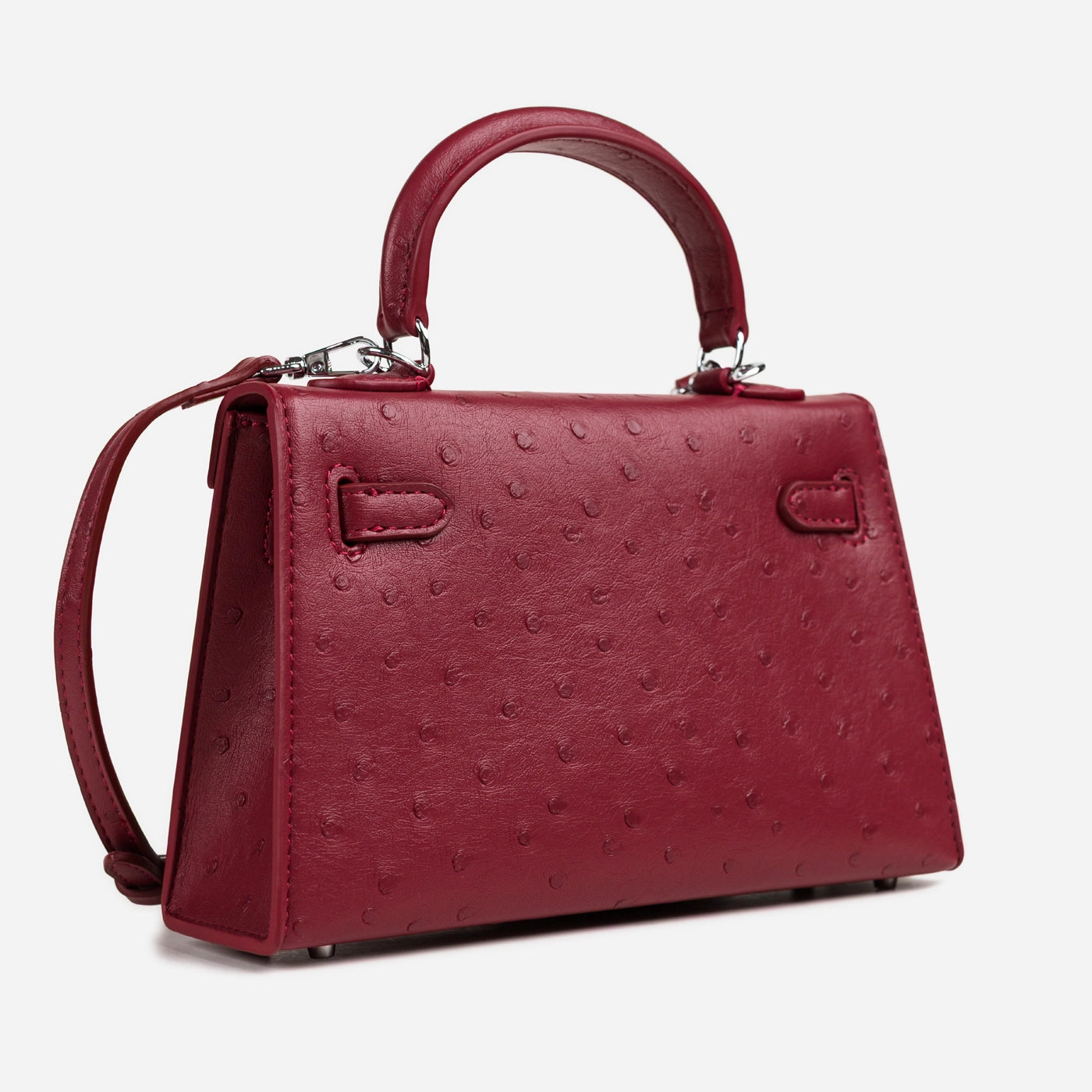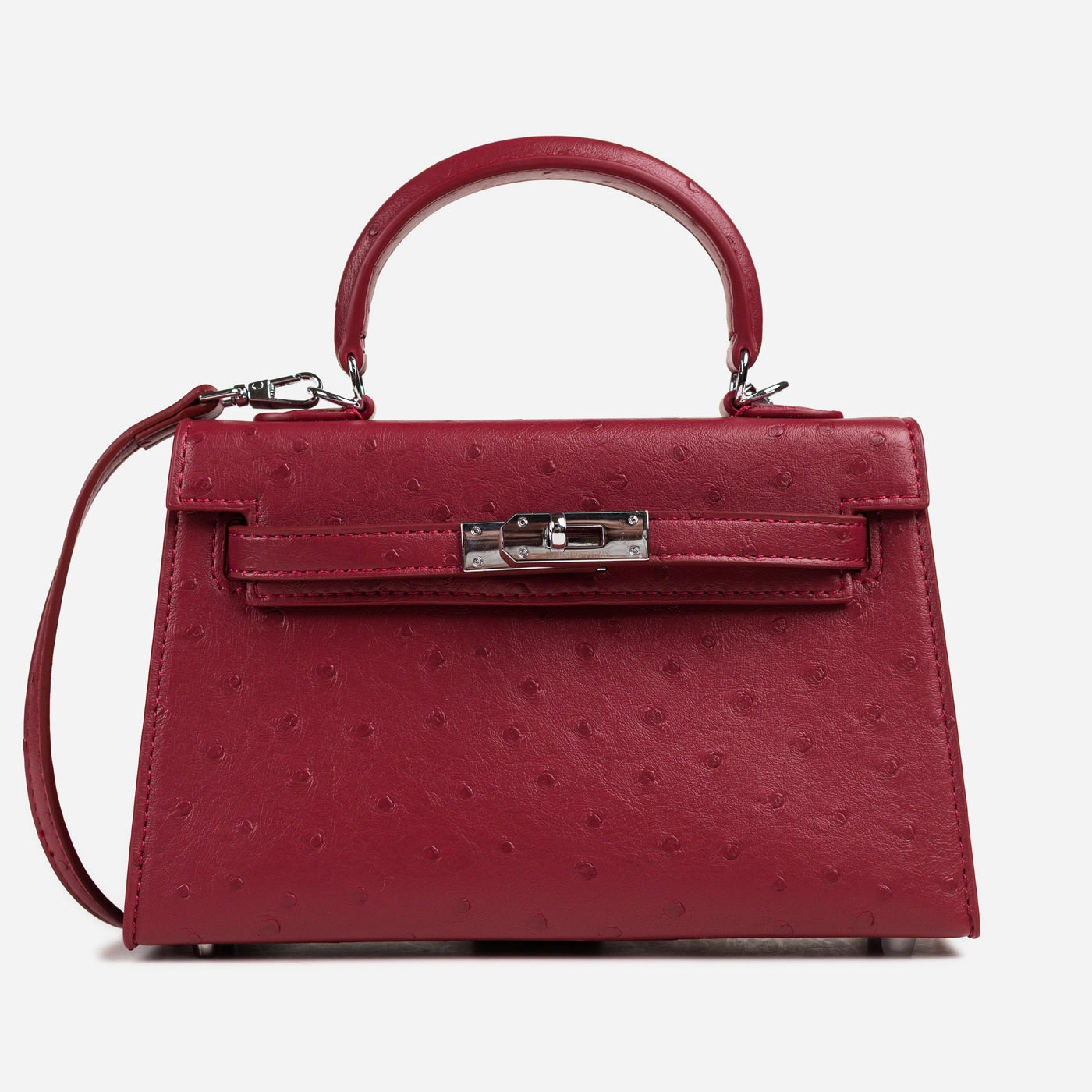 This deep red mini bag is constructed from ostrich-embossed leather with a fine, evenly distributed quill pattern across the full body, flap, and rolled top handle. A front strap runs horizontally across the flap and fastens at the centre with a silver-tone push-turn lock set into a smooth leather tab. The detachable flat crossbody strap is attached via silver D-rings at both sides, and the trapeze silhouette widens slightly from top to base, giving the bag a structured, upright form.