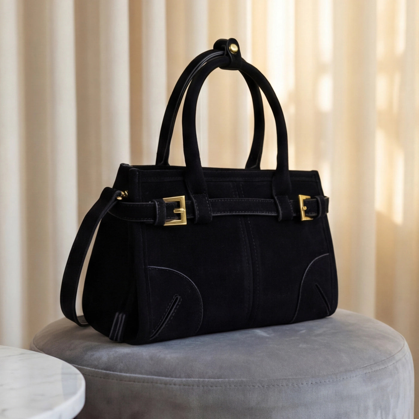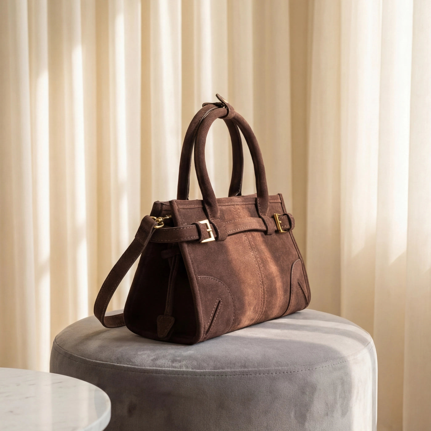 The joined dual handle loop sits comfortably in the hand or over the wrist, with the rolled suede surface softening naturally at the curve during carry. A detachable flat crossbody strap provides an alternative carry option, adjustable to shoulder or crossbody length via the slider buckle at the strap midpoint. The structured body accommodates daily essentials, a phone, and a small tablet, with the firm base and side panels maintaining the silhouette throughout the day.