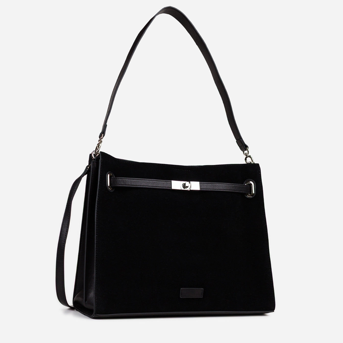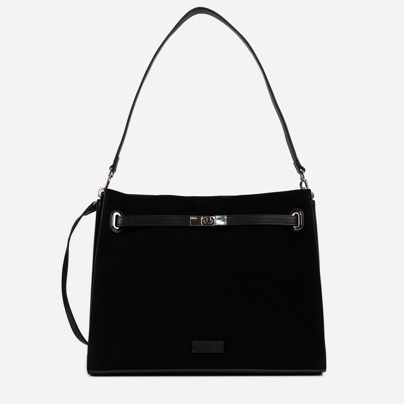 This sophisticated shoulder bag features premium black suede with a soft, velvety finish. The signature turn lock closure with polished silver hardware creates an elegant focal point, while the structured silhouette maintains refined form. A single adjustable shoulder strap ensures comfortable wear. Perfect for professional settings, evening events, and occasions that call for understated luxury with tactile elegance.