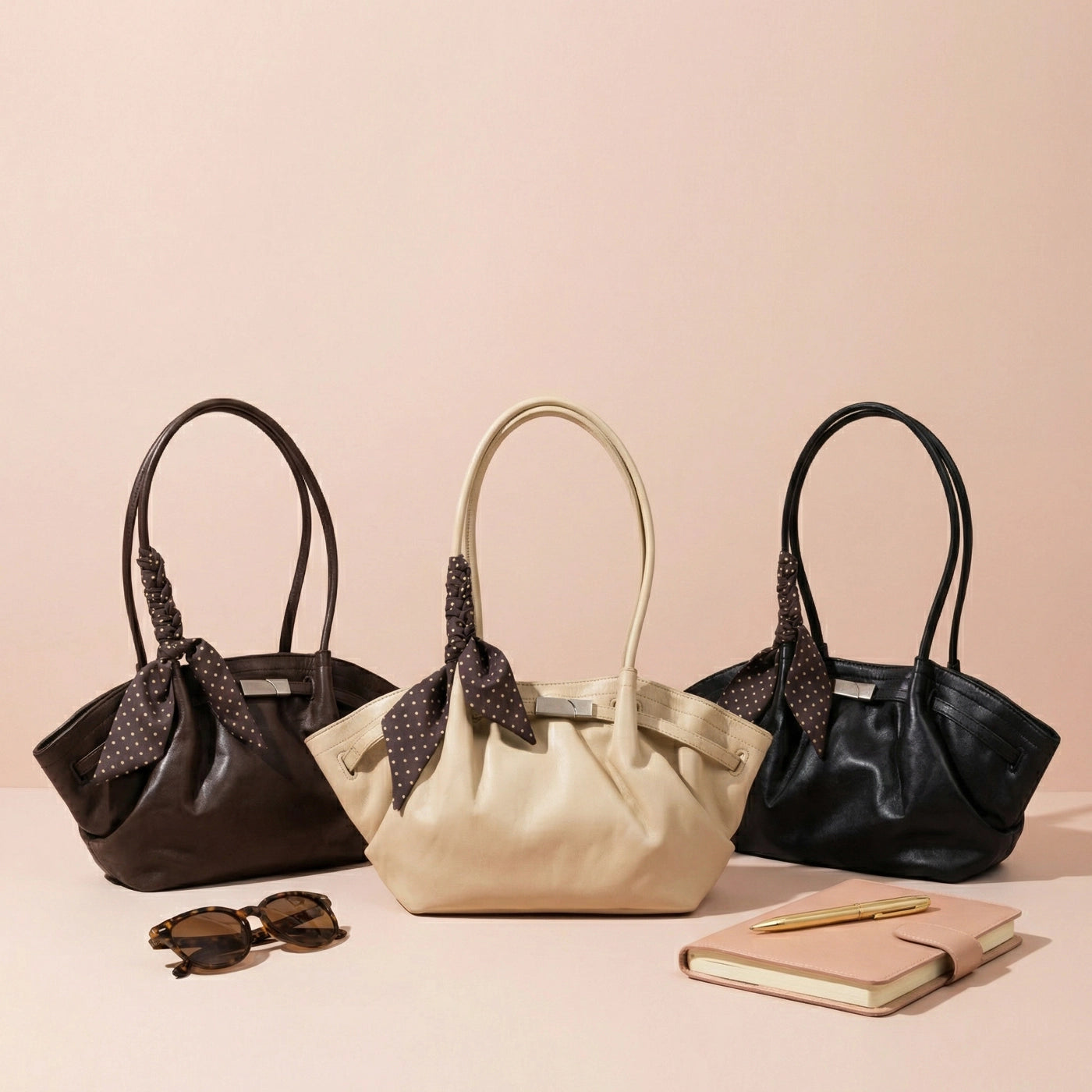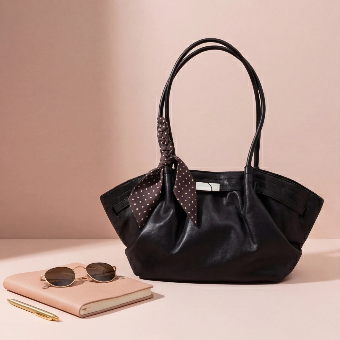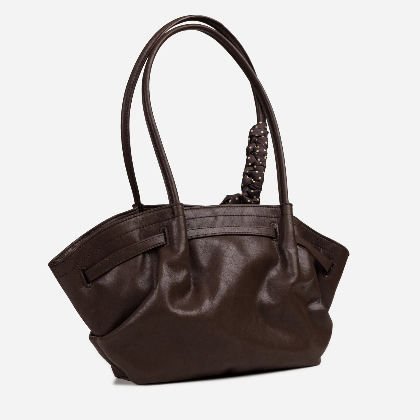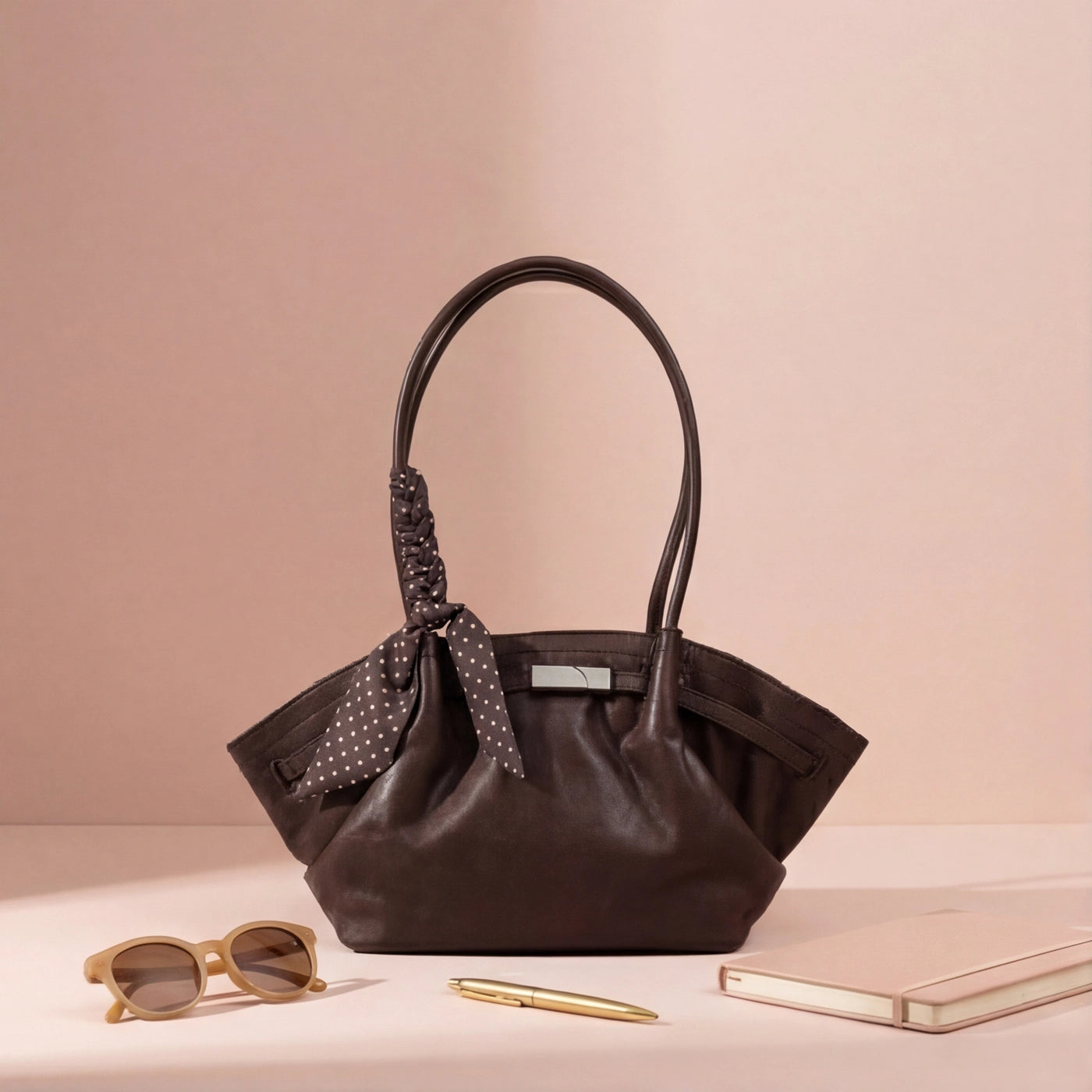 The two long flat handles sit comfortably on the shoulder, with the soft lambskin surface and the low-hanging silhouette making the bag easy to carry for extended periods. The wide ruched body accommodates a phone, wallet, keys, a small notebook, and daily essentials, with the soft leather expanding naturally as contents are added. The gathered surface and scarf detail make this bag suited for casual outings, modest everyday dressing, and relaxed weekend wear.