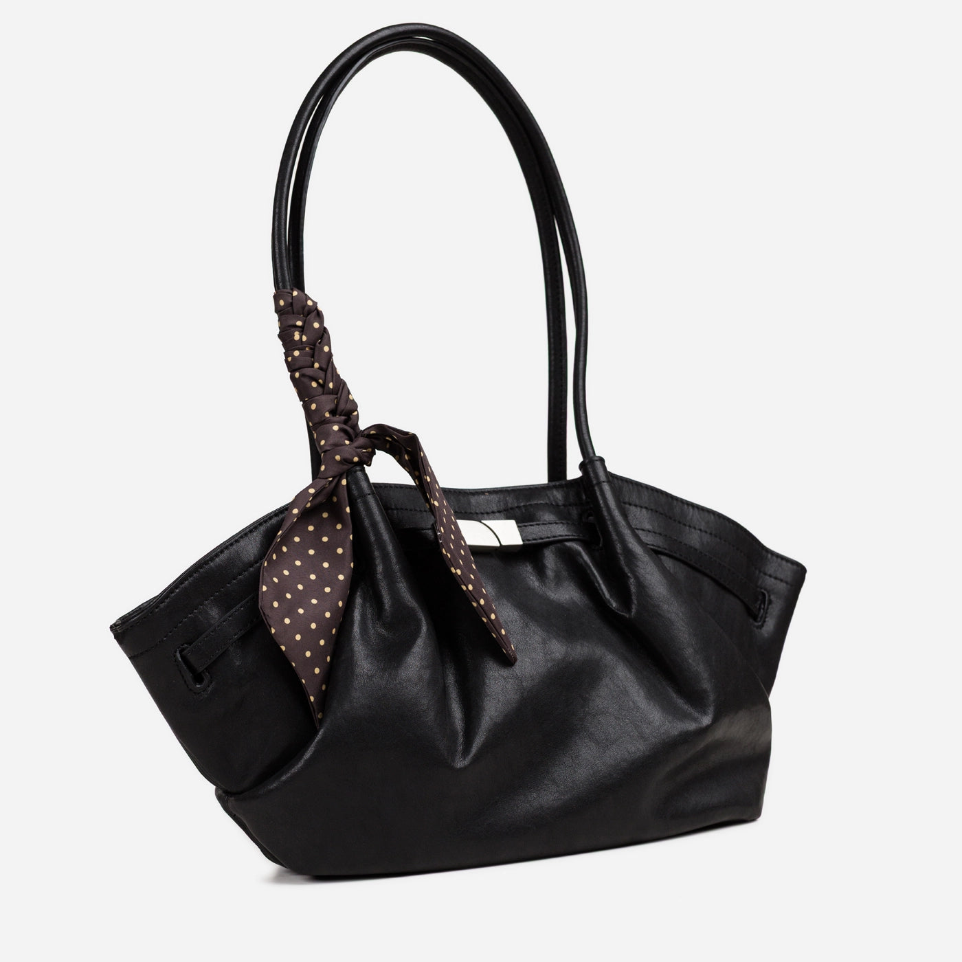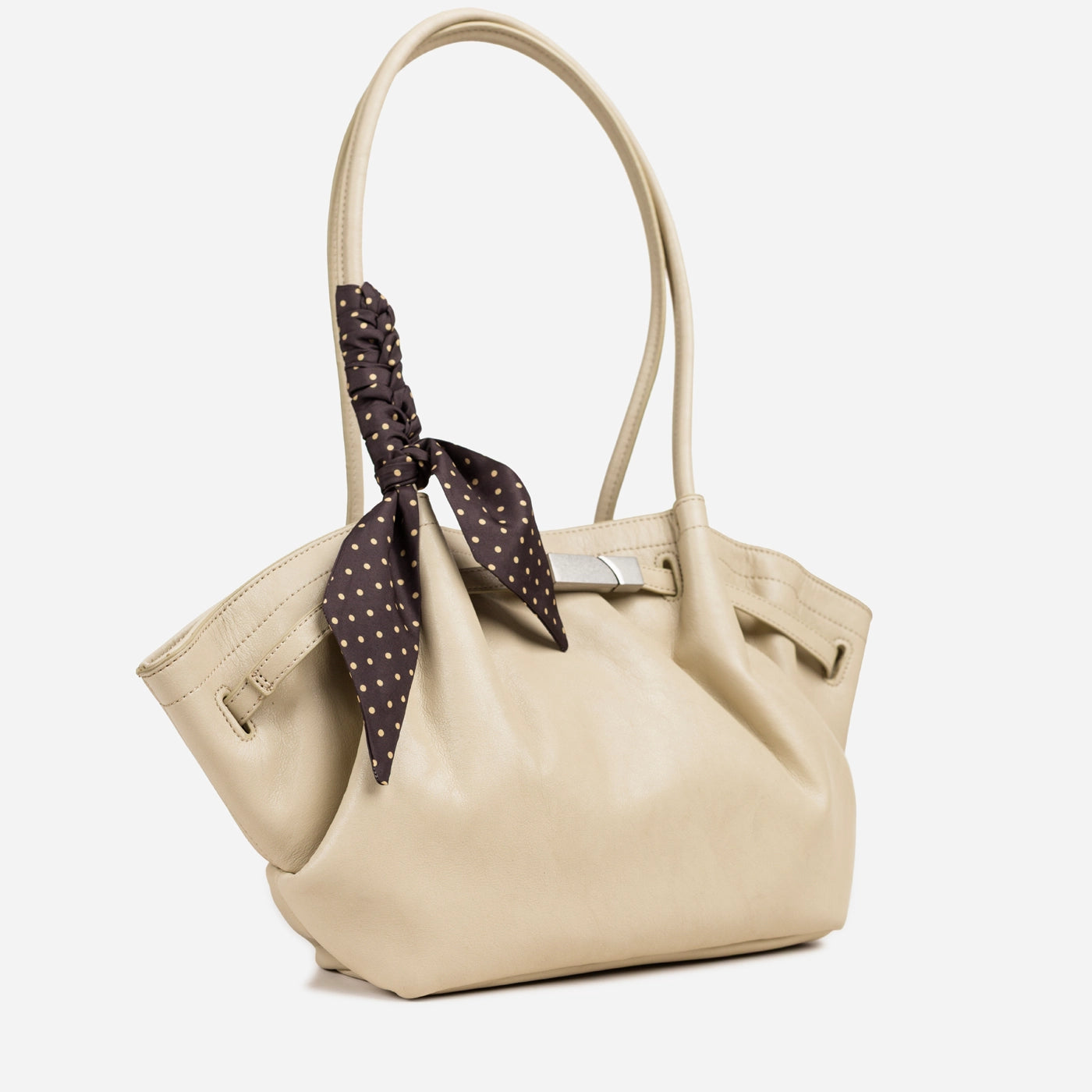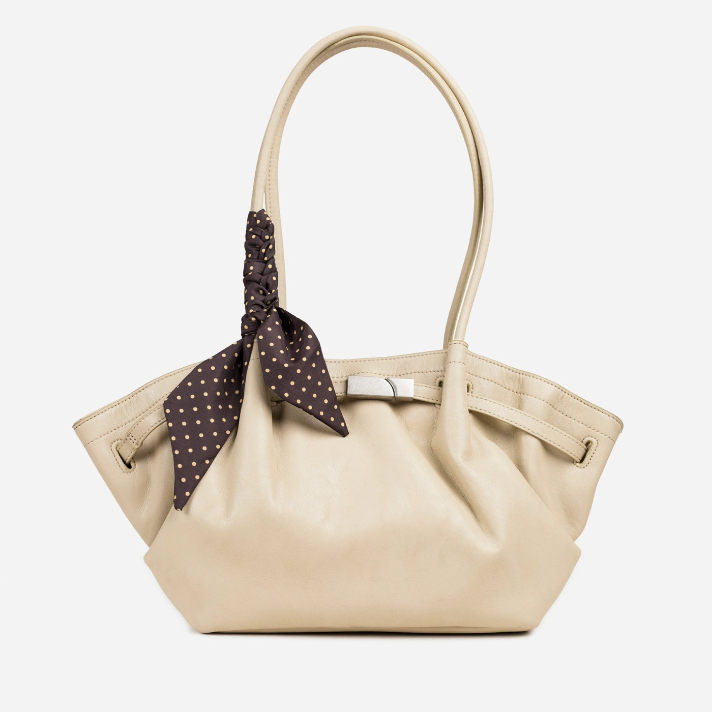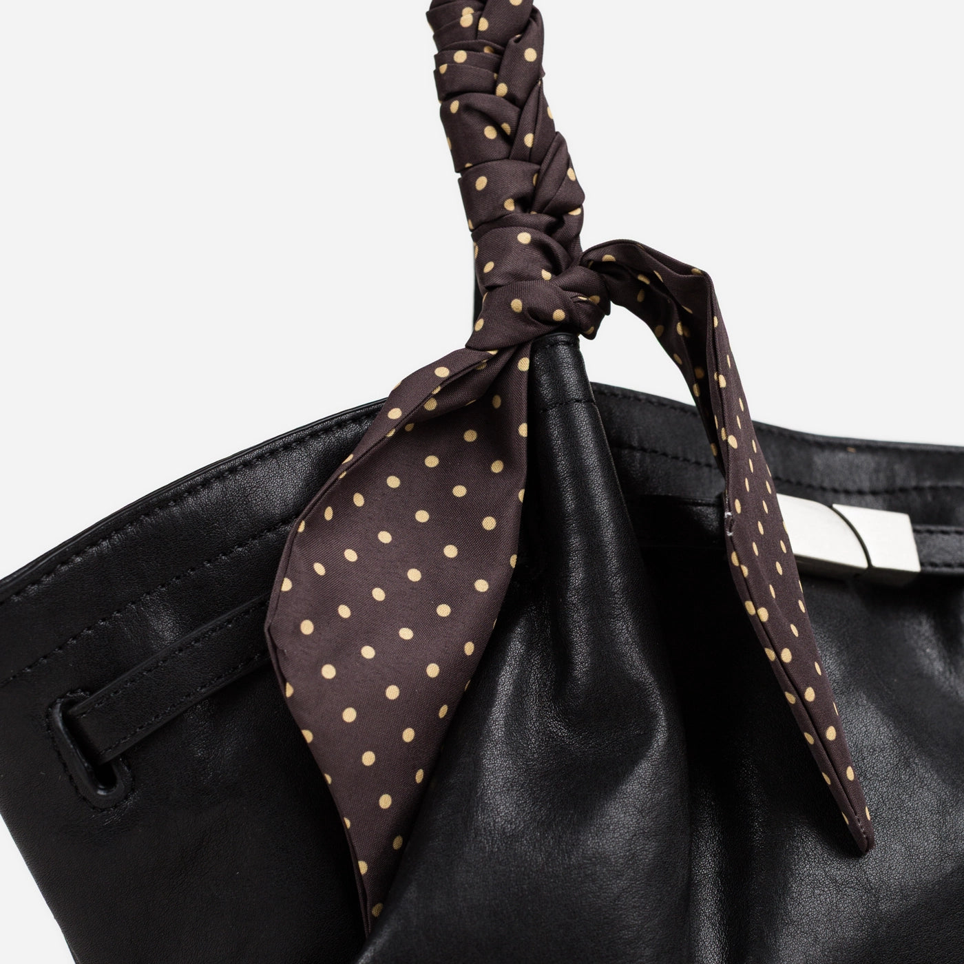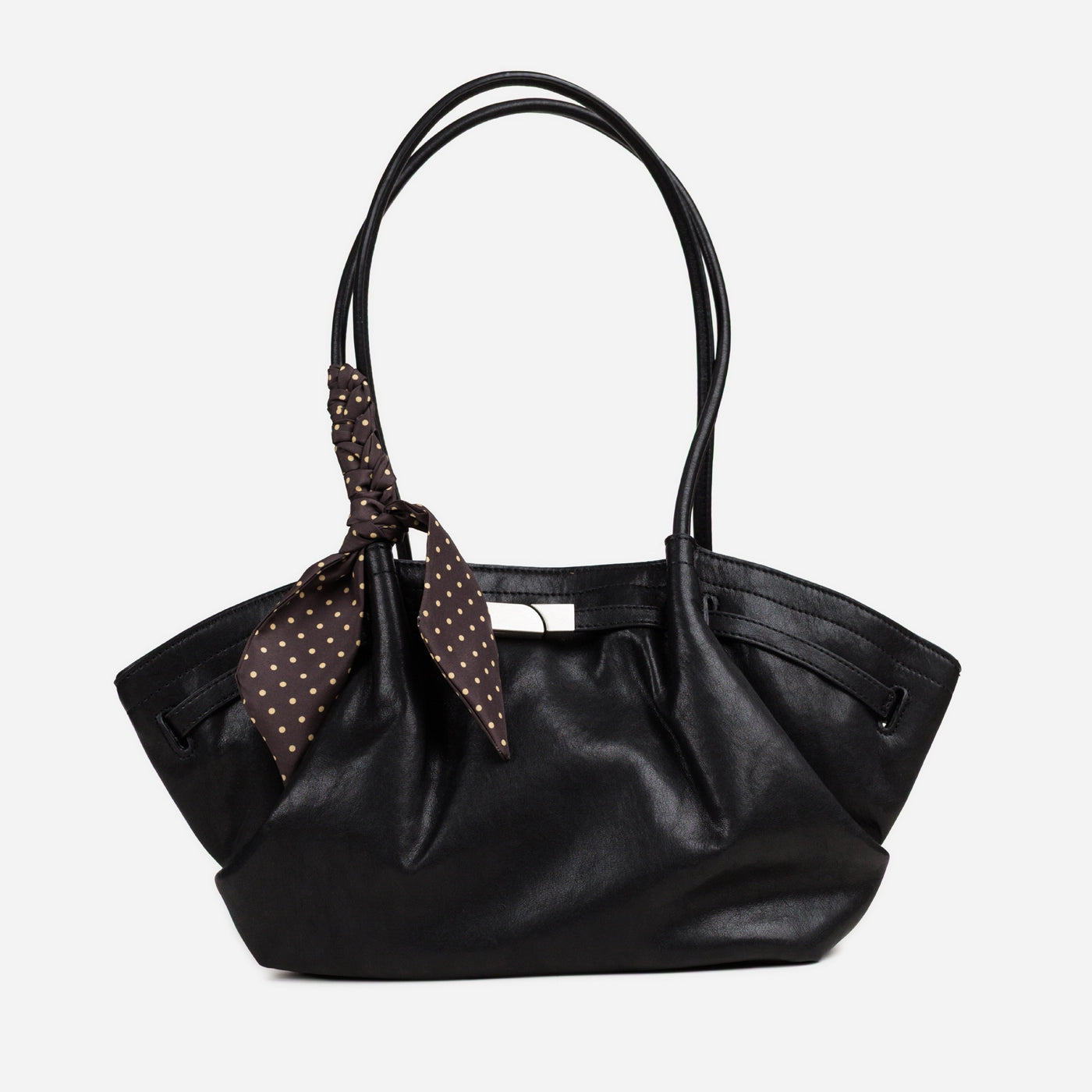 The bag closes via a horizontal silver-tone bar clasp set into a leather tab at the upper centre front, with the bar sliding through a rectangular keeper loop to secure the top of the bag. A polka dot silk scarf in a dark ground with white dot print is tied in a loose bow at the base of the left handle, with the trailing ends falling freely against the front body of the bag. The silver bar clasp is the only hardware on the exterior, keeping the overall aesthetic clean and minimal against the soft ruched leather surface.