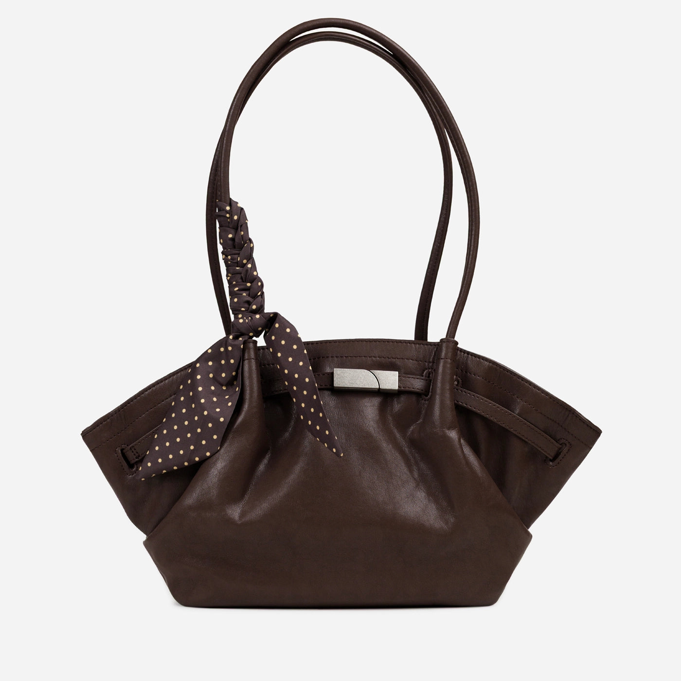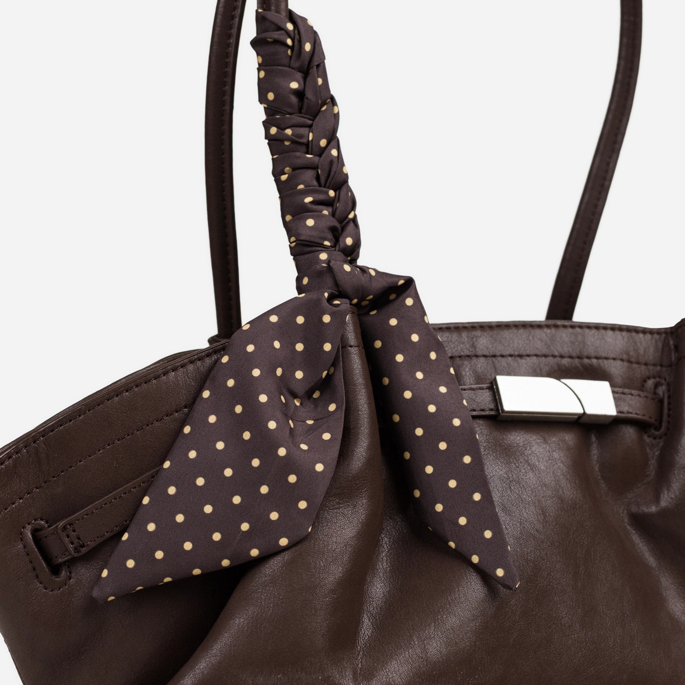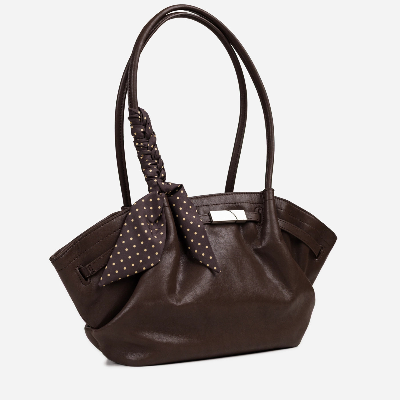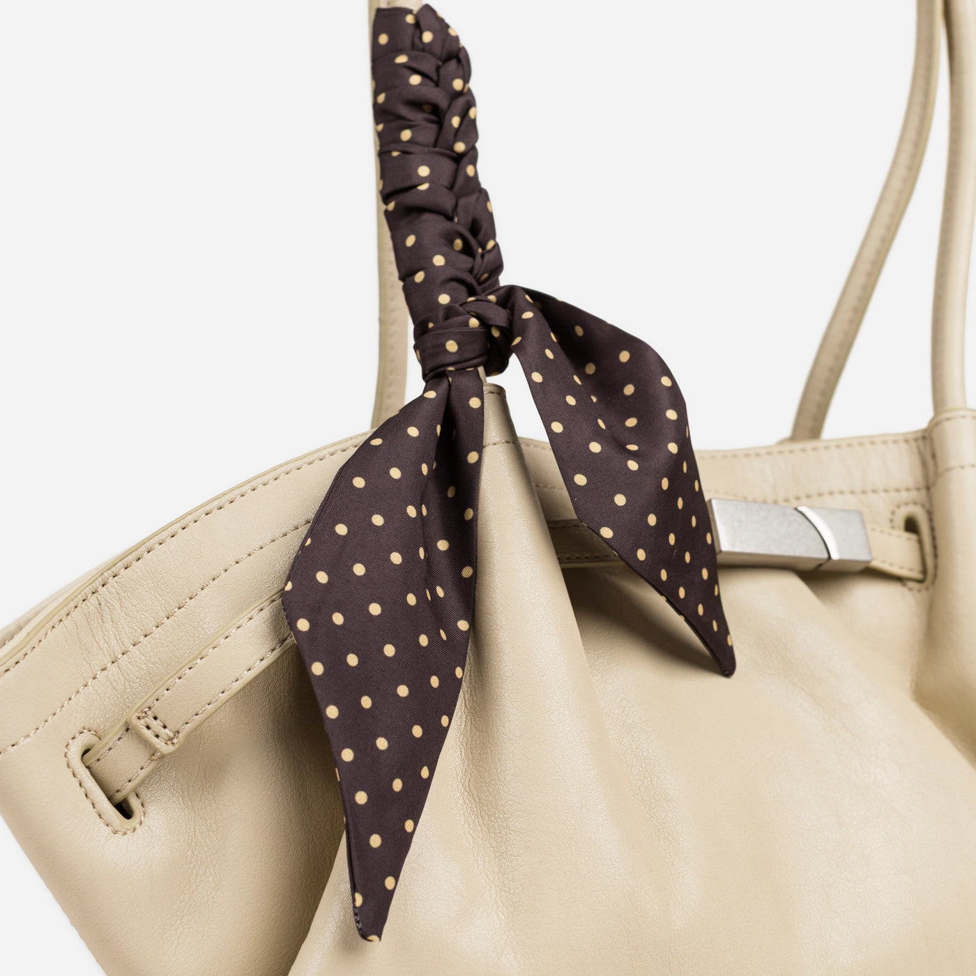 The bag closes via a horizontal silver-tone bar clasp set into a leather tab at the upper centre front, with the bar sliding through a rectangular keeper loop to secure the top of the bag. A polka dot silk scarf in a dark ground with white dot print is tied in a loose bow at the base of the left handle, with the trailing ends falling freely against the front body of the bag. The silver bar clasp is the only hardware on the exterior, keeping the overall aesthetic clean and minimal against the soft ruched leather surface.