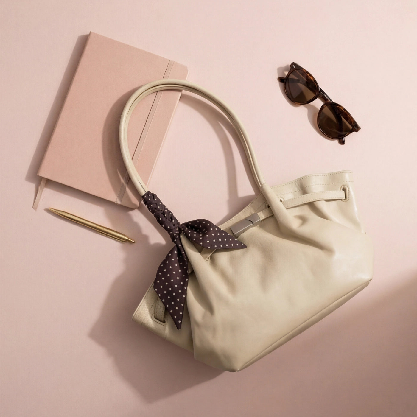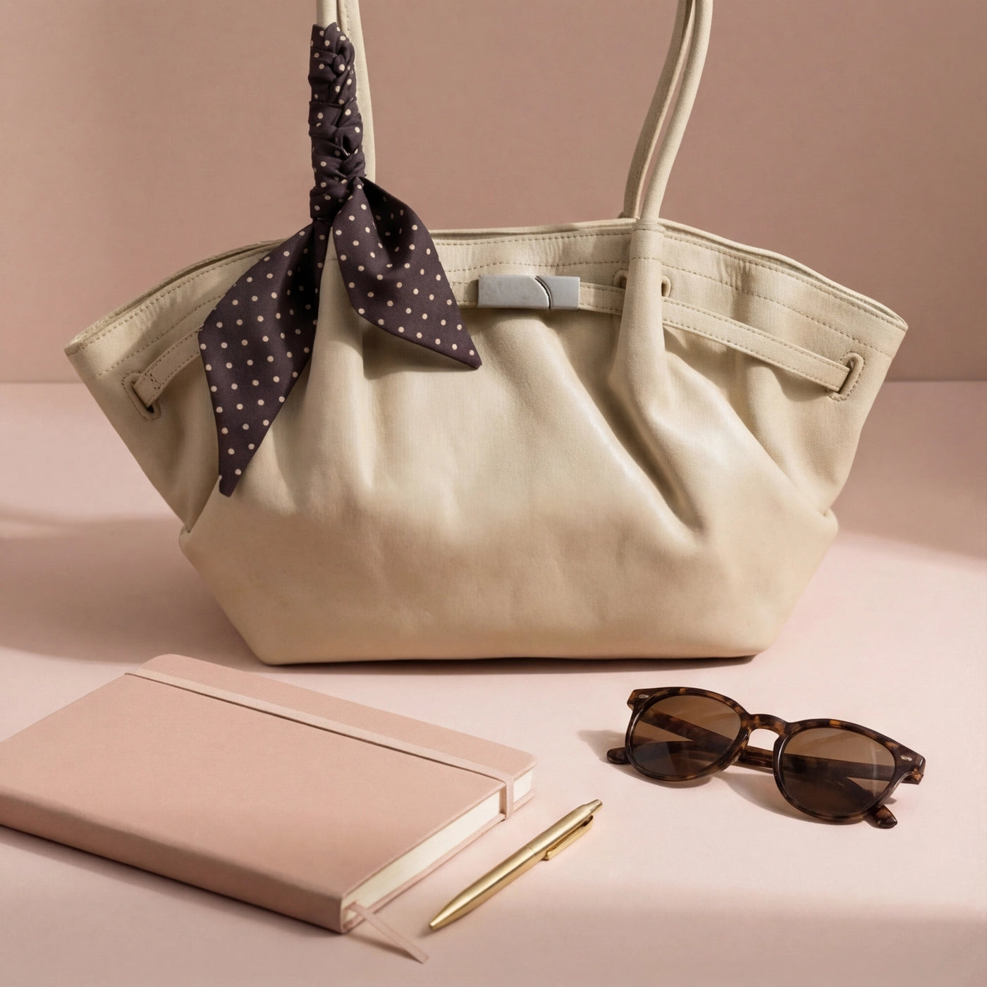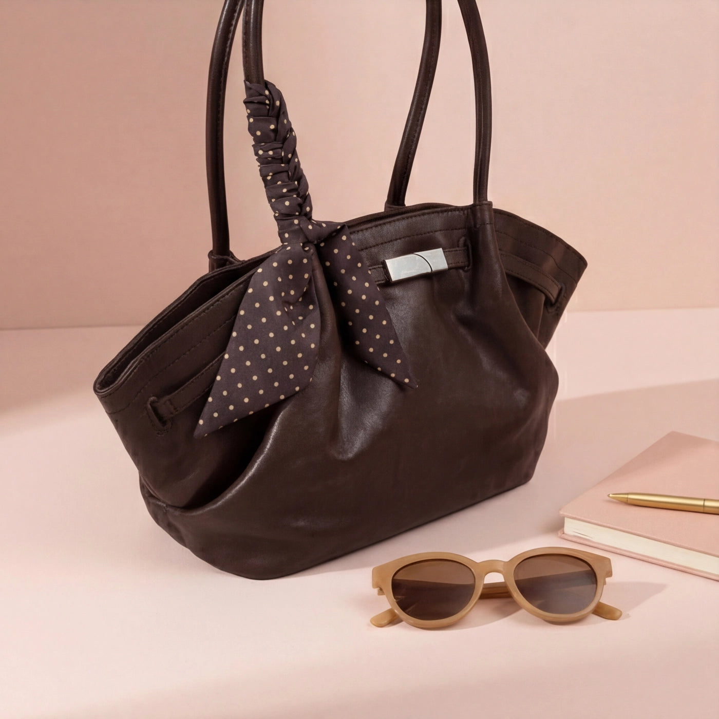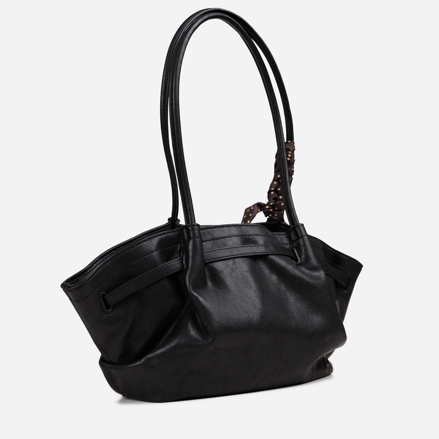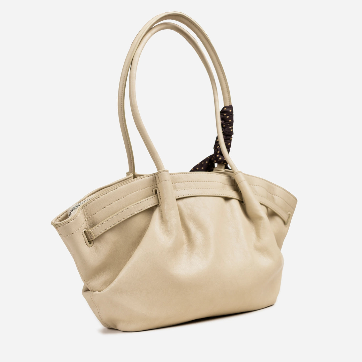 The bag closes via a horizontal silver-tone bar clasp set into a leather tab at the upper centre front, with the bar sliding through a rectangular keeper loop to secure the top of the bag. A polka dot silk scarf in a dark ground with white dot print is tied in a loose bow at the base of the left handle, with the trailing ends falling freely against the front body of the bag. The silver bar clasp is the only hardware on the exterior, keeping the overall aesthetic clean and minimal against the soft ruched leather surface.