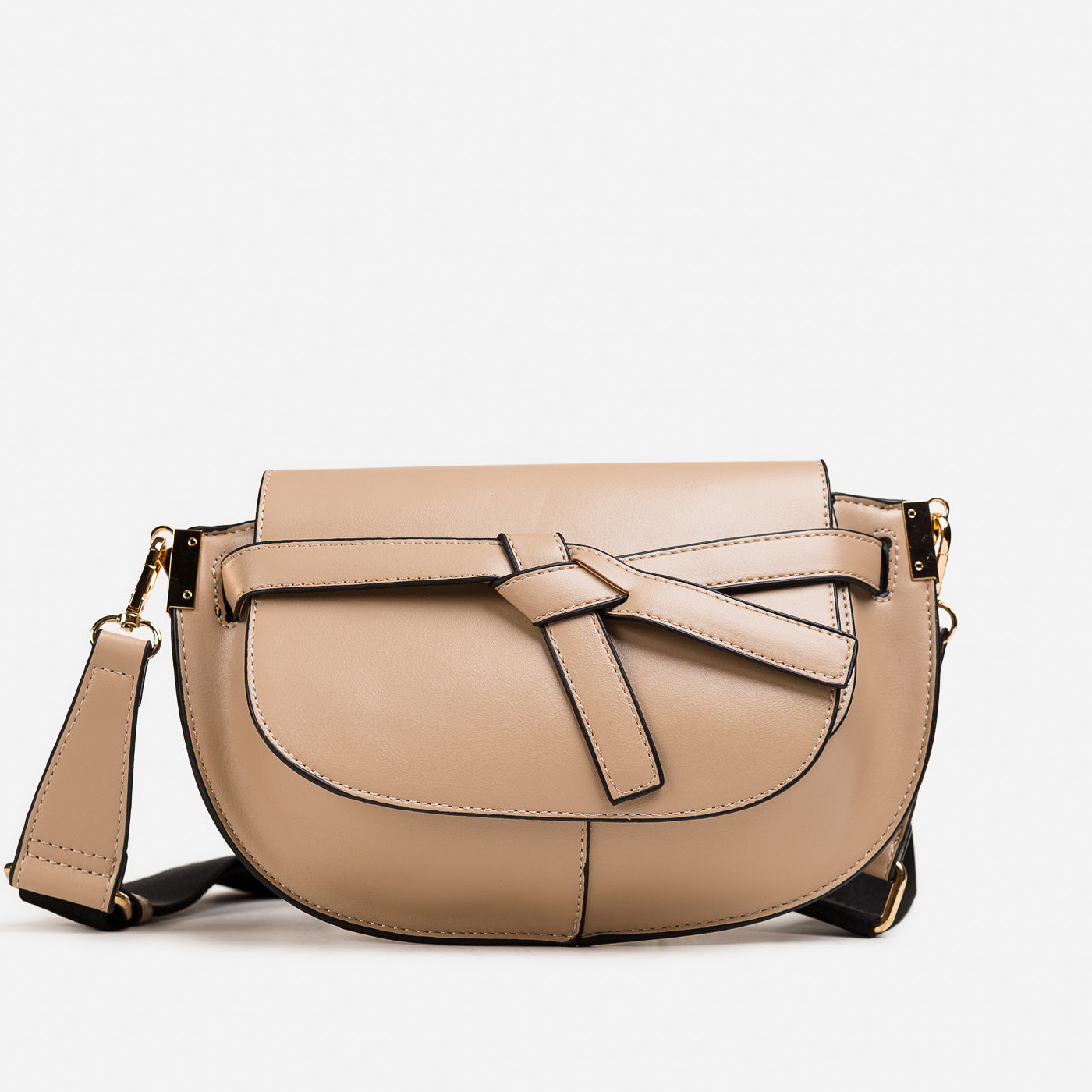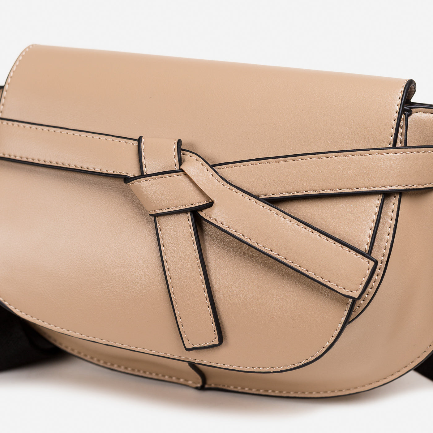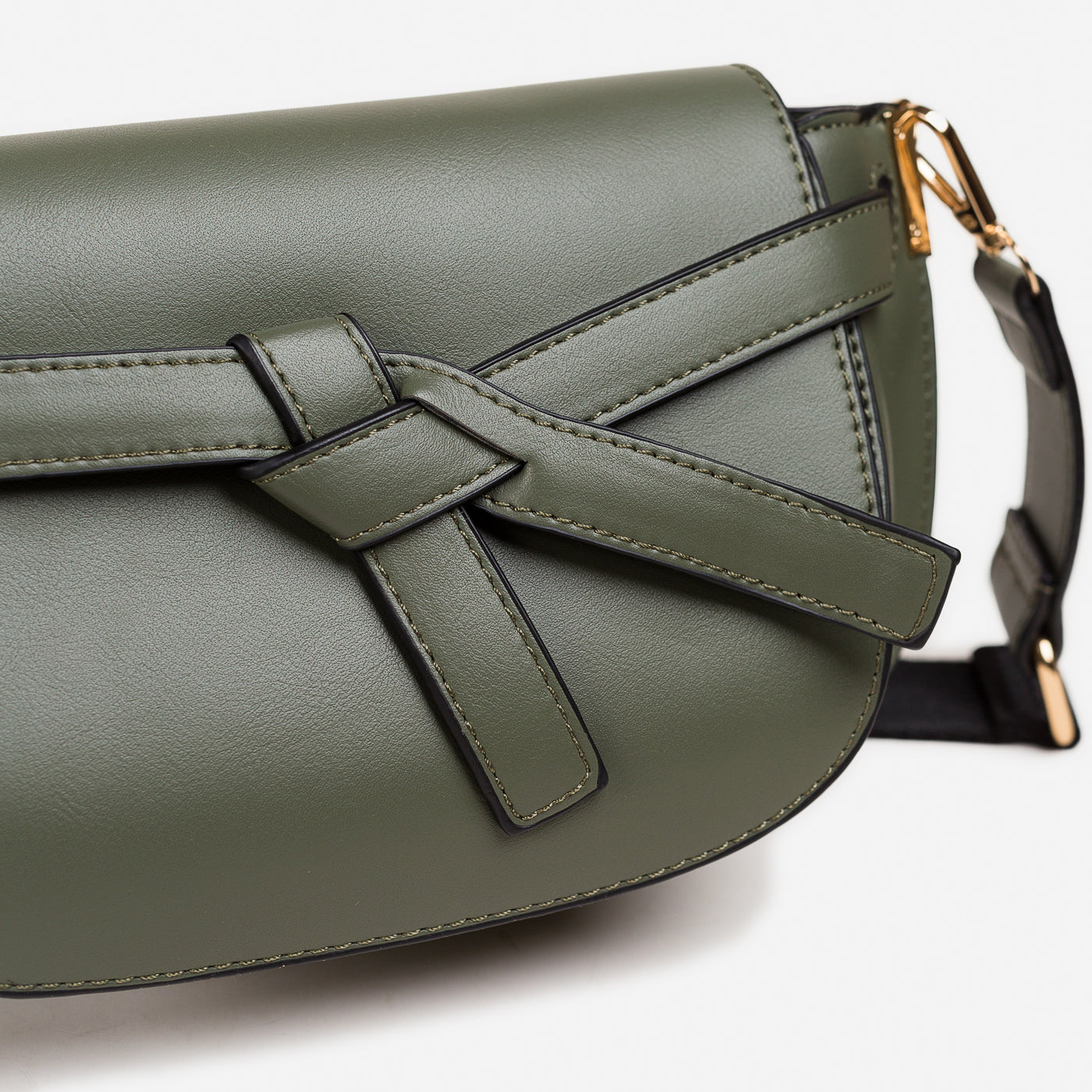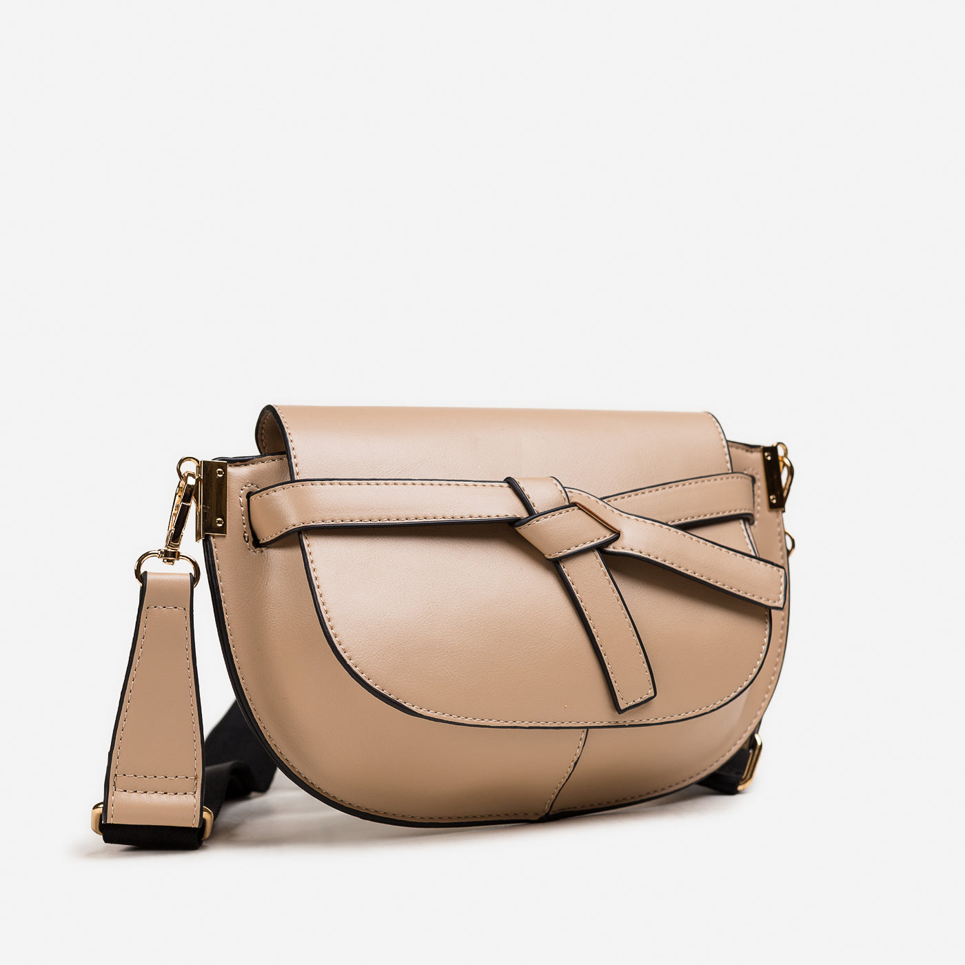 The Adoro Knot Luxe saddle bag brings a modern twist to classic elegance. Crafted from premium smooth synthetic material, it features a distinctive knotted strap detail on the flap, adding a refined yet playful edge. The curved silhouette sits comfortably at your side, while the spacious interior and soft lining ensure practical storage. Designed with a detachable adjustable strap, it can be worn crossbody or on the shoulder for versatile styling. Perfect for both everyday wear and chic outings, it’s a statement of effortless sophistication.