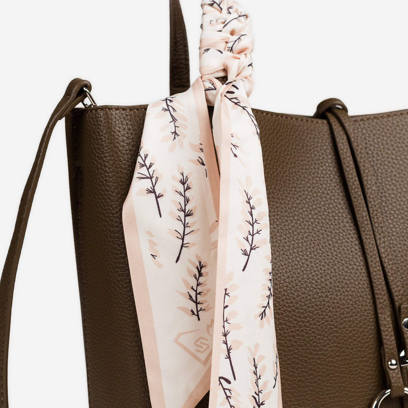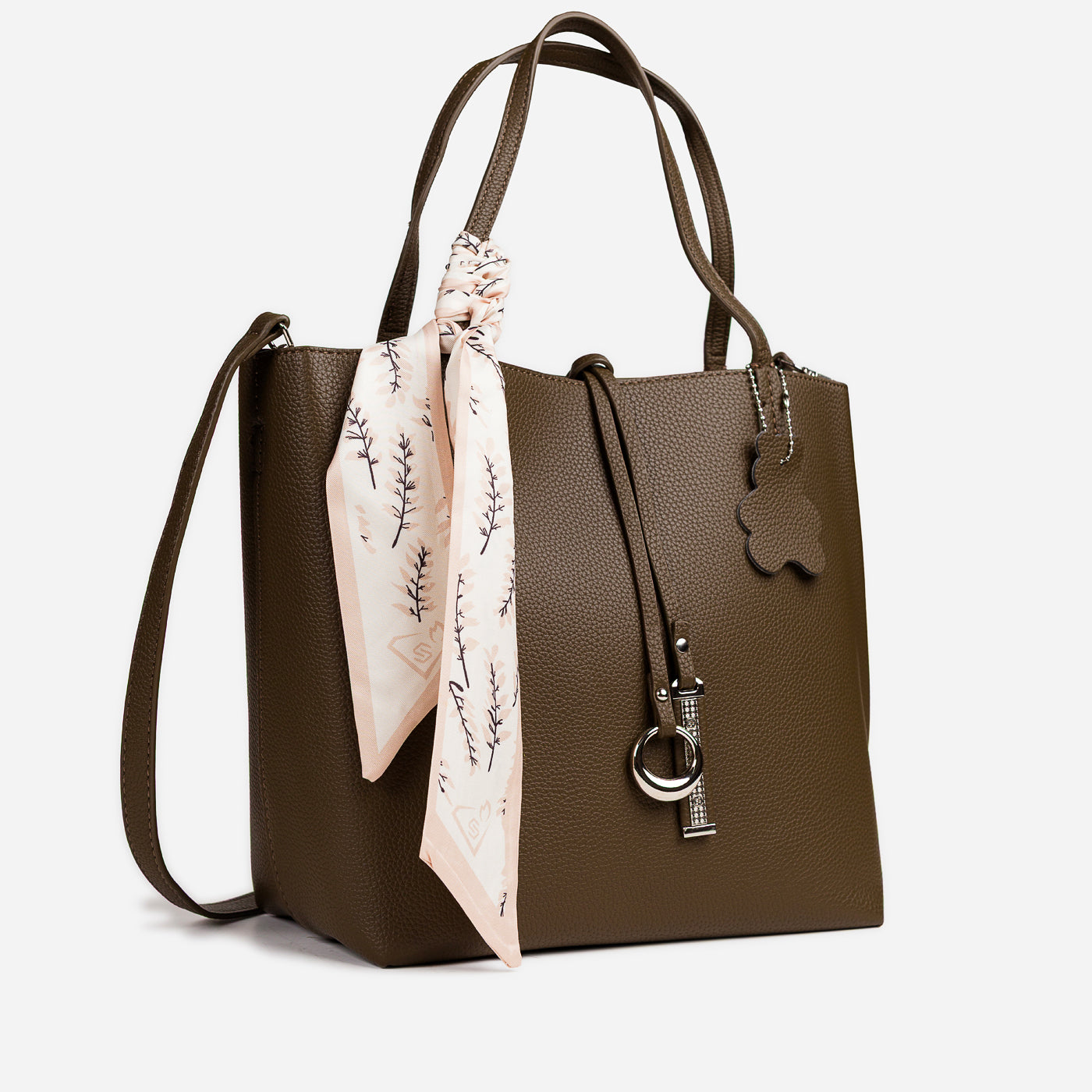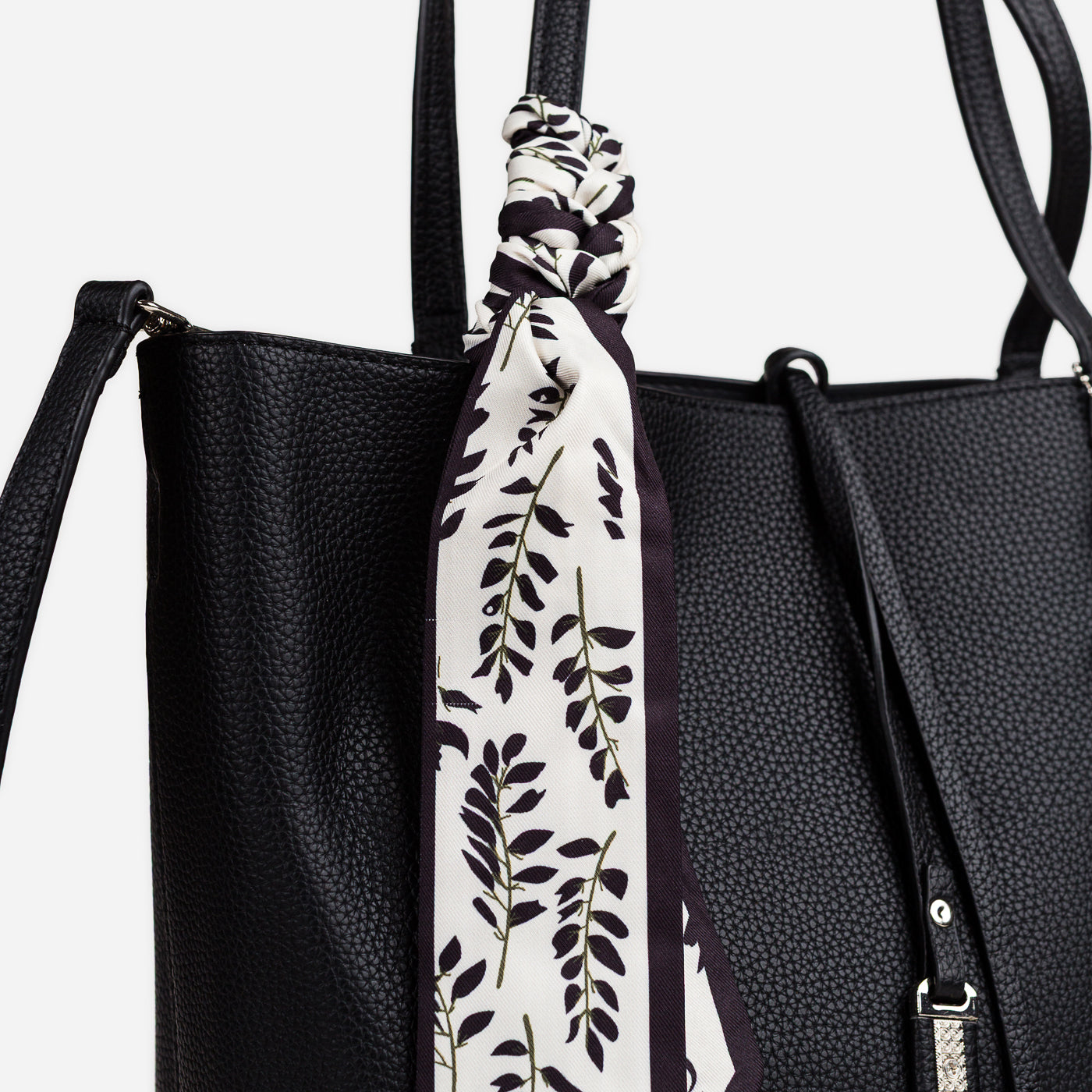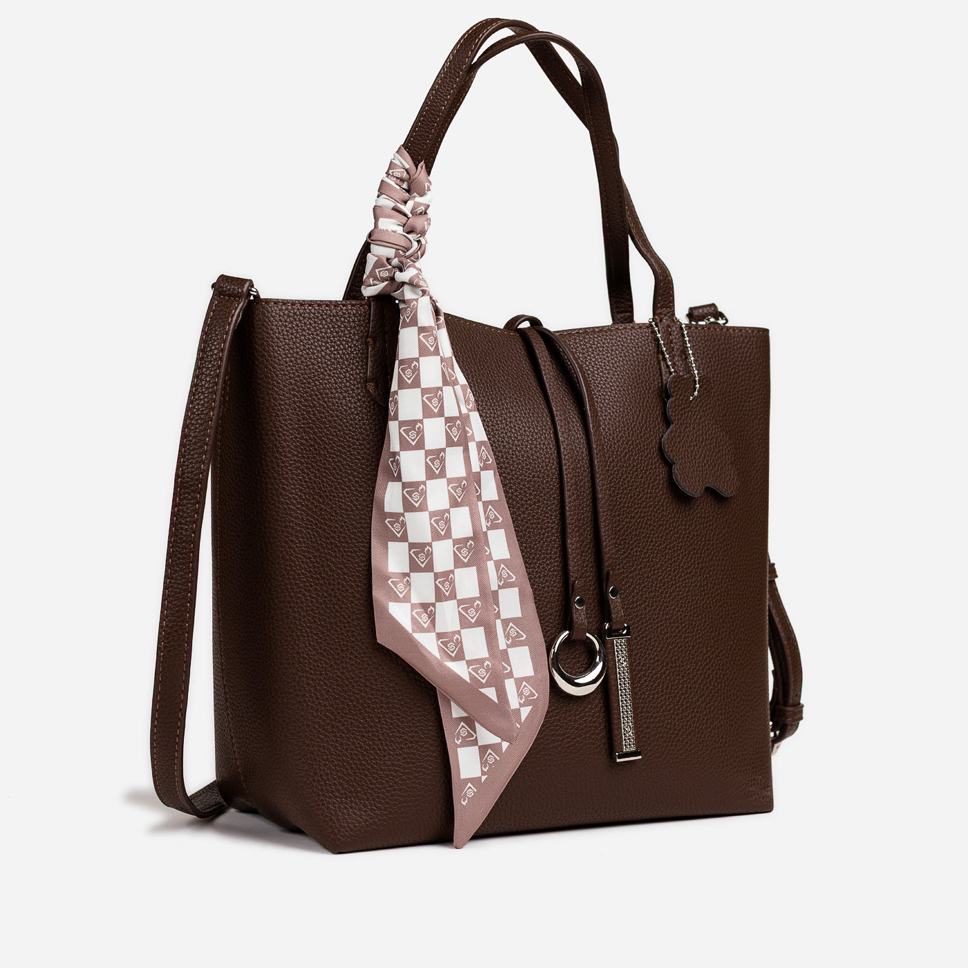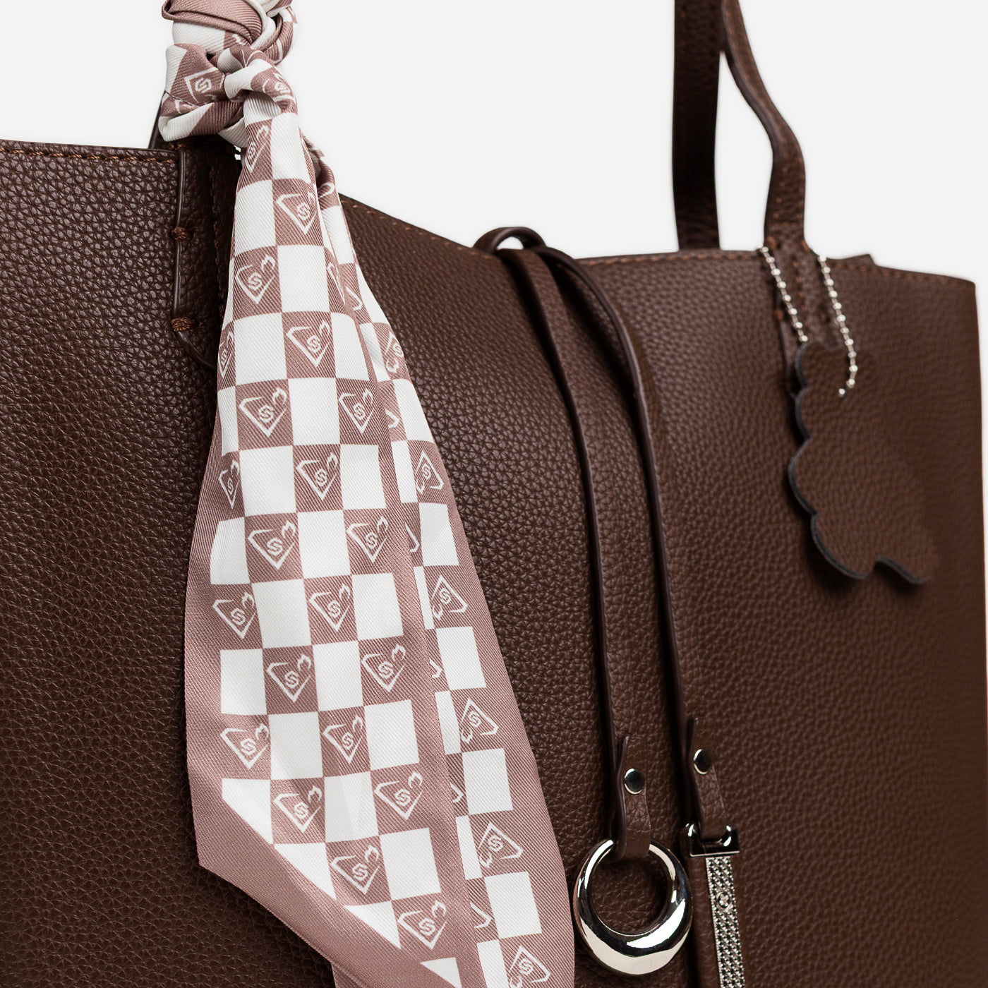 Timeless and effortlessly stylish, this tote is designed for everyday sophistication. Featuring a structured silhouette with a rich textured finish, it’s accented by elegant scarf detailing and subtle metallic charms that add character without overwhelming the look. Spacious and versatile, it’s the perfect companion for workdays, errands, or casual outings.