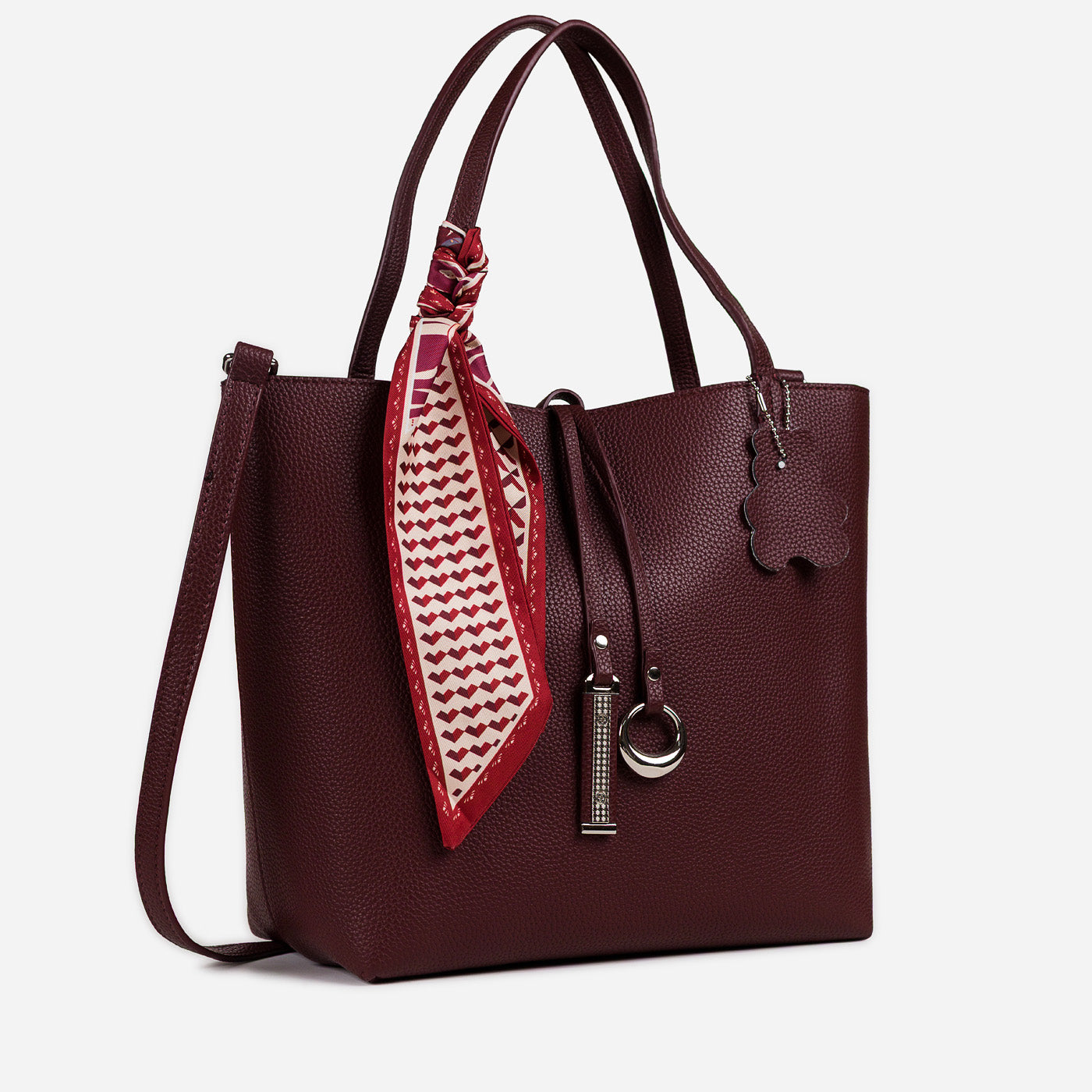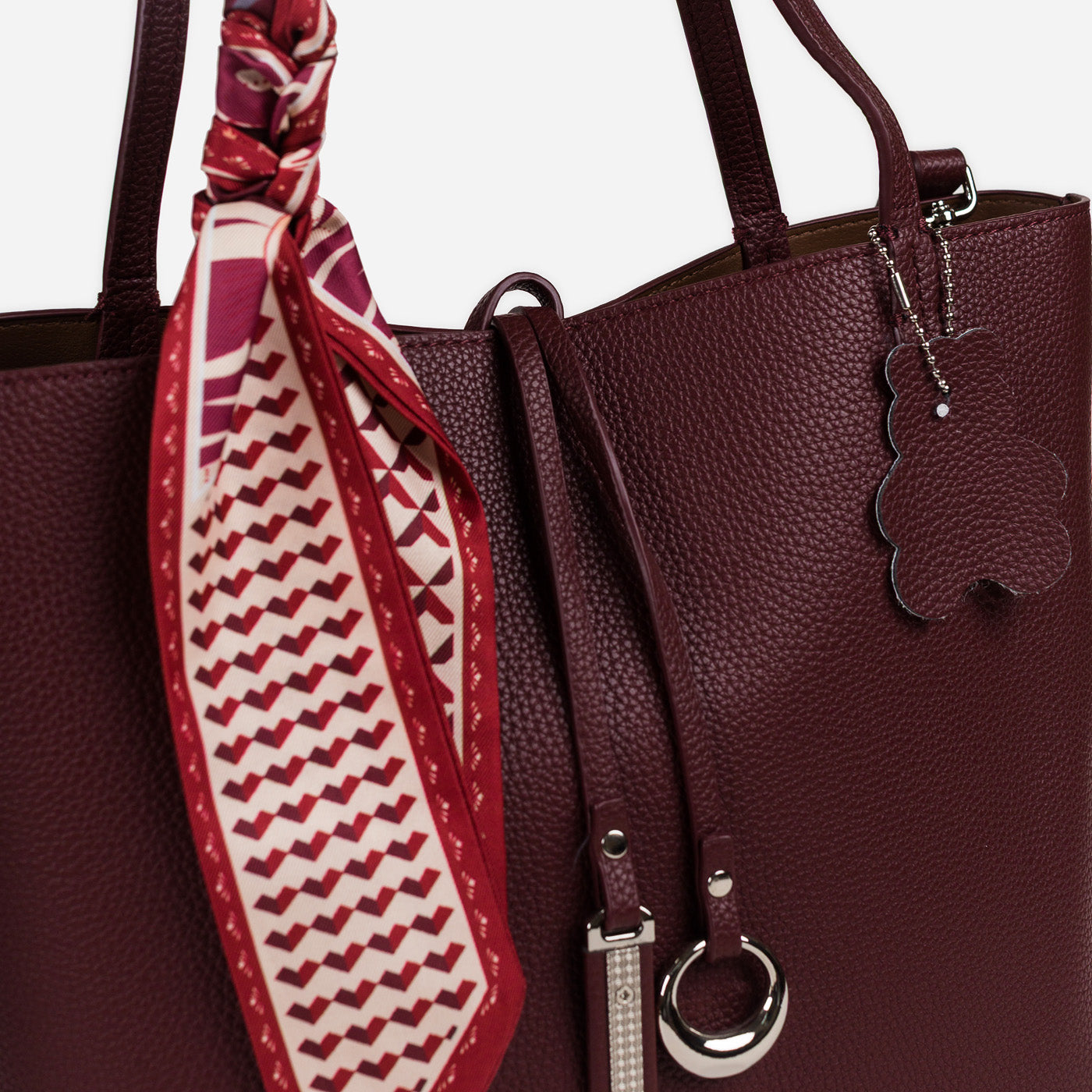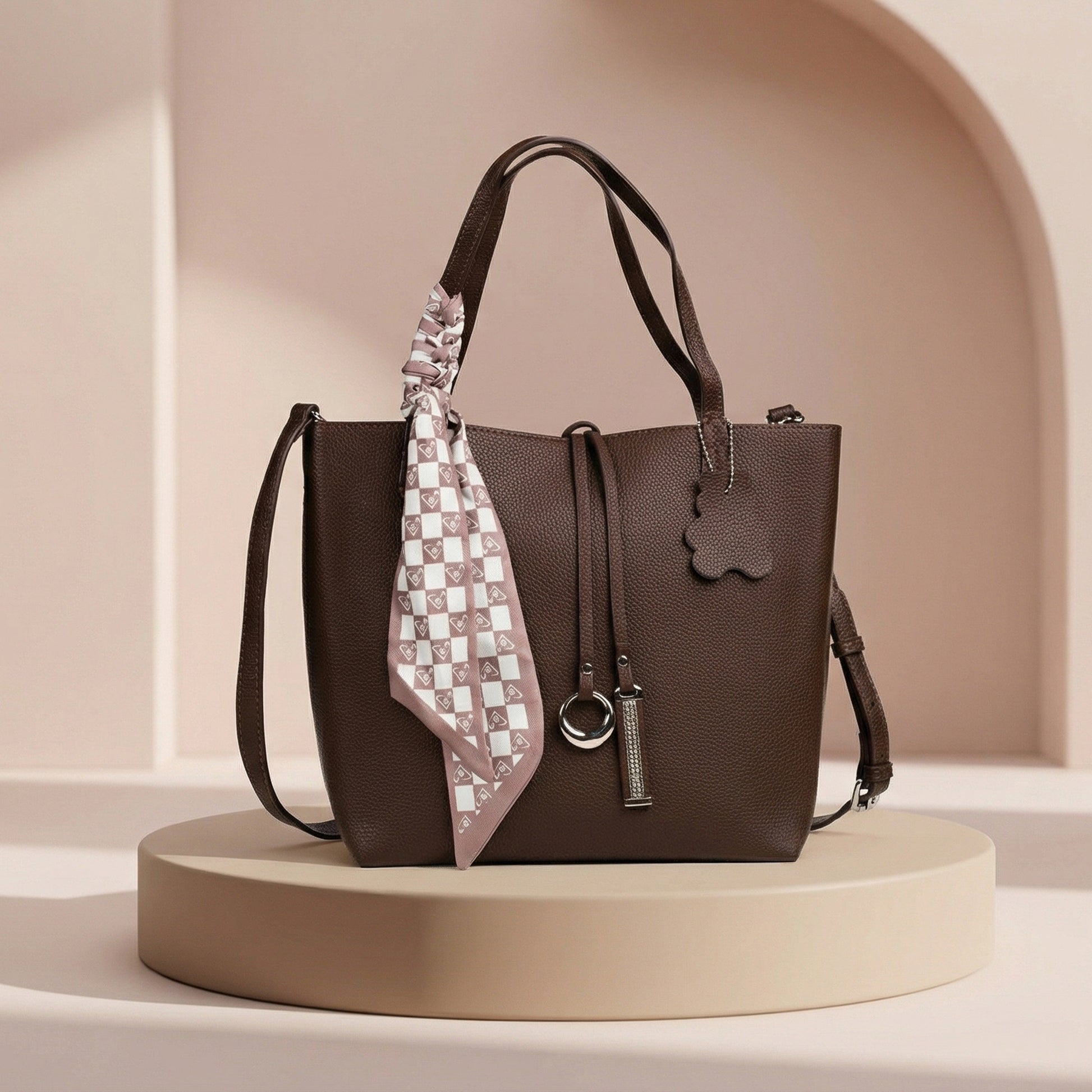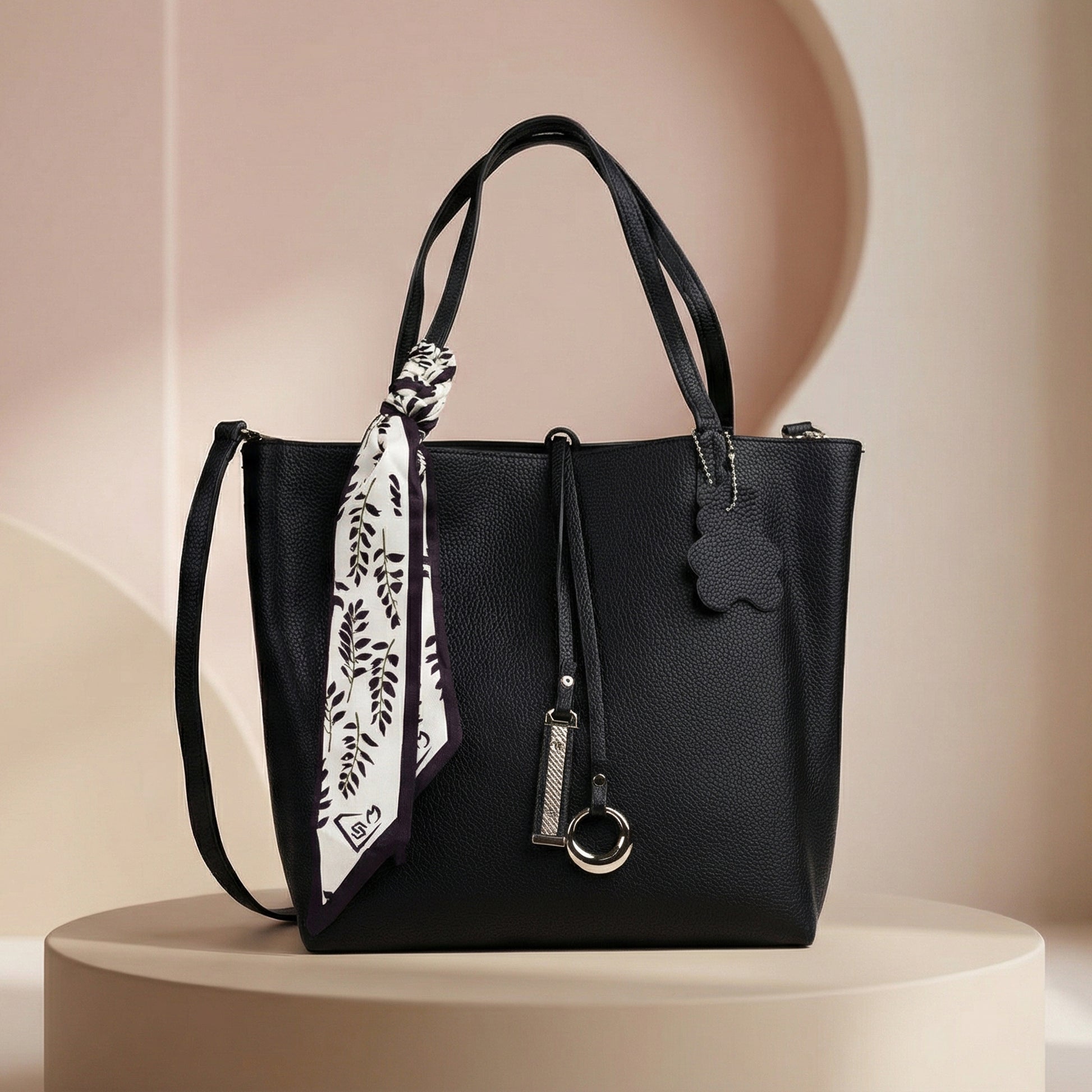 - Design: Structured tote with scarf accent and metallic charm details