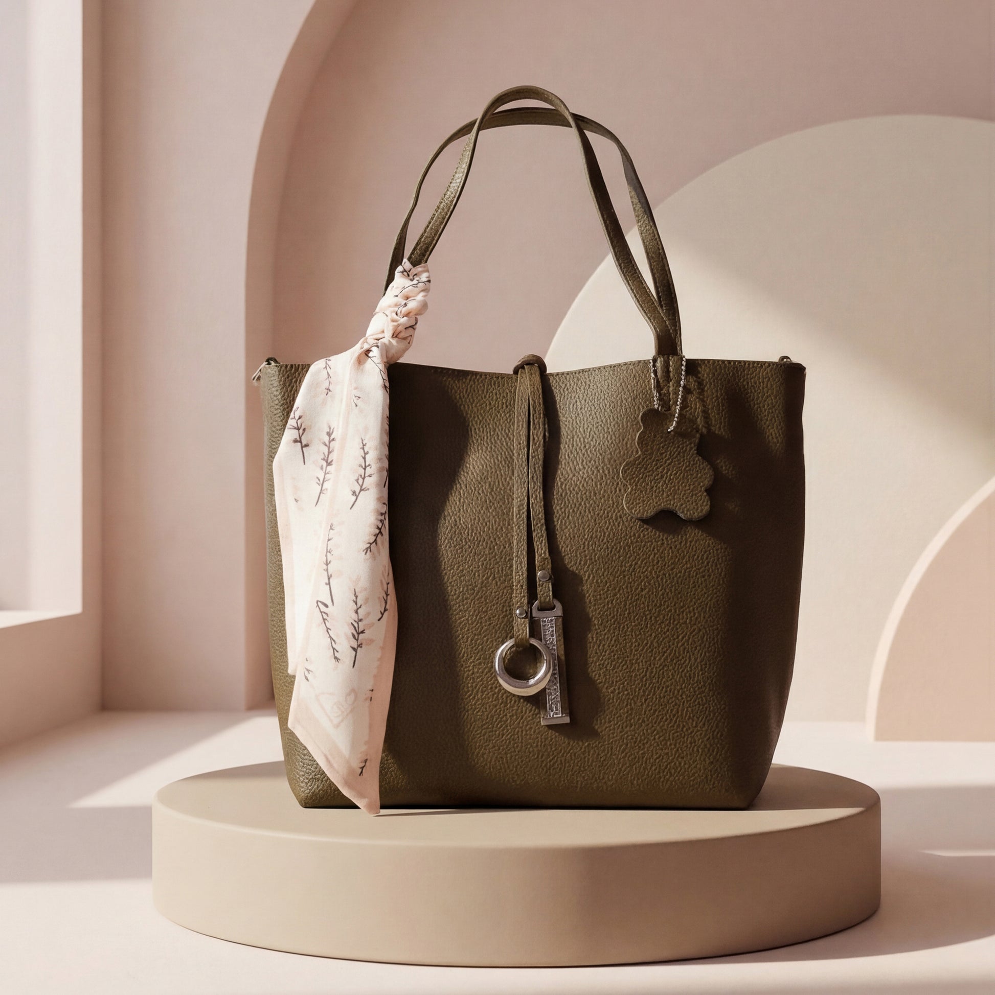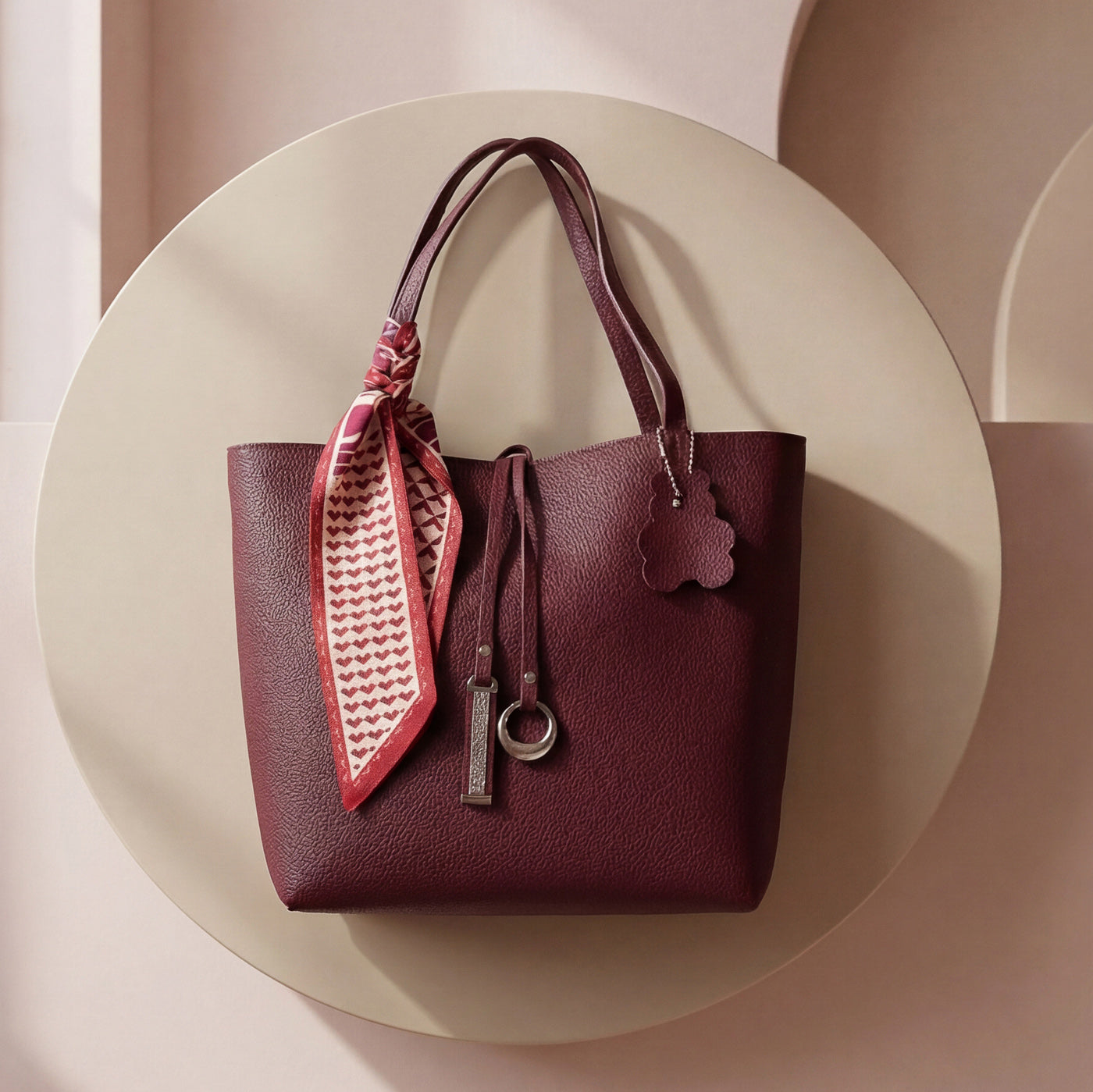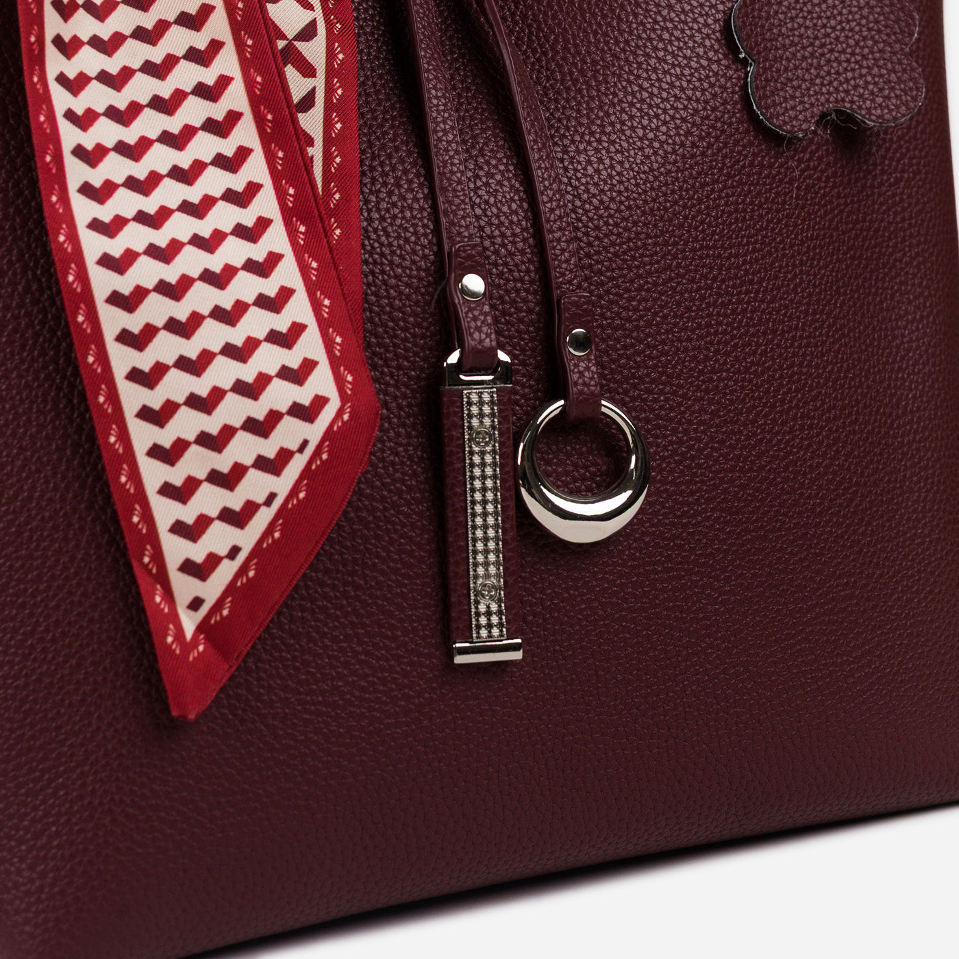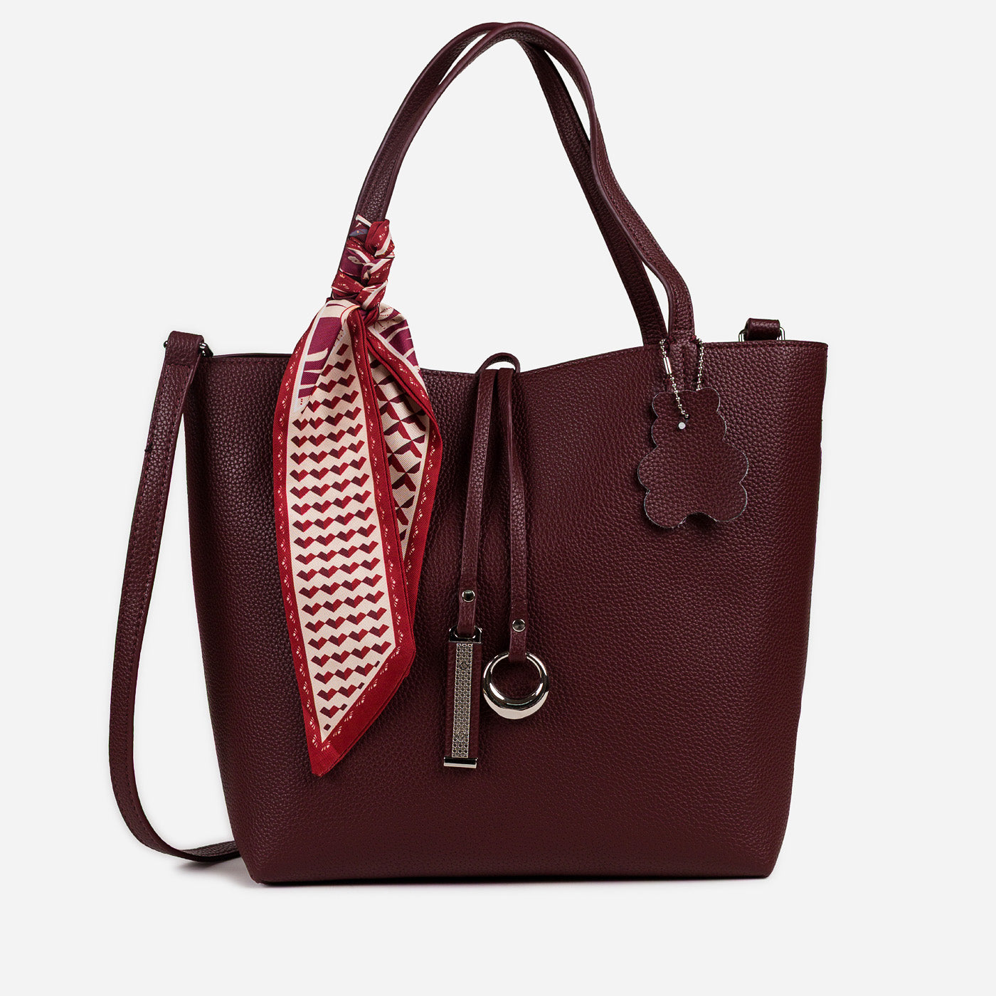 - Design: Structured tote with scarf accent and metallic charm details