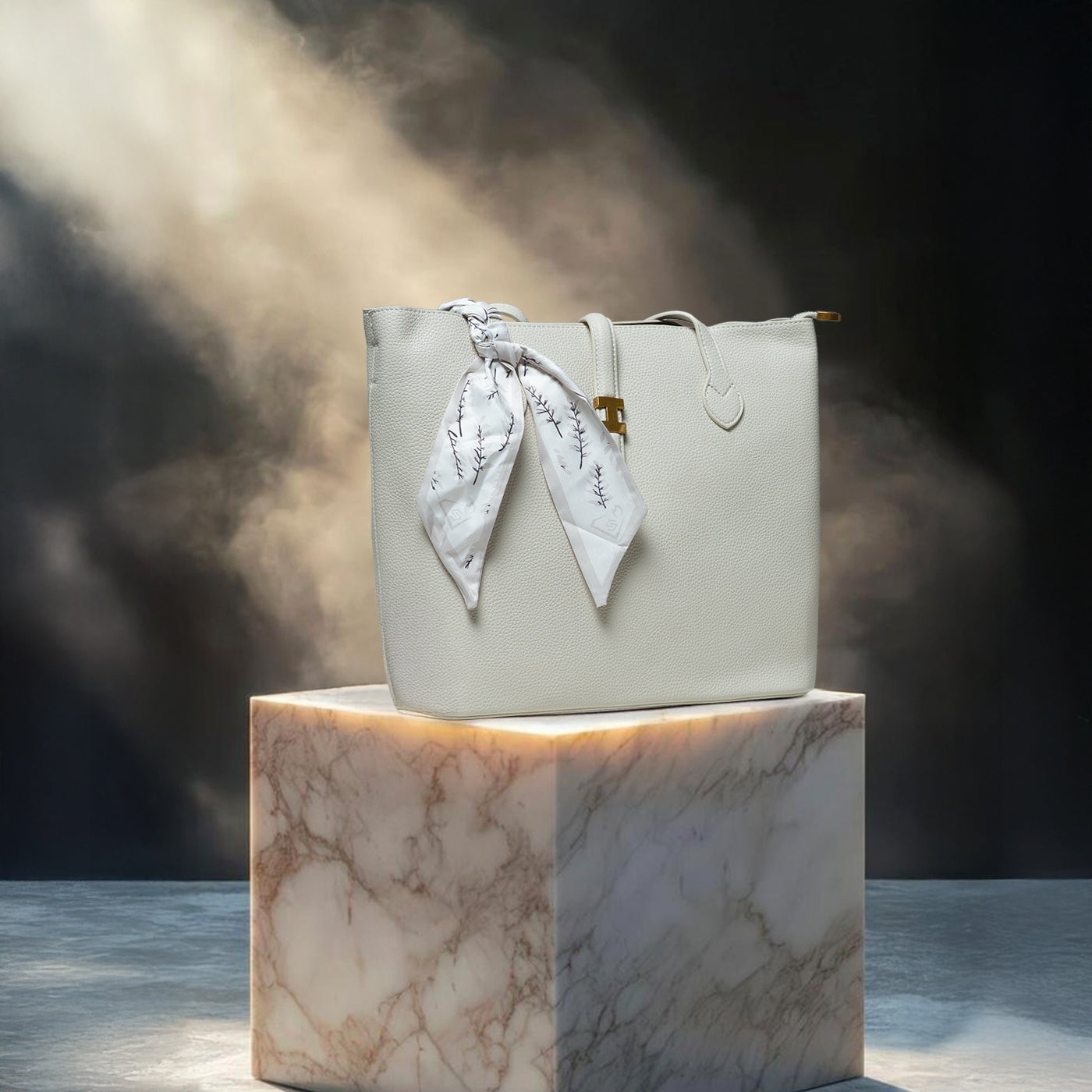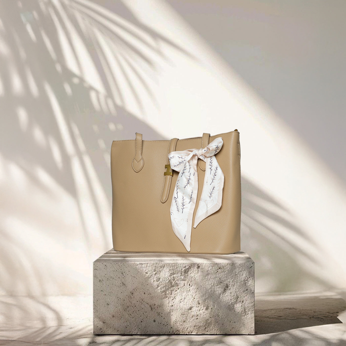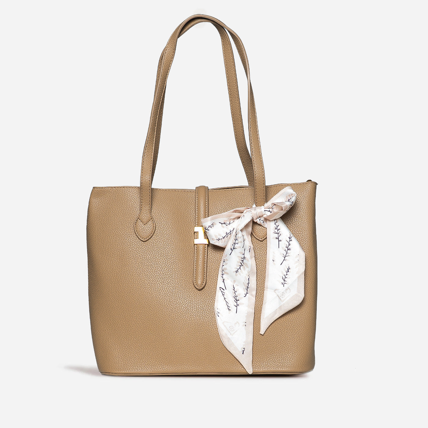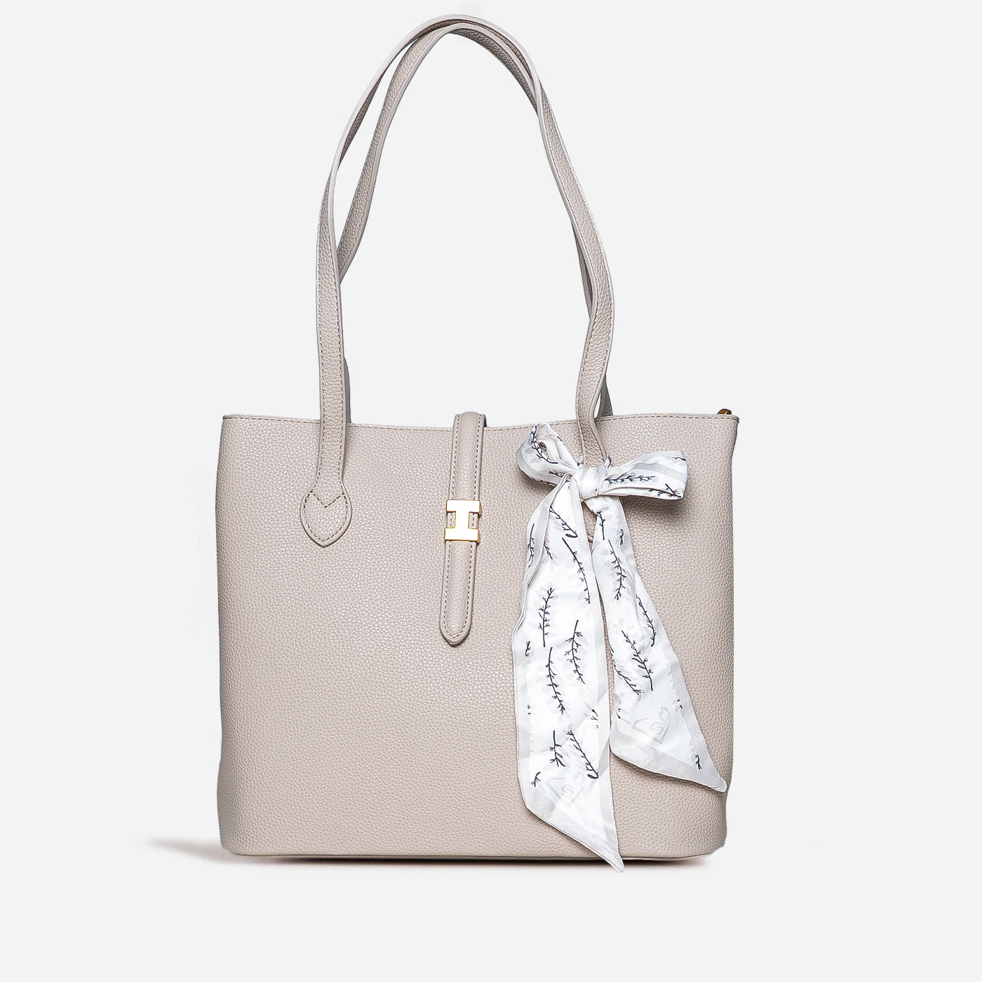Graceful and timeless, this refined tote blends clean structure with a soft, feminine touch. The smooth textured finish and delicate scarf detail add effortless charm, making it perfect for everyday sophistication.