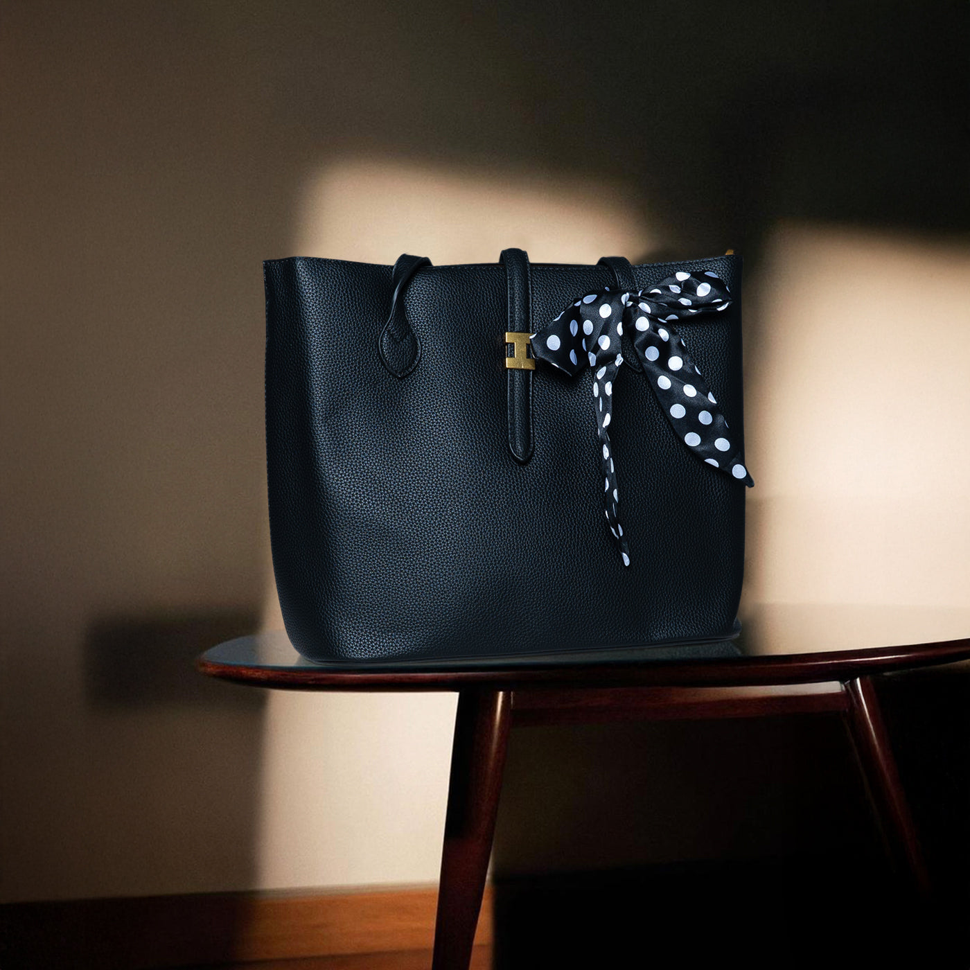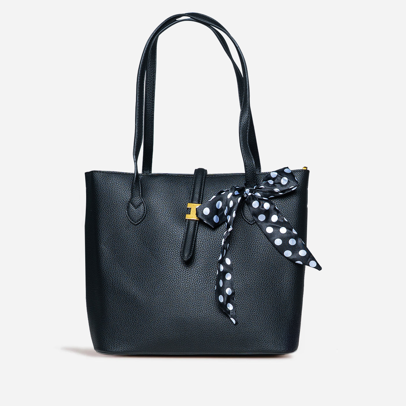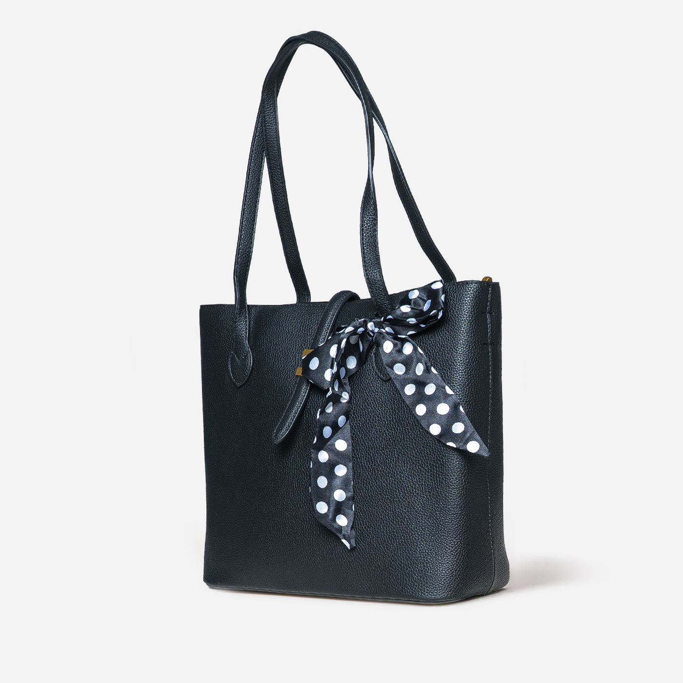 This chic tote features rich black pebbled leather paired with a striking black and white polka dot scarf. The structured silhouette offers timeless appeal, while the playful scarf accent adds personality and can be removed or repositioned. Gold hardware completes the refined look. Perfect for everyday wear, casual meetings, and versatile styling across professional and leisure settings.