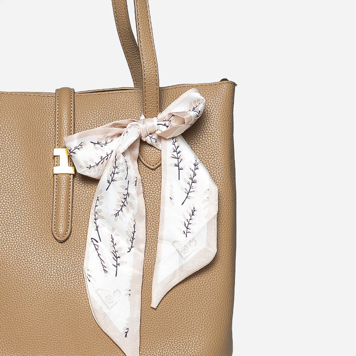 - Design: Classic tote silhouette with decorative scarf accent