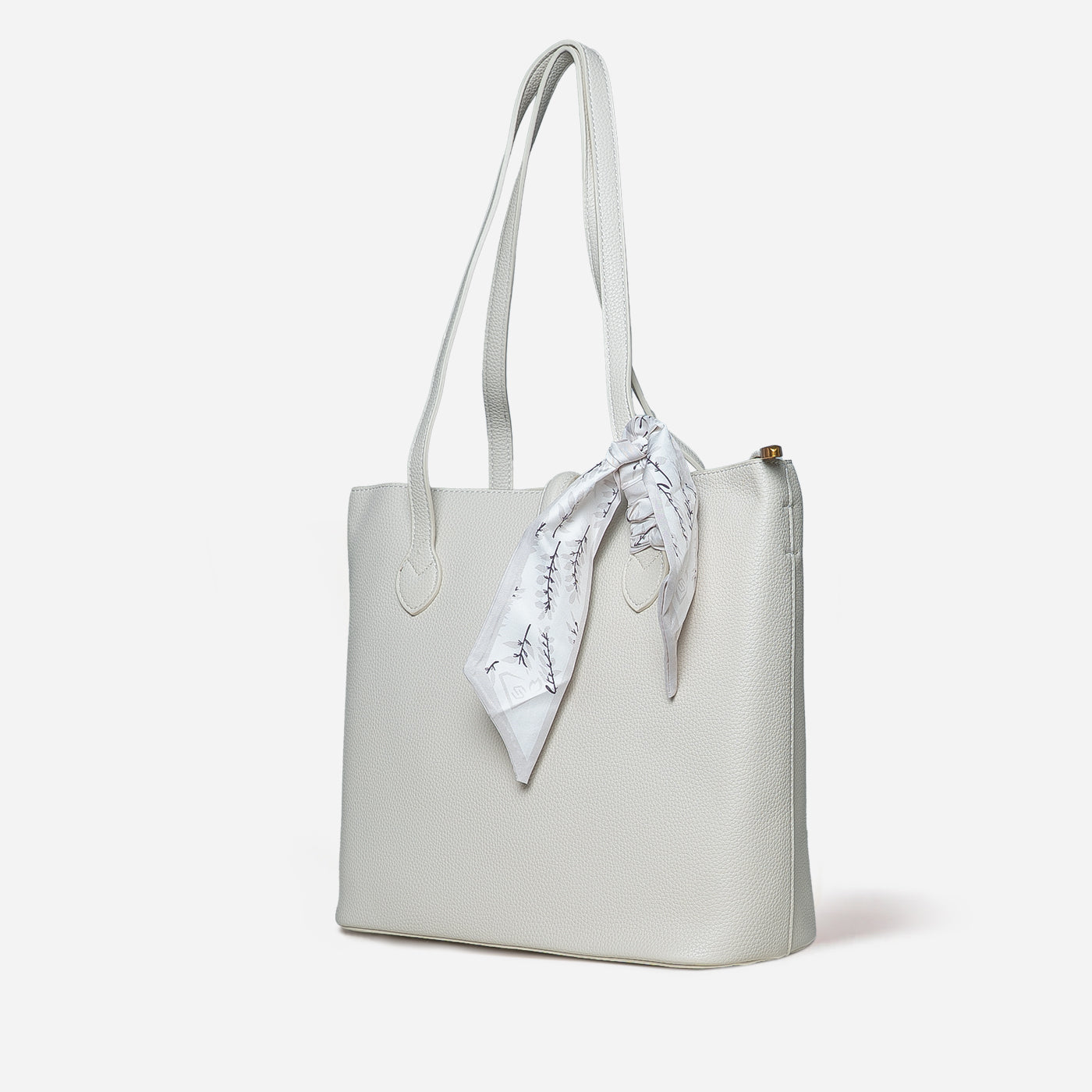 This sophisticated tote showcases pristine white leather with a refined rectangular shape. A botanical print scarf accent adds visual interest and can be styled multiple ways. The structured design maintains a polished appearance while offering generous storage space. Ideal for professional settings, brunch outings, and occasions that demand fresh, clean aesthetics with versatile functionality.