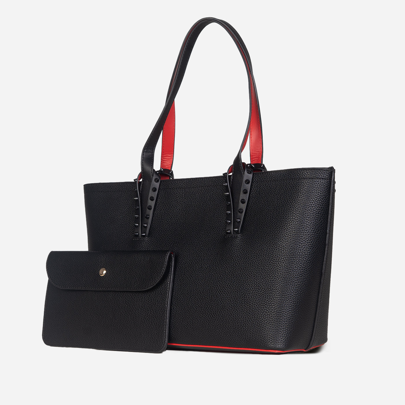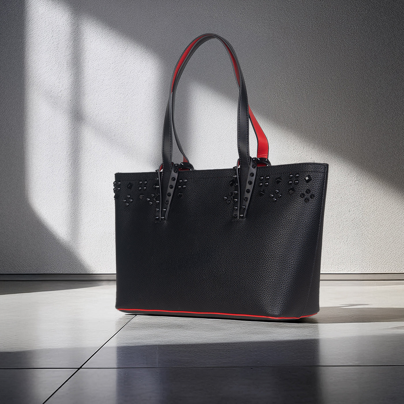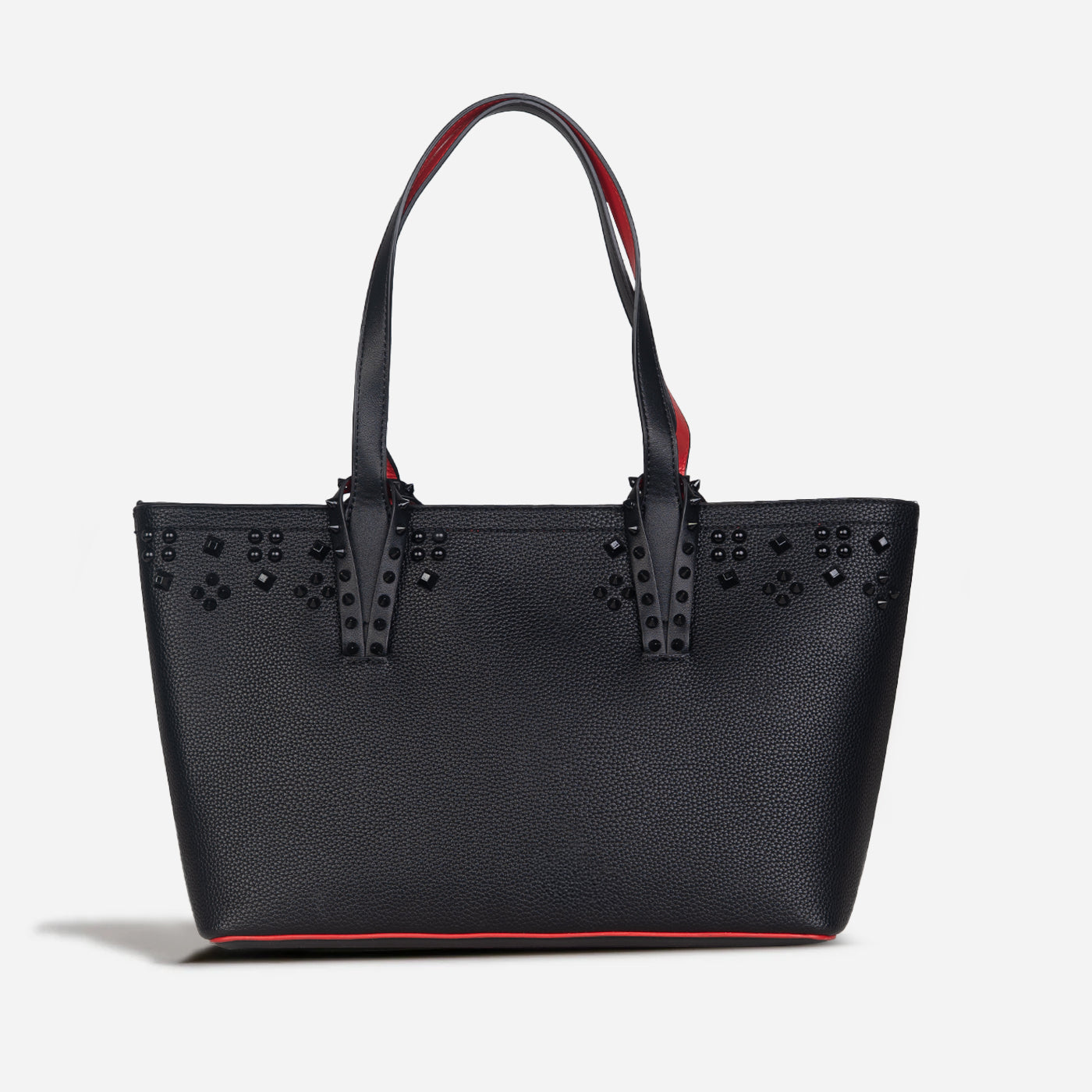 This sophisticated tote features a clean, structured silhouette accented with subtle stud detailing for a modern edge. Crafted with a smooth, durable finish, it balances elegance and functionality with ease. The spacious interior offers ample room for daily essentials, while the sturdy handles provide comfortable carry throughout the day.
