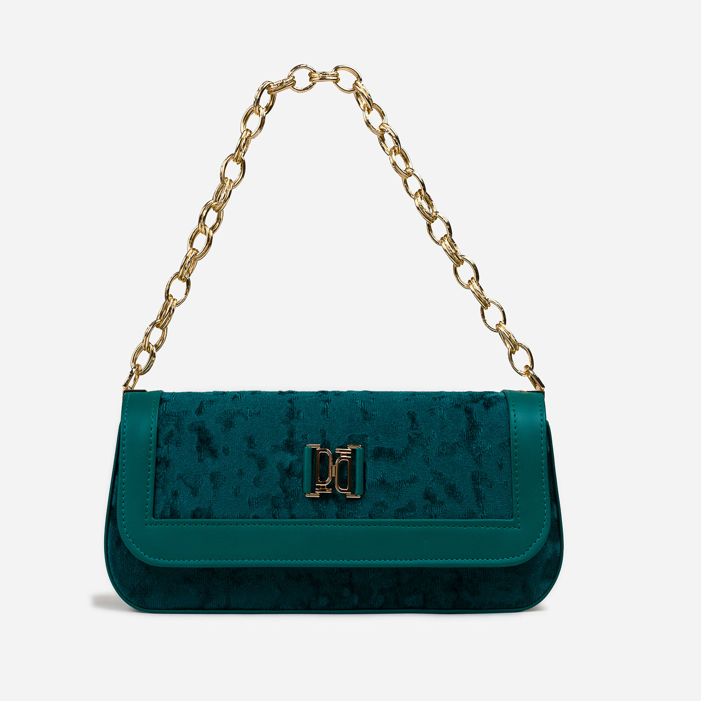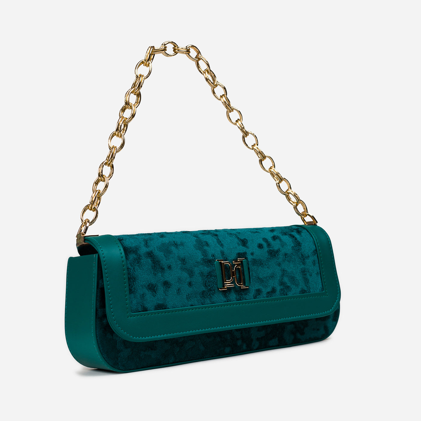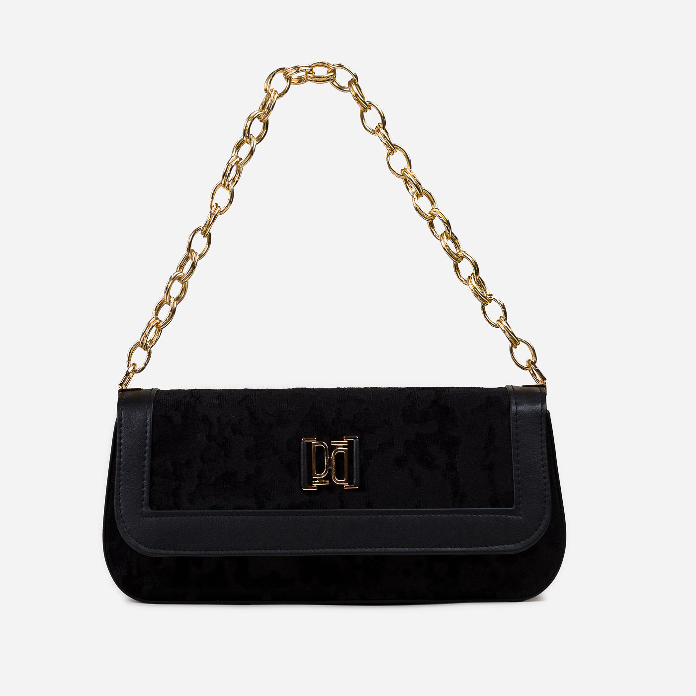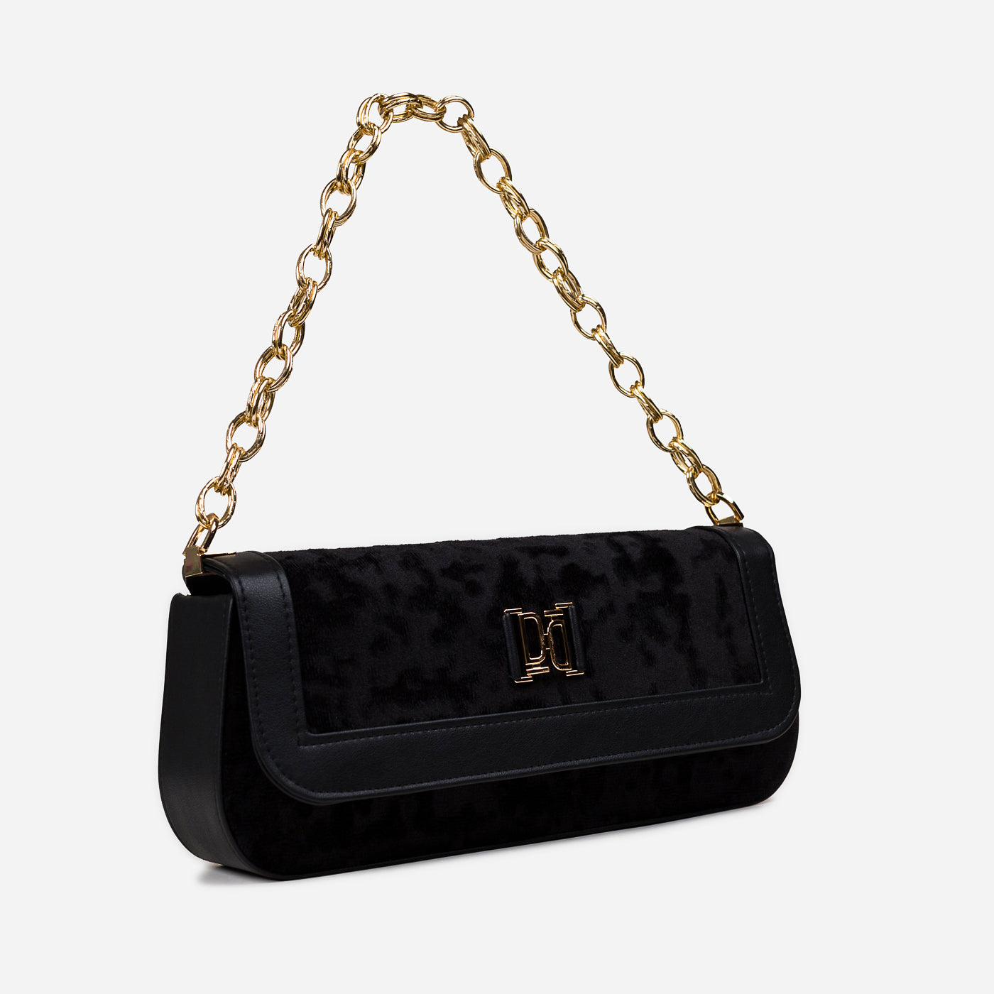 A sleek and refined shoulder bag designed for modern elegance. With its structured silhouette, plush textured fabric, and polished gold-tone chain strap, this bag adds sophistication to both day and evening looks. The secure flap closure and spacious interior make it not just stylish but functional too.