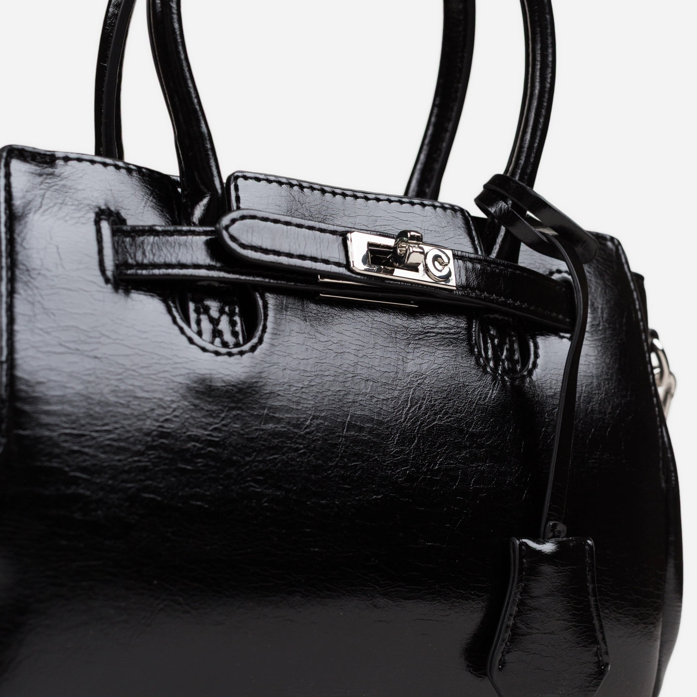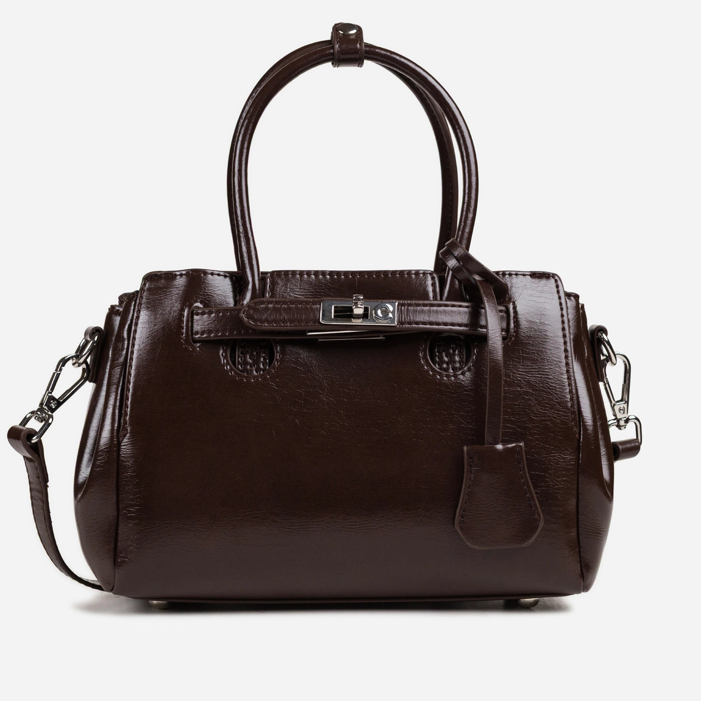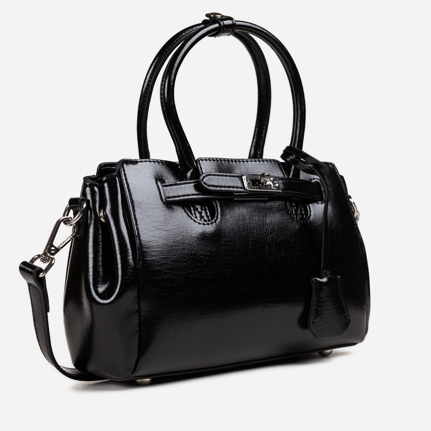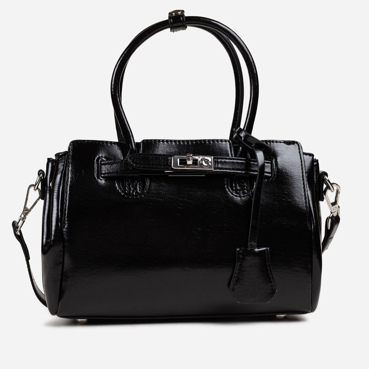 Contemporary sophistication in a polished structured silhouette. This piece showcases high-shine patent leather with distinctive crackle texture creating luxurious dimensional appeal. The dual rounded handles provide comfortable elegant carry, while the signature turnlock hardware ensures secure refined closure. Adjustable crossbody strap delivers versatile wearing options, and the generous interior offers ample organized storage.
