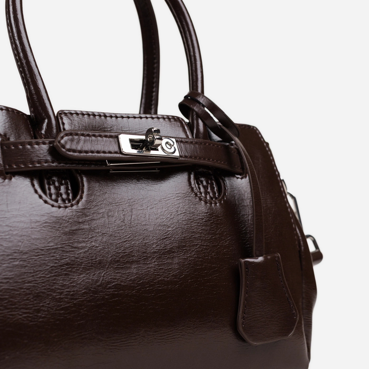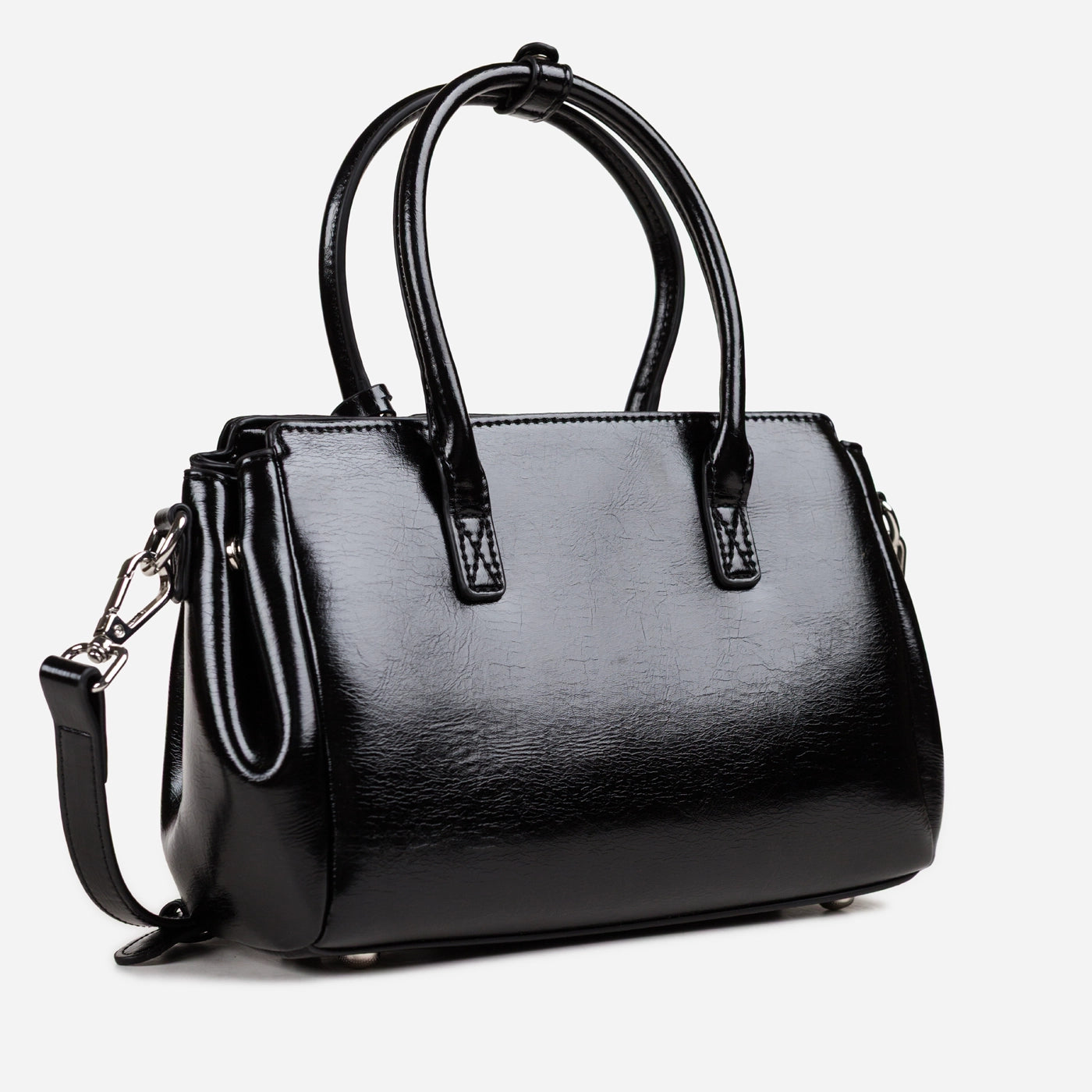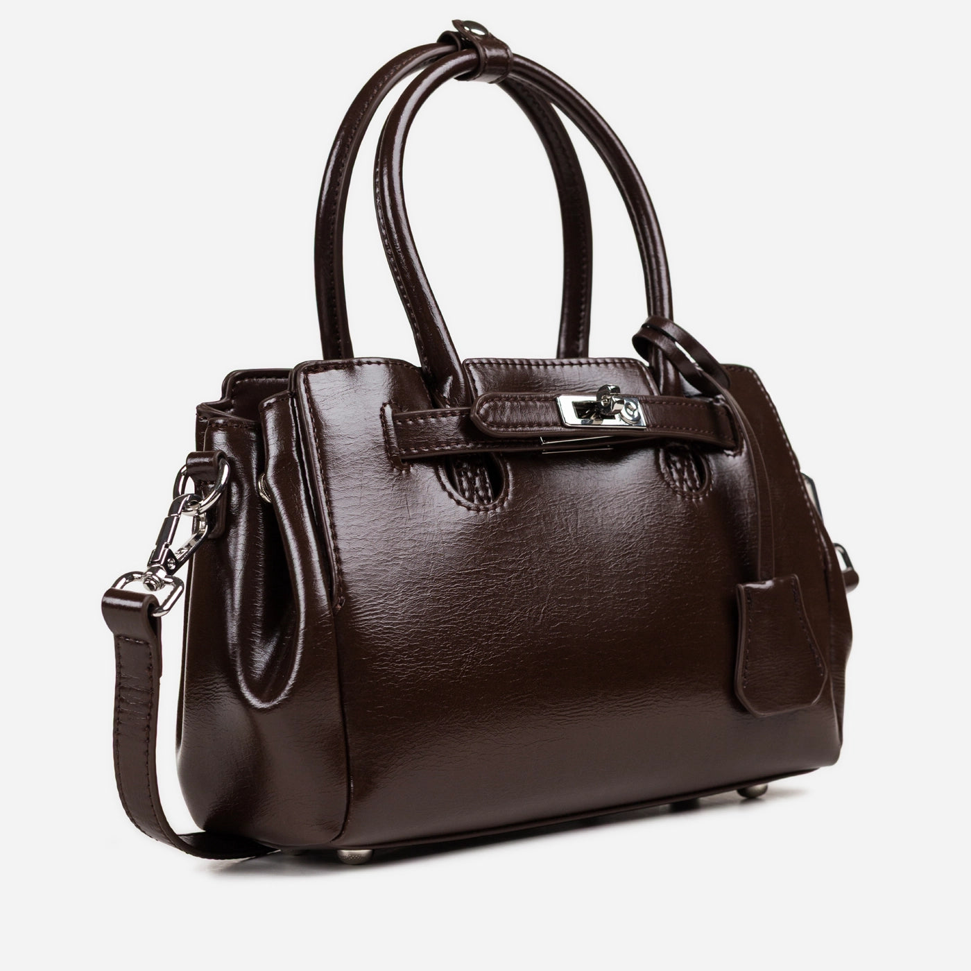 Contemporary sophistication in a polished structured silhouette. This piece showcases high-shine patent leather with distinctive crackle texture creating luxurious dimensional appeal. The dual rounded handles provide comfortable elegant carry, while the signature turnlock hardware ensures secure refined closure. Adjustable crossbody strap delivers versatile wearing options, and the generous interior offers ample organized storage.
