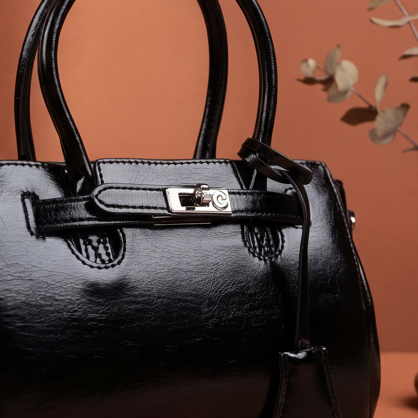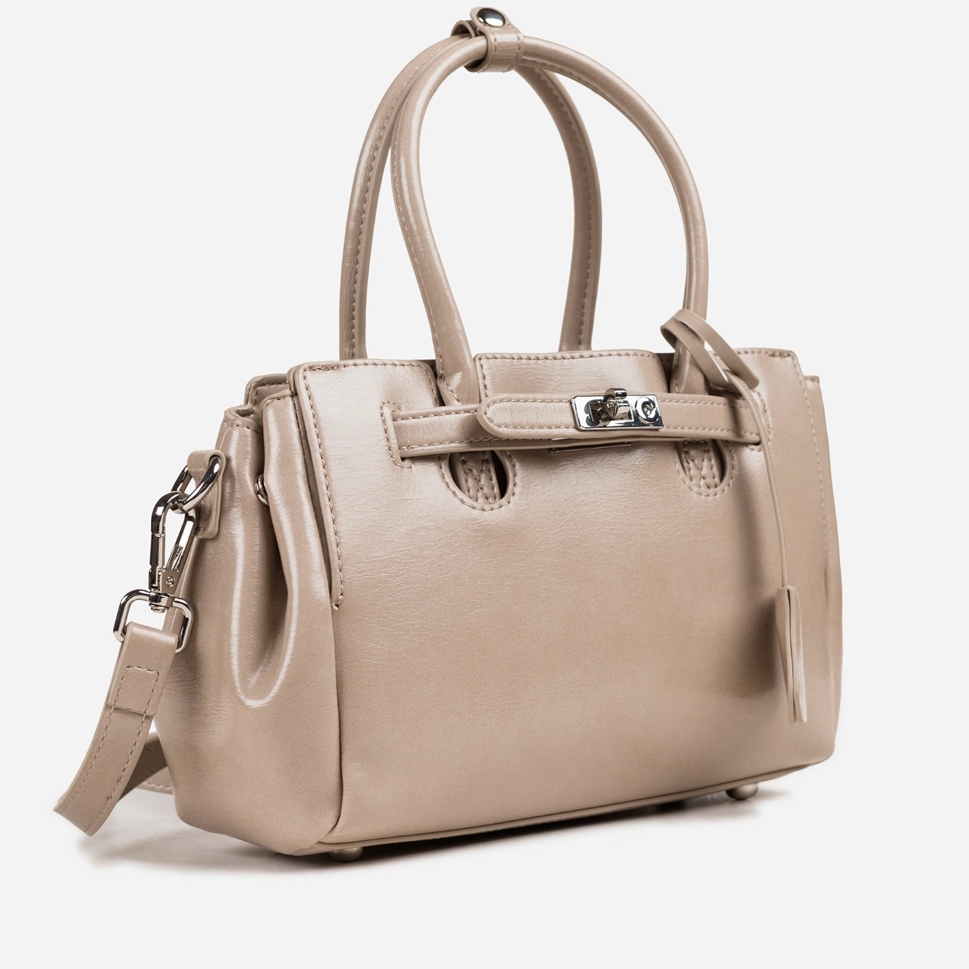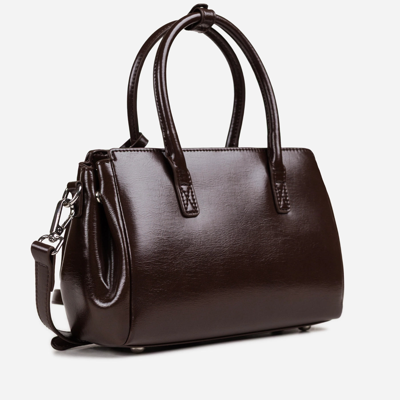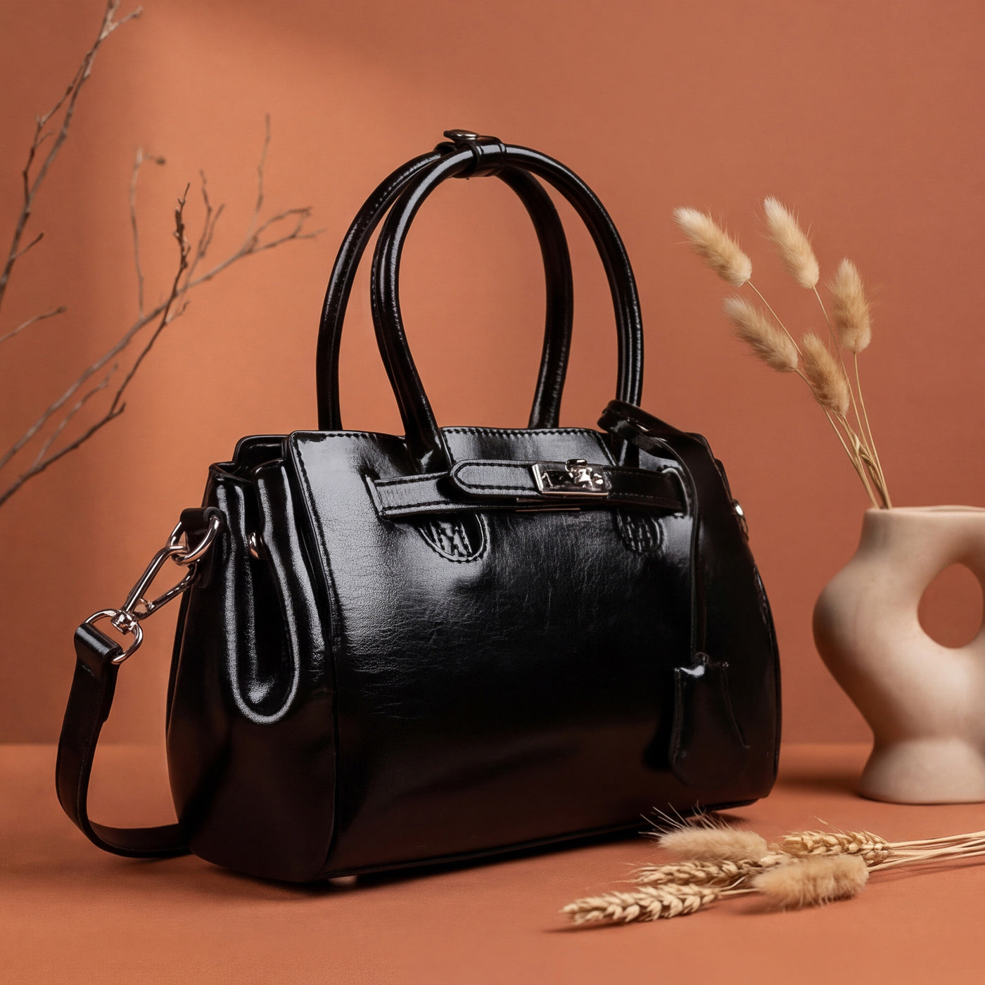 Contemporary sophistication in a polished structured silhouette. This piece showcases high-shine patent leather with distinctive crackle texture creating luxurious dimensional appeal. The dual rounded handles provide comfortable elegant carry, while the signature turnlock hardware ensures secure refined closure. Adjustable crossbody strap delivers versatile wearing options, and the generous interior offers ample organized storage.