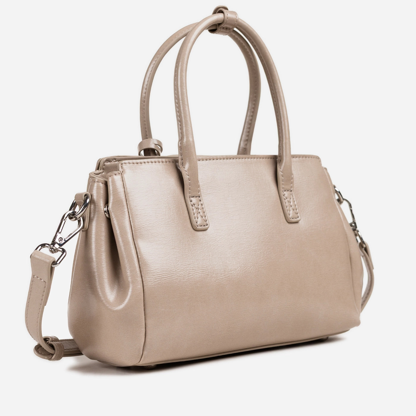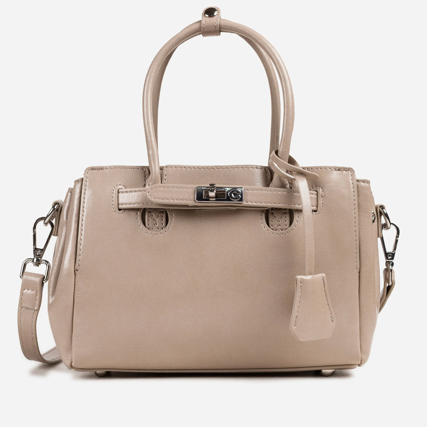 - Design: Structured silhouette with dual rounded handles and adjustable crossbody strap