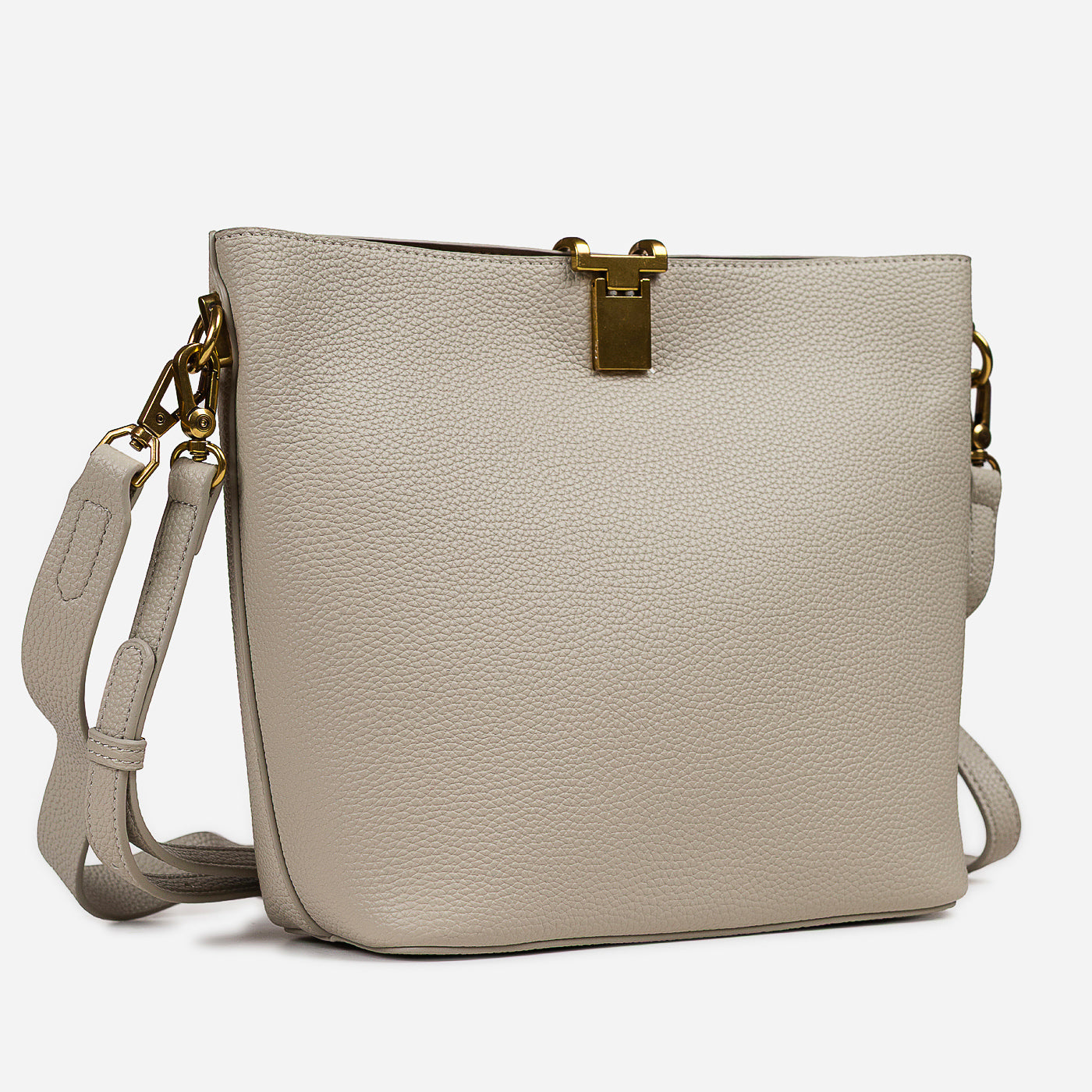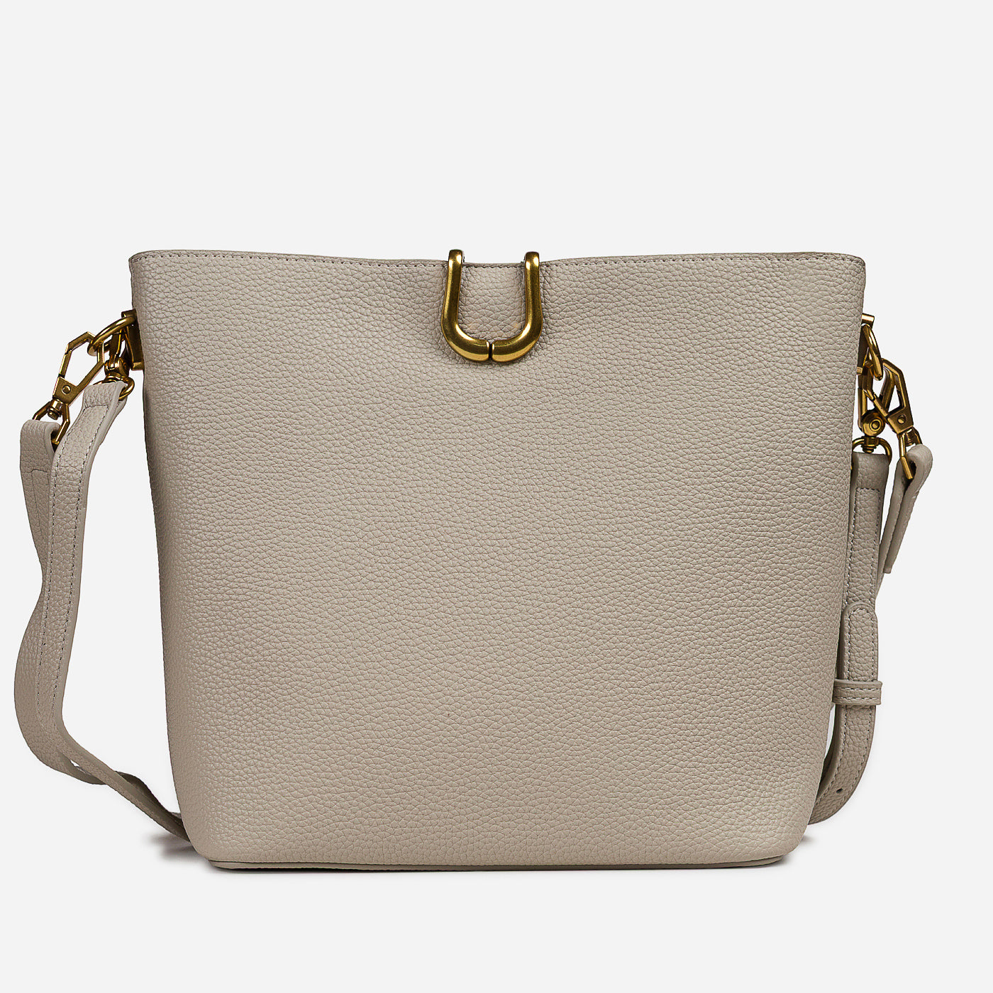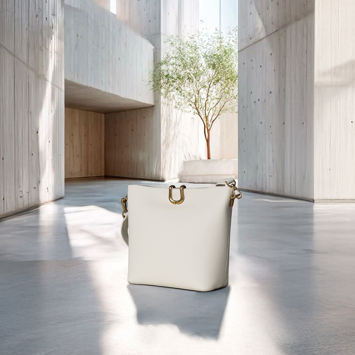 This sophisticated bucket bag features pristine cream pebbled leather with a clean, structured silhouette. The signature U-shaped gold hardware creates a distinctive focal point, while the adjustable crossbody strap offers versatile wear. The spacious interior provides practical storage with refined simplicity. Perfect for professional settings, casual outings, and everyday moments that call for understated sophistication with modern appeal.