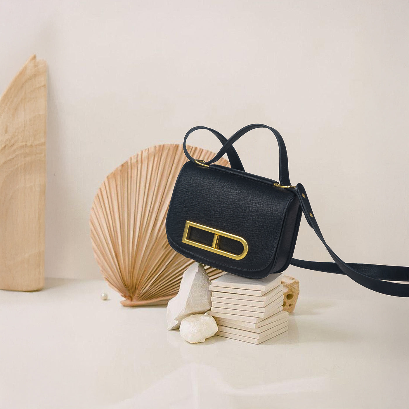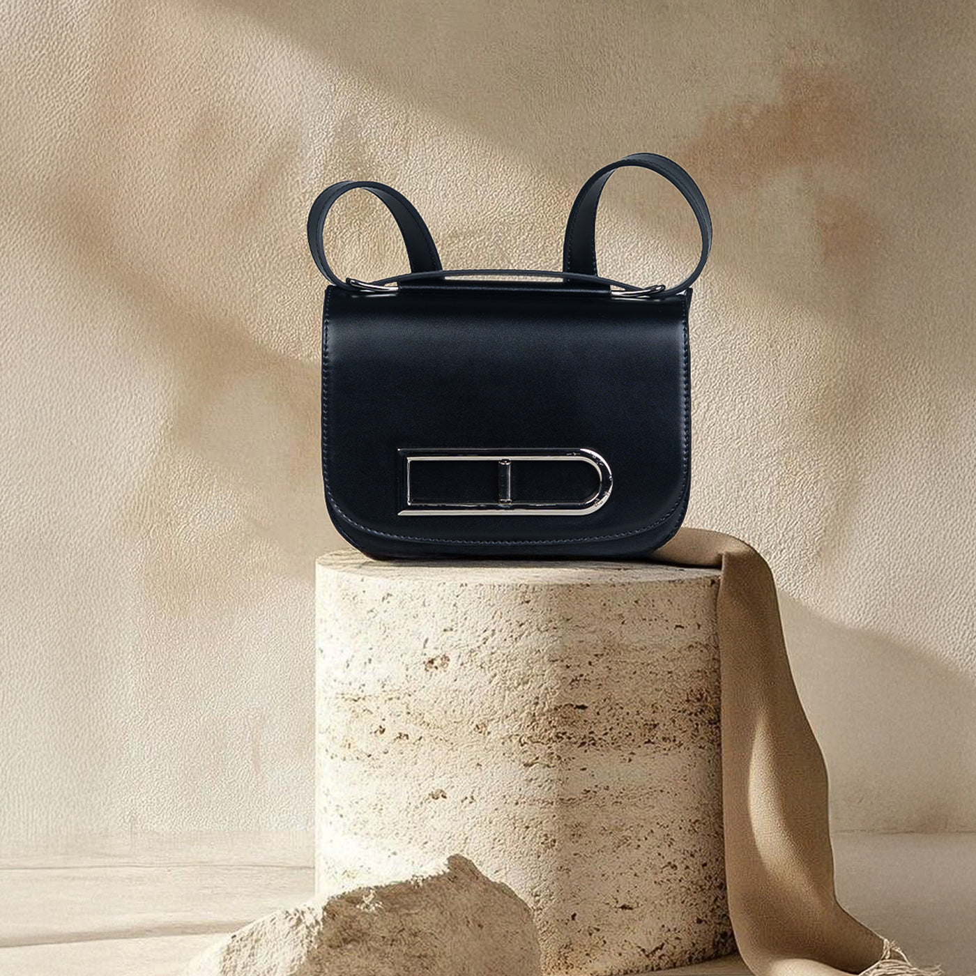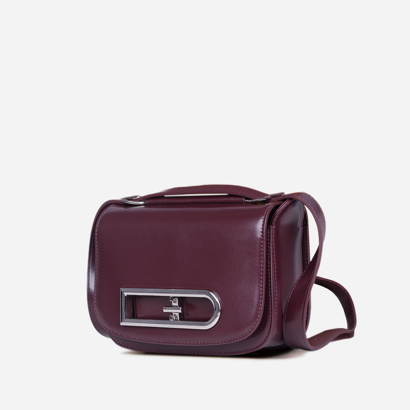 Elegant and structured, this refined handbag blends modern sophistication with timeless appeal. Crafted with a smooth, structured silhouette and clean lines, it features a polished metal accent that adds a subtle statement of luxury. The compact yet practical design offers just the right amount of space for everyday essentials, while the adjustable strap allows for versatile styling carry it by hand or wear it comfortably over the shoulder.