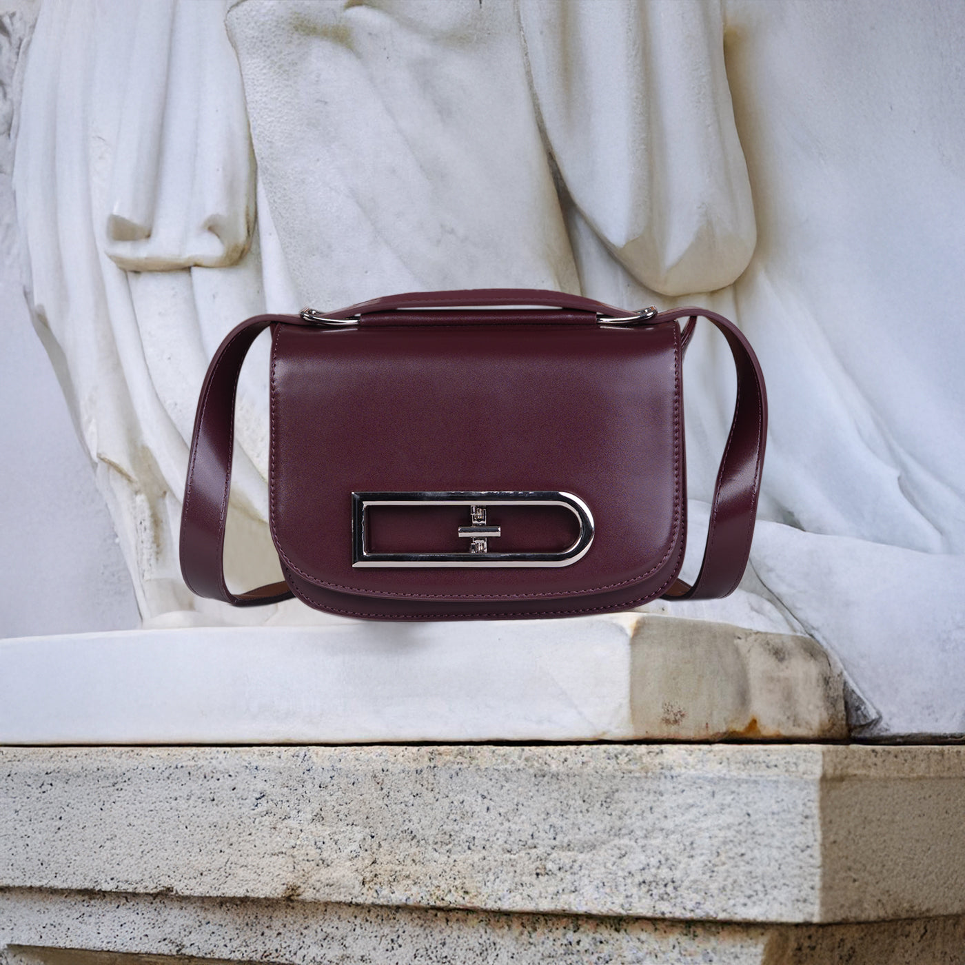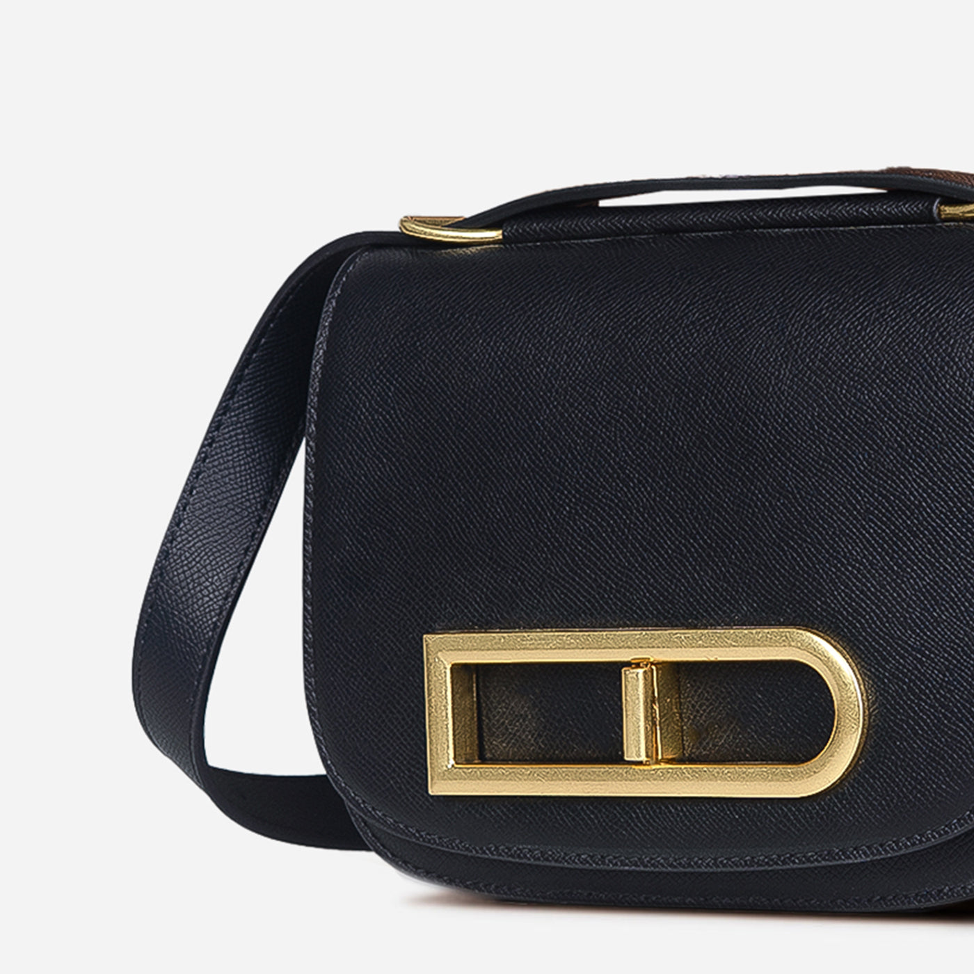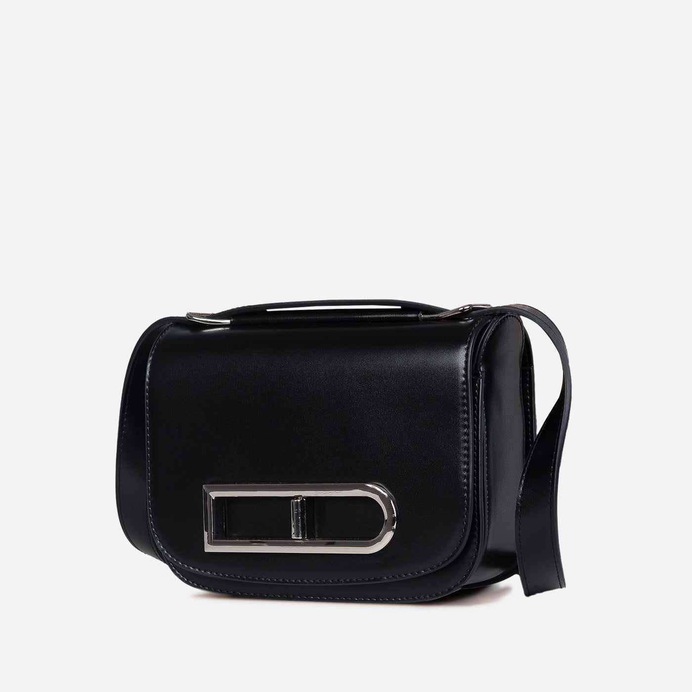 This compact crossbody bag is designed to make a statement through clean lines and thoughtful detail. The structured silhouette is balanced by a smooth finish, while the bold metallic buckle accent adds a distinctive, contemporary edge. A sleek shoulder strap ensures comfortable wear, keeping the look practical yet polished.