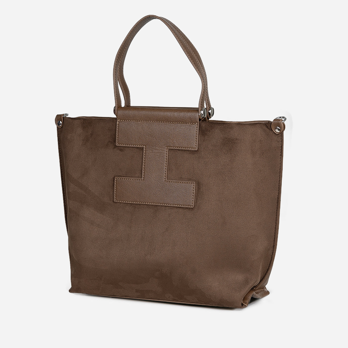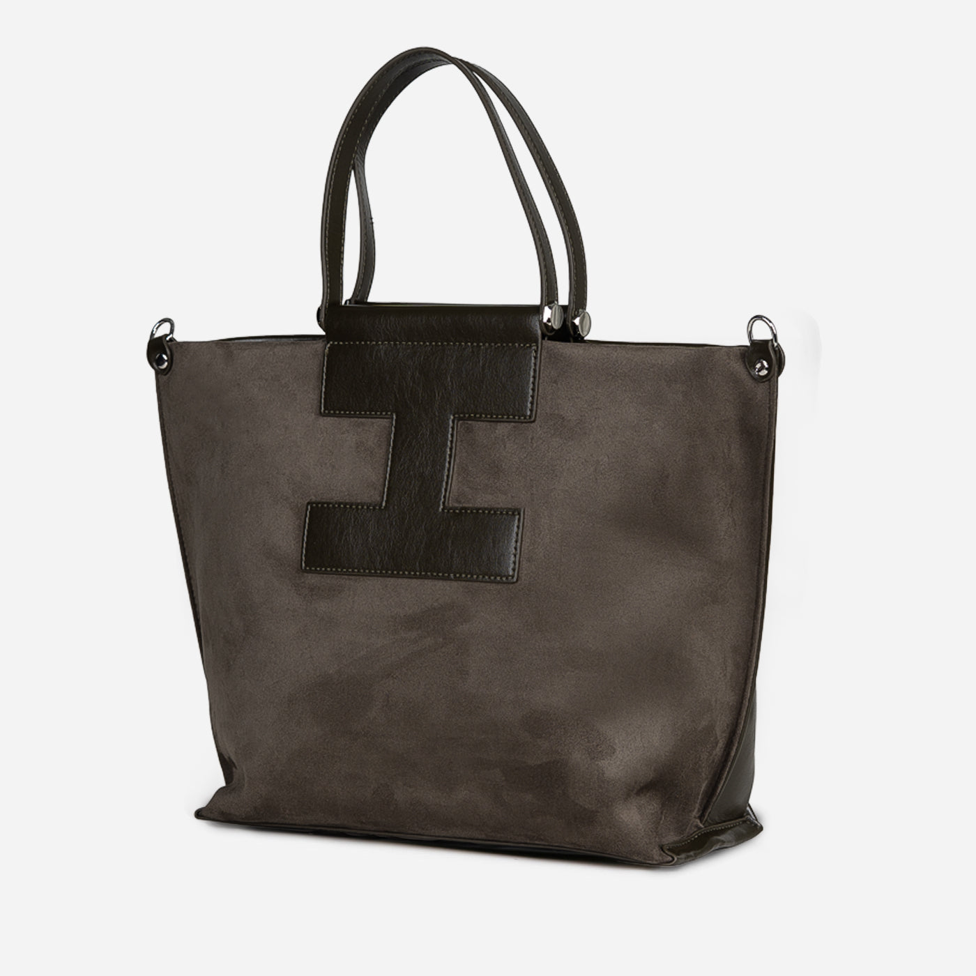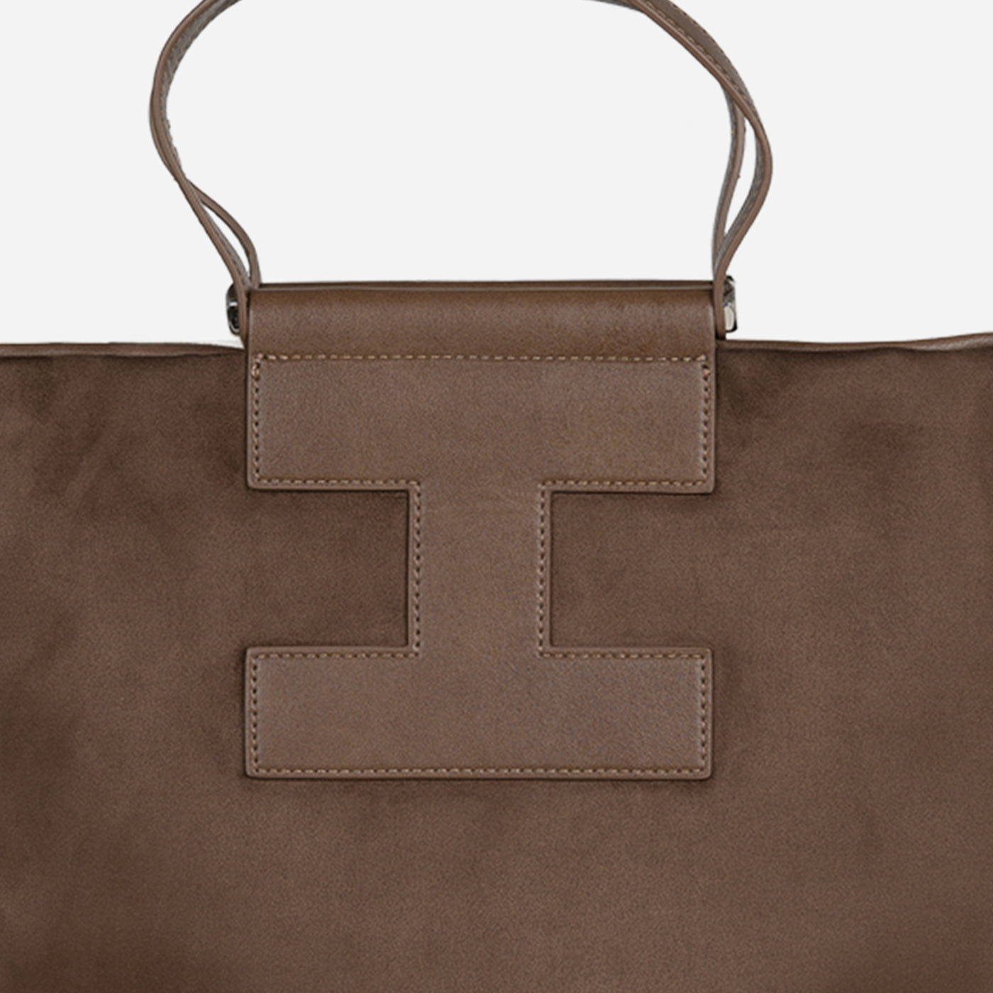 Bold sophistication in a generously proportioned silhouette. This piece showcases smooth construction with striking oversized logo accent in contrasting textured finish, creating architectural statement appeal. The dual top handles ensure comfortable carrying, while the detachable shoulder strap offers hands-free versatility. Roomy interior features organized compartments for seamless daily organization.