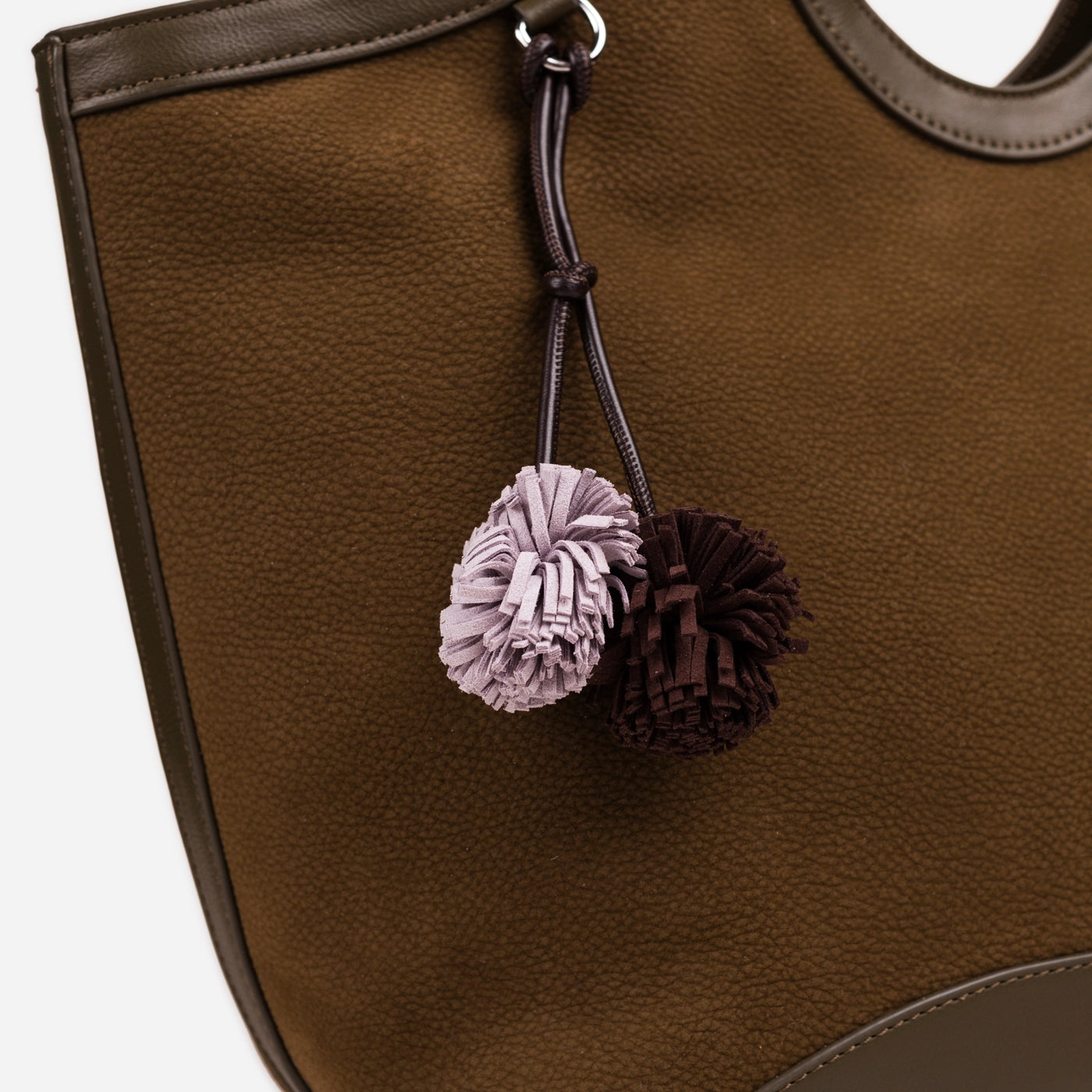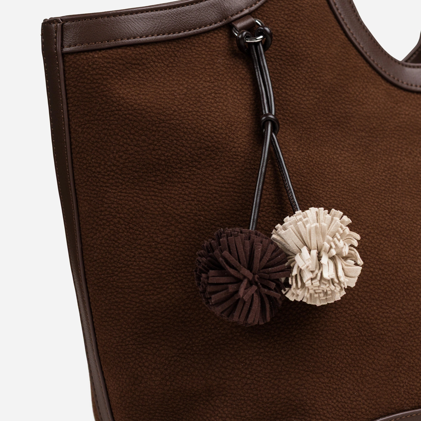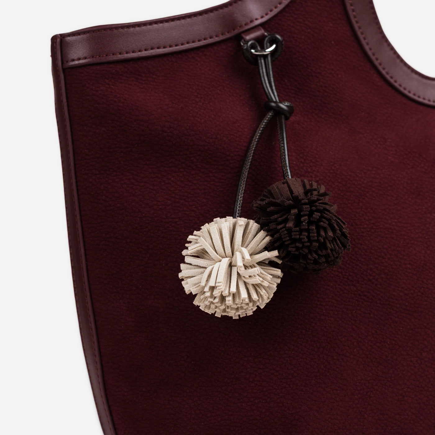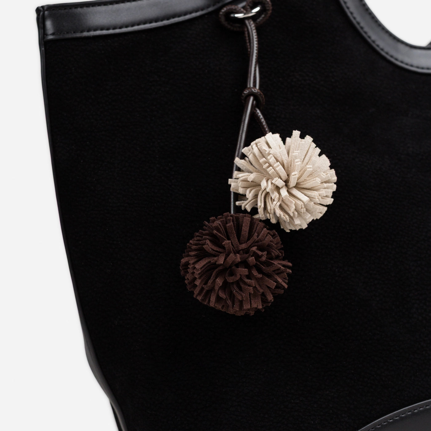 - Design: Spacious shoulder silhouette with curved handles and pom-pom charm