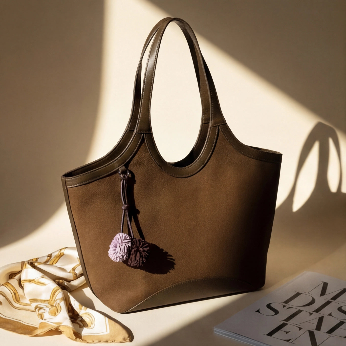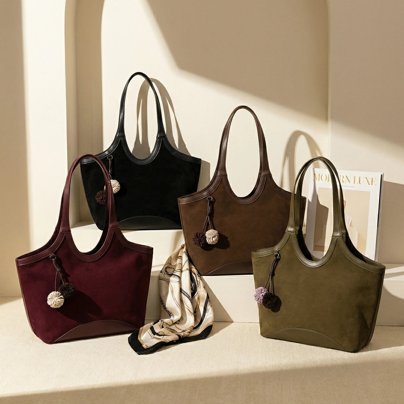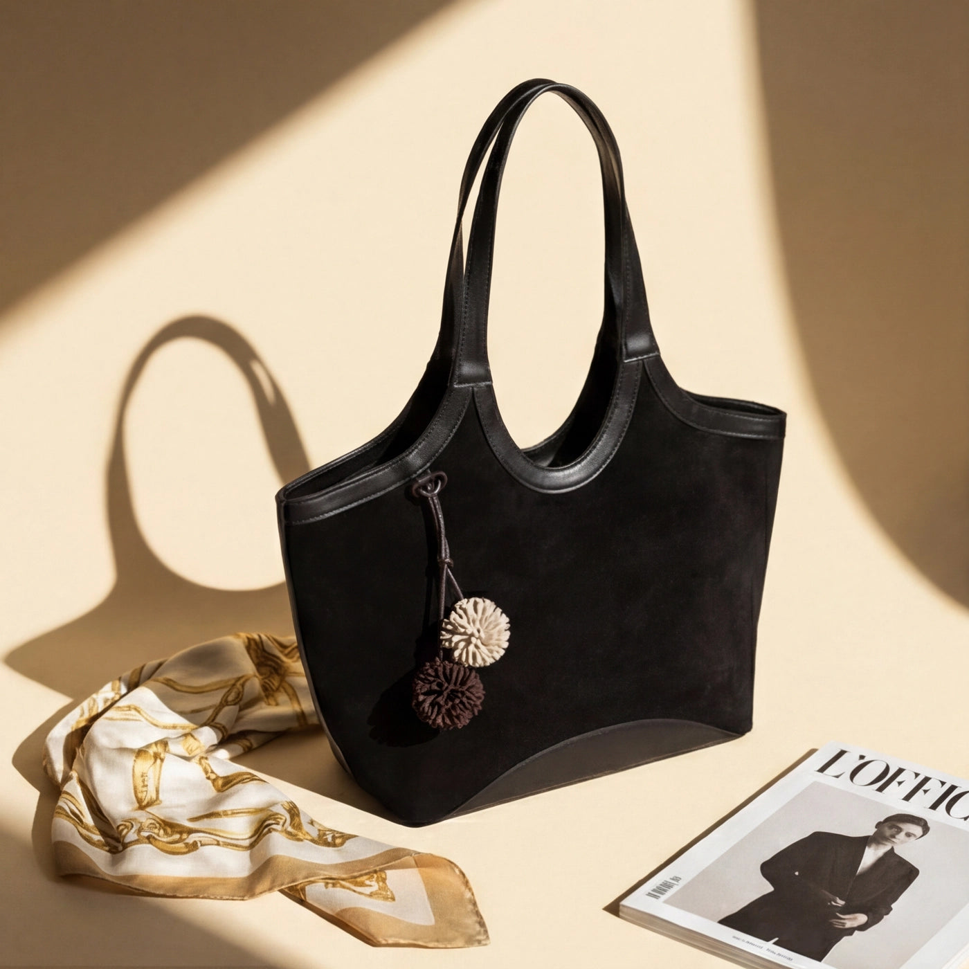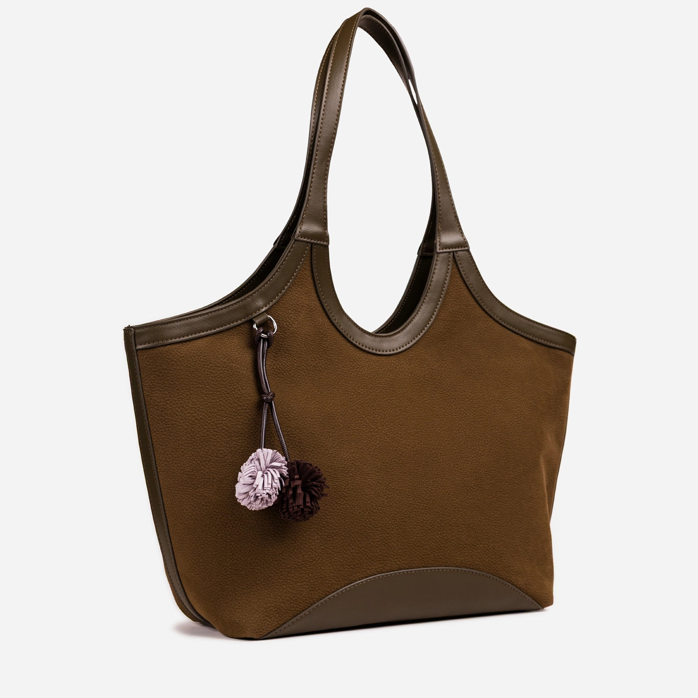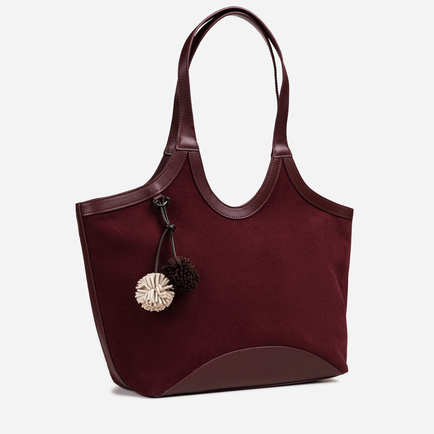 - Design: Spacious shoulder silhouette with curved handles and pom-pom charm