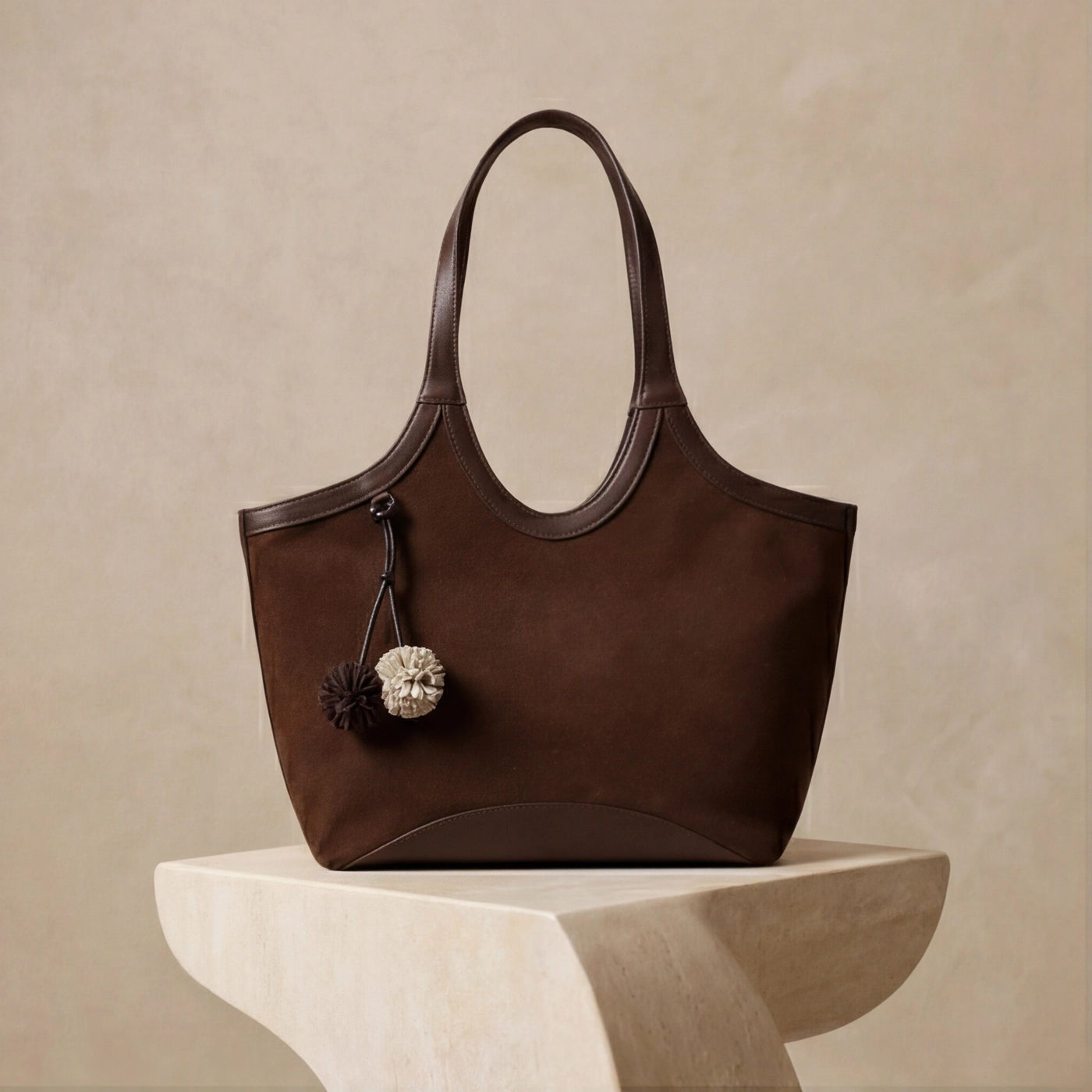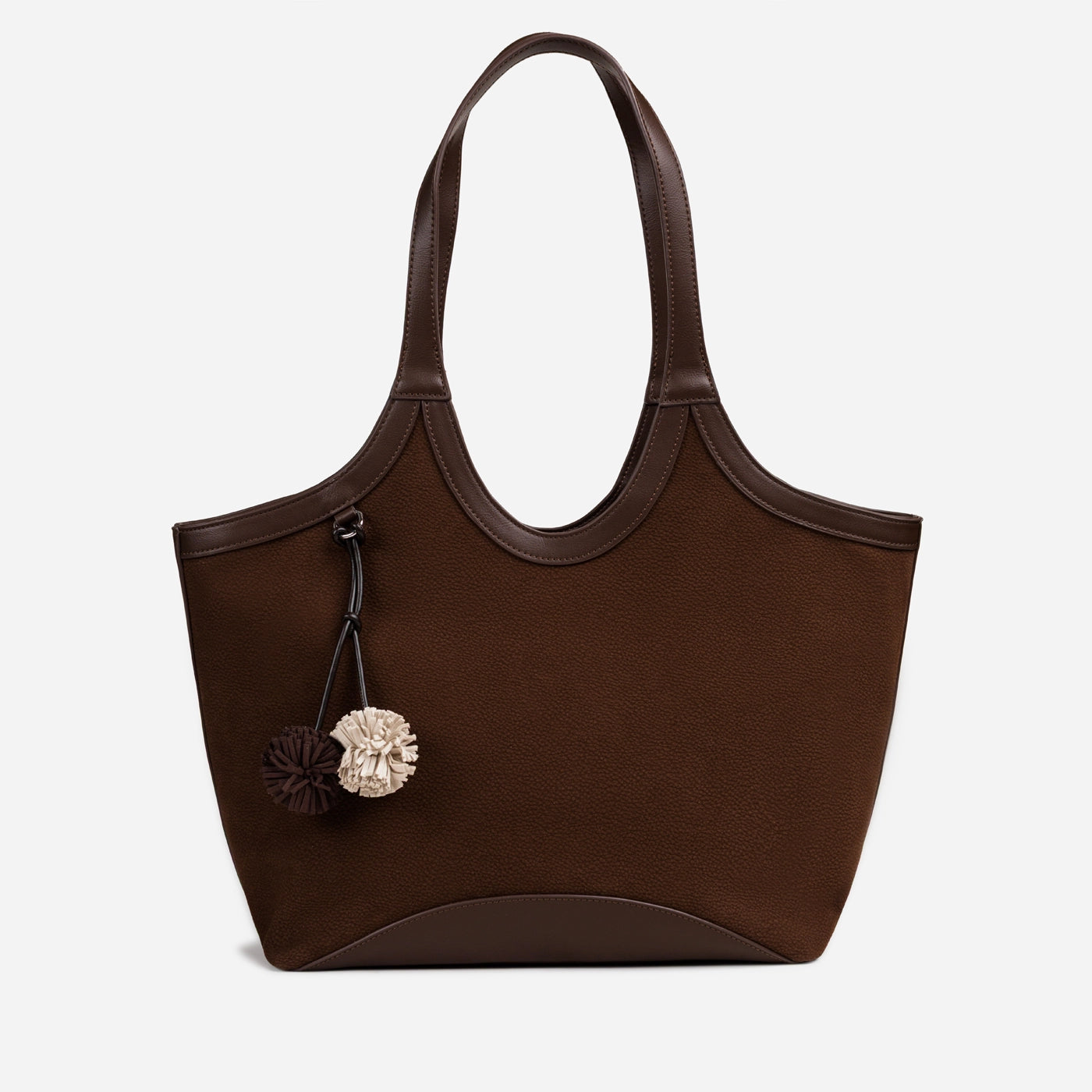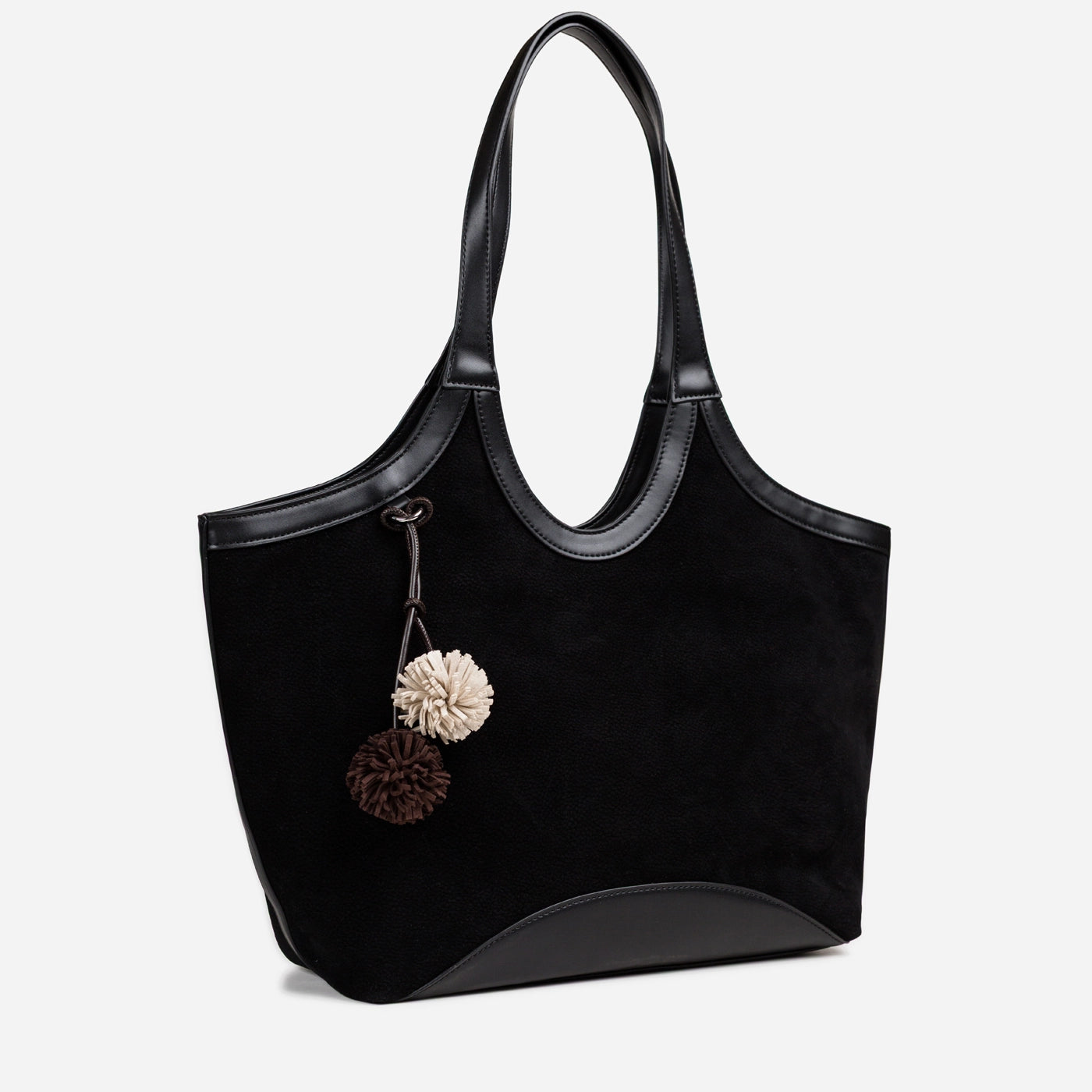 Refined elegance in a spacious shoulder silhouette. This piece showcases smooth construction with contrasting trim creating sophisticated two-tone detail. The distinctive curved handles offer ergonomic comfortable carrying, while the playful pom-pom charm adds whimsical bohemian accent. Generous interior holds work essentials, daily necessities, or weekend items with organized ease.