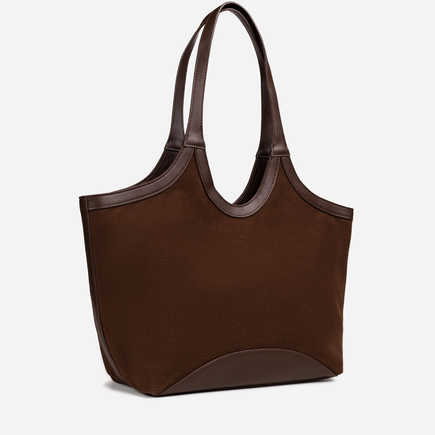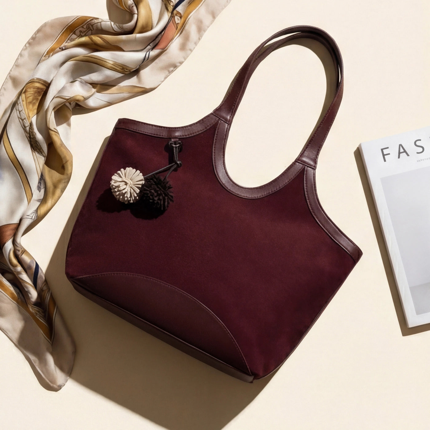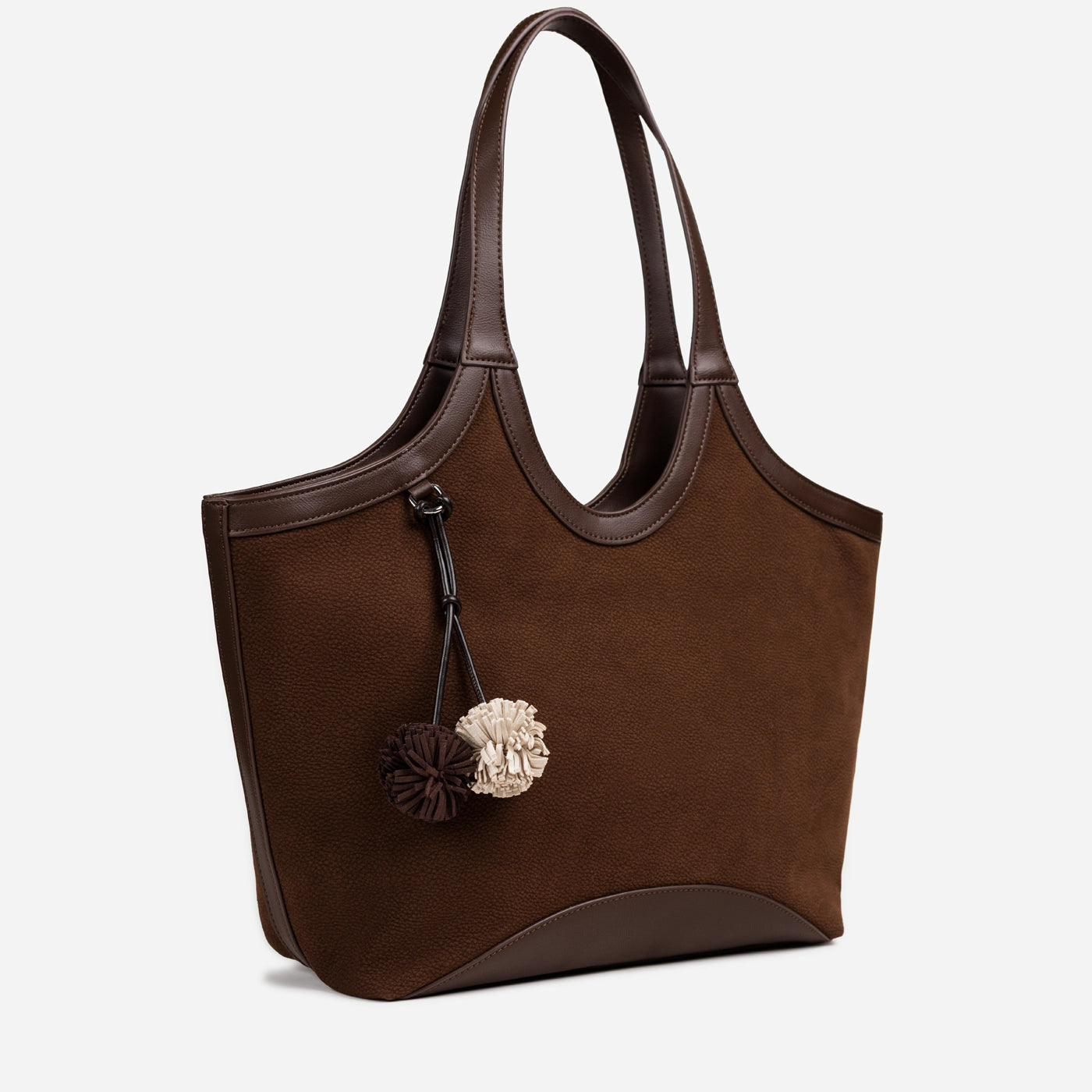 Refined elegance in a spacious shoulder silhouette. This piece showcases smooth construction with contrasting trim creating sophisticated two-tone detail. The distinctive curved handles offer ergonomic comfortable carrying, while the playful pom-pom charm adds whimsical bohemian accent. Generous interior holds work essentials, daily necessities, or weekend items with organized ease.