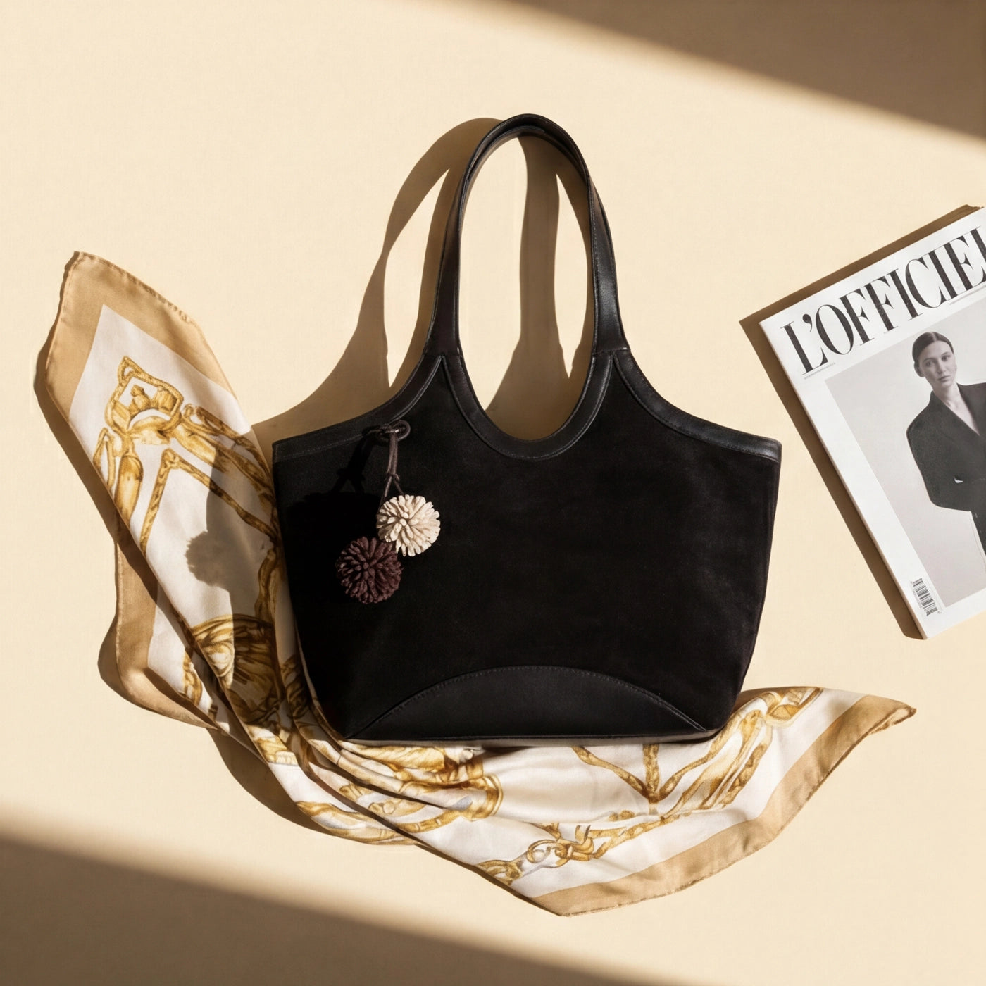 The arc-cut handle openings in the leather trim panel allow the bag to be carried over the shoulder or in the crook of the arm, with the smooth leather surface of the handle arc providing a comfortable grip point during carry. The wide crescent body accommodates a phone, wallet, keys, a small notebook, and daily essentials, with the suede panels expanding naturally as contents are added. The suede and leather construction and raffia charm detail make this bag suited for casual outings, weekend use, and modest everyday dressing.