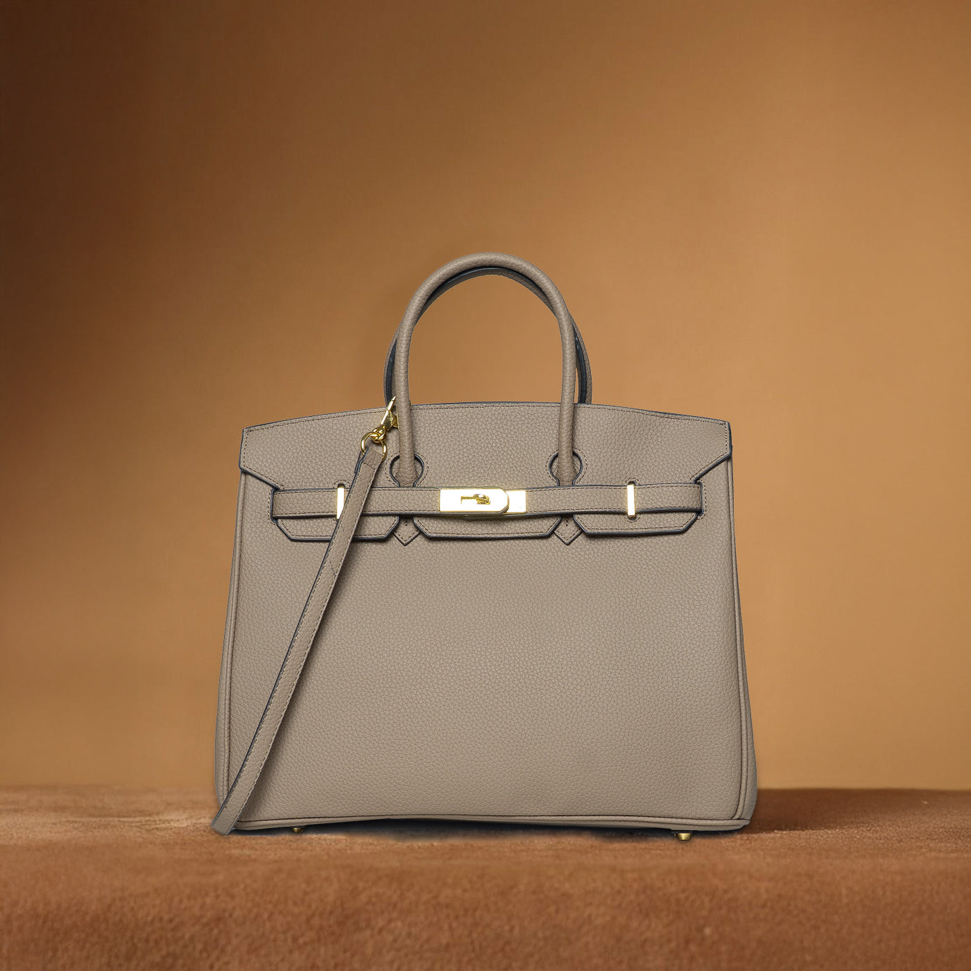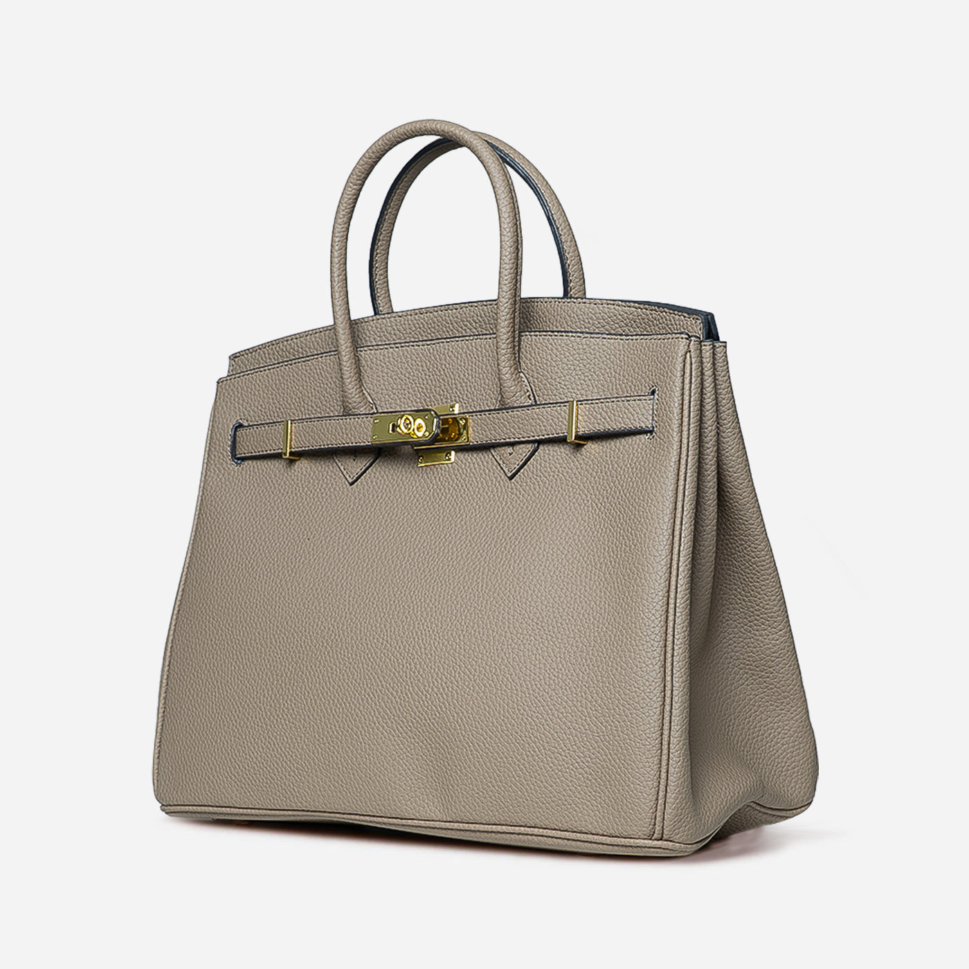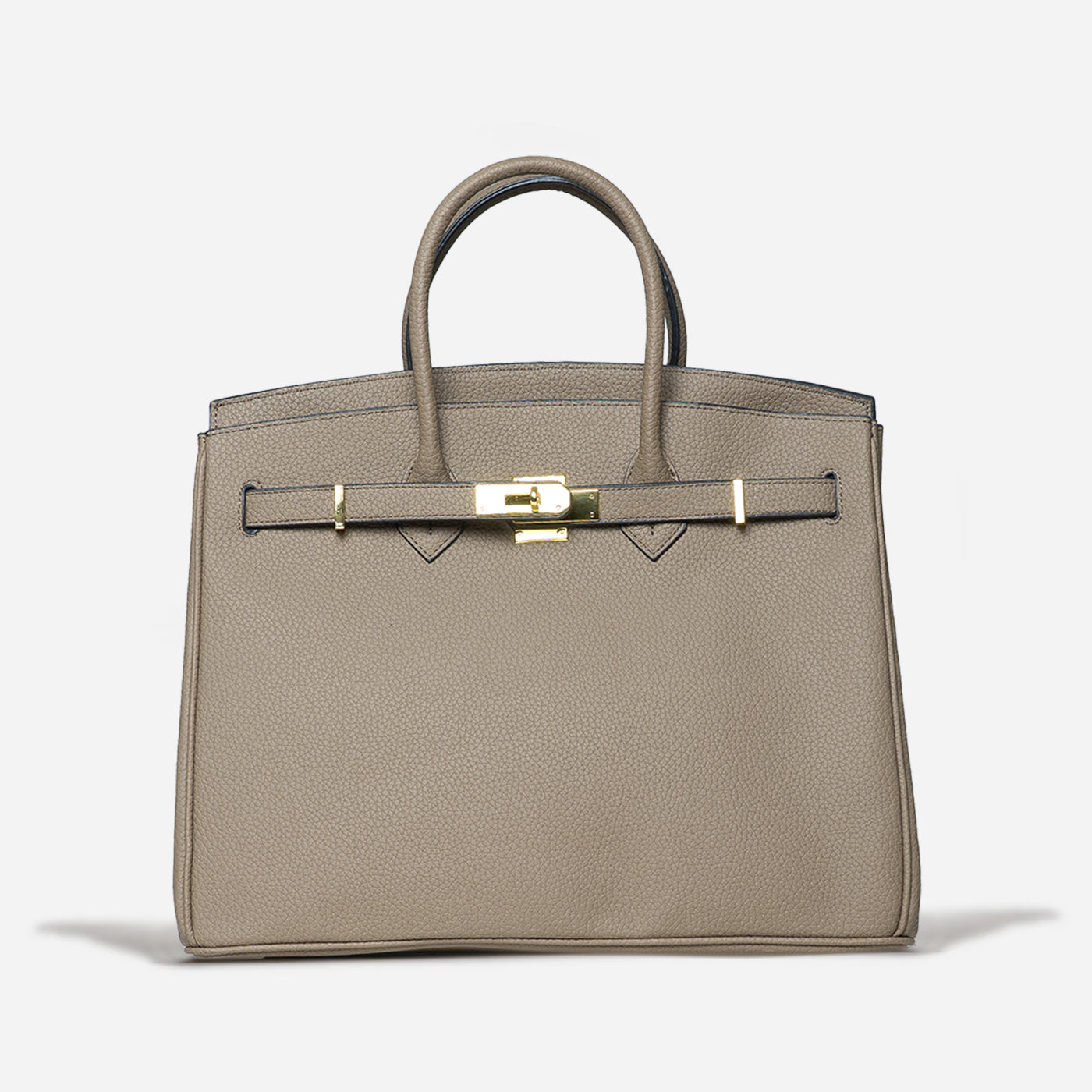 This sophisticated handbag features smooth grey pebbled leather with a timeless structured silhouette. The signature turn lock closure and belted detail create classic appeal, while gold tone hardware adds luxurious finishing. Dual top handles and a detachable shoulder strap offer versatile carrying options. Perfect for professional settings, formal occasions, and everyday elegance that demands polished presence.