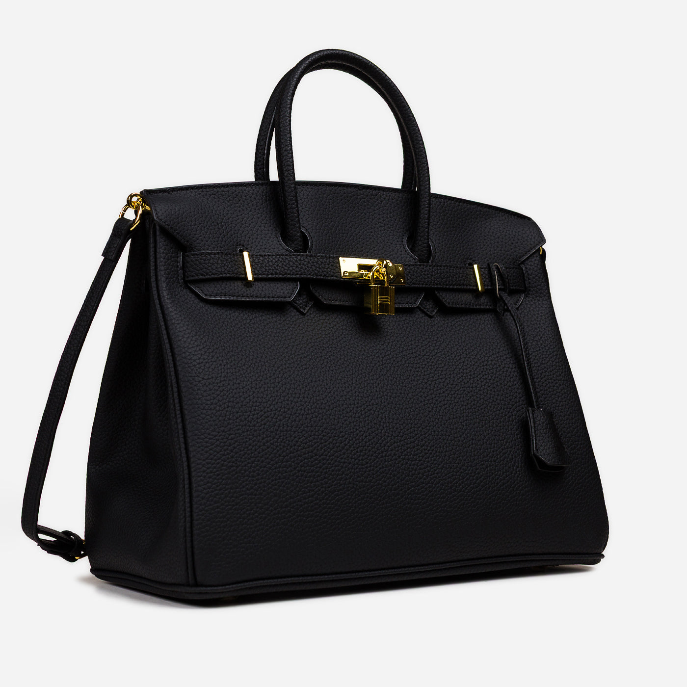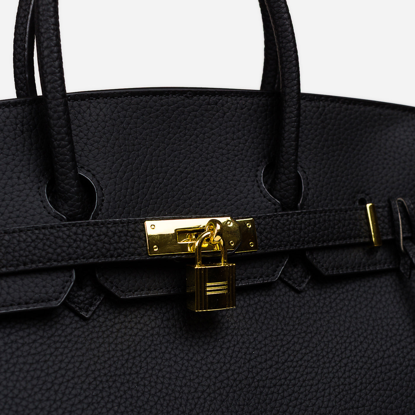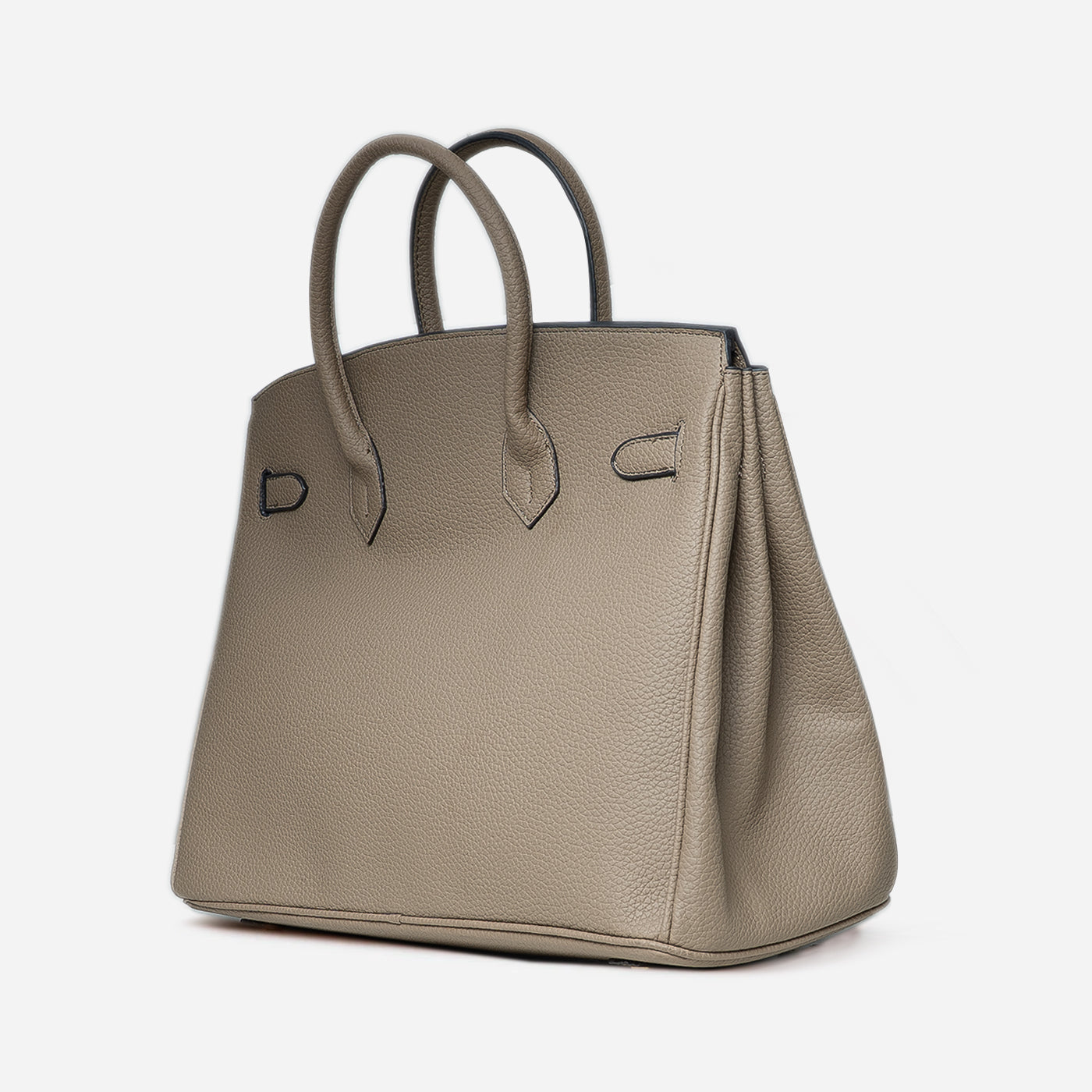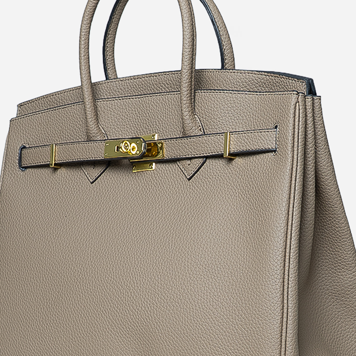 This sophisticated handbag features smooth grey pebbled leather with a timeless structured silhouette. The signature turn lock closure and belted detail create classic appeal, while gold tone hardware adds luxurious finishing. Dual top handles and a detachable shoulder strap offer versatile carrying options. Perfect for professional settings, formal occasions, and everyday elegance that demands polished presence.