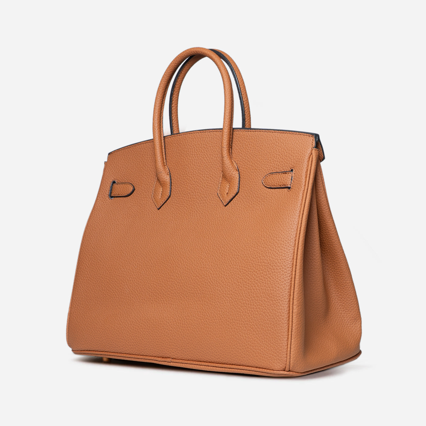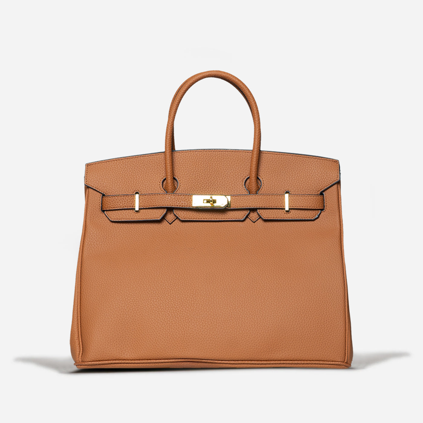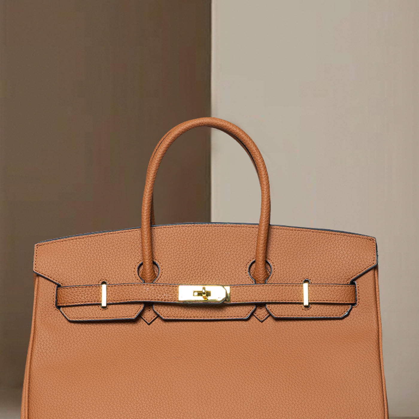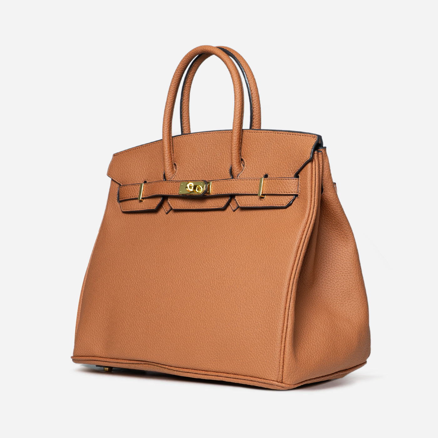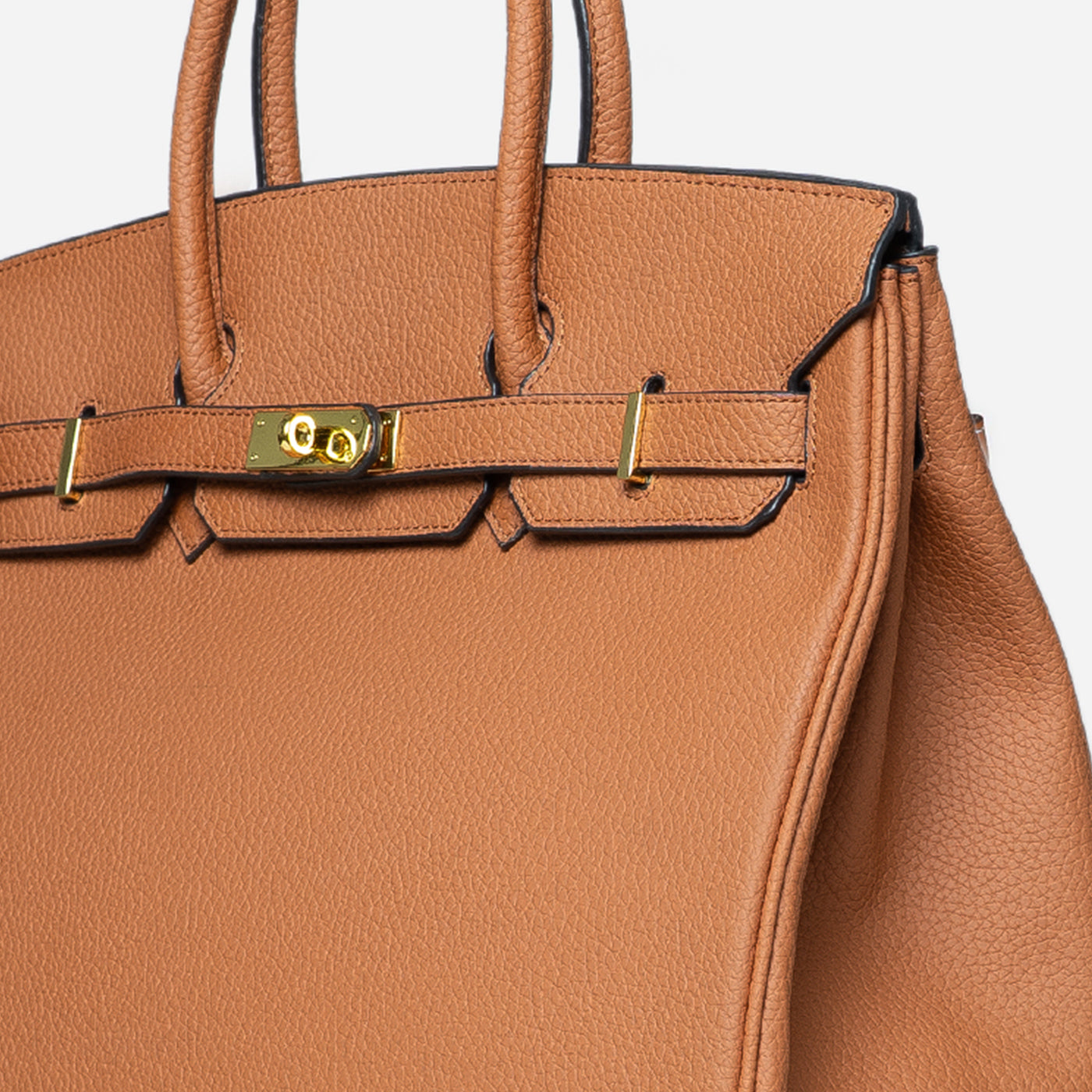 Exquisite hardware, refined craftsmanship. This close up showcases the signature turn-lock closure with polished gold-tone hardware set against rich cognac brown leather. The belted detail features precise stitching and metal accents that highlight meticulous construction. The warm pebbled leather texture creates depth and character, while the iconic hardware adds a luxurious finishing touch. A detail that exemplifies timeless design and quality craftsmanship in every element.