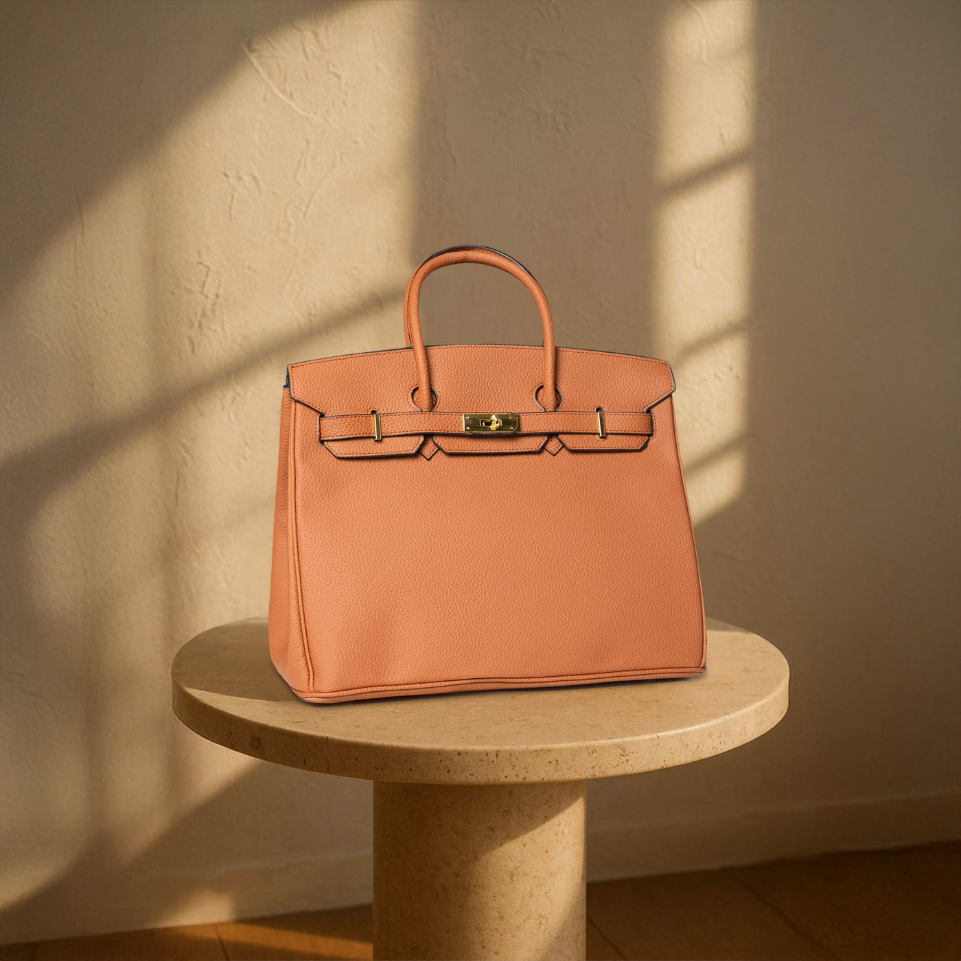 This elegant handbag showcases a beautiful coral pink leather with subtle texture and architectural structure. The iconic belted front with turn lock hardware creates a refined focal point, while the structured shape maintains impeccable form. Gold accents and dual handles add sophisticated detail. Ideal for adding a fresh pop of color to professional ensembles and special occasions.