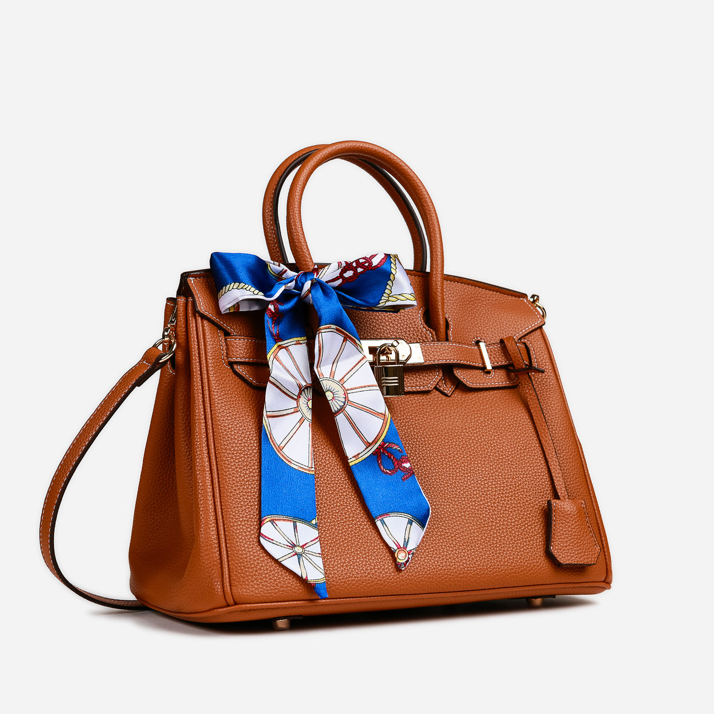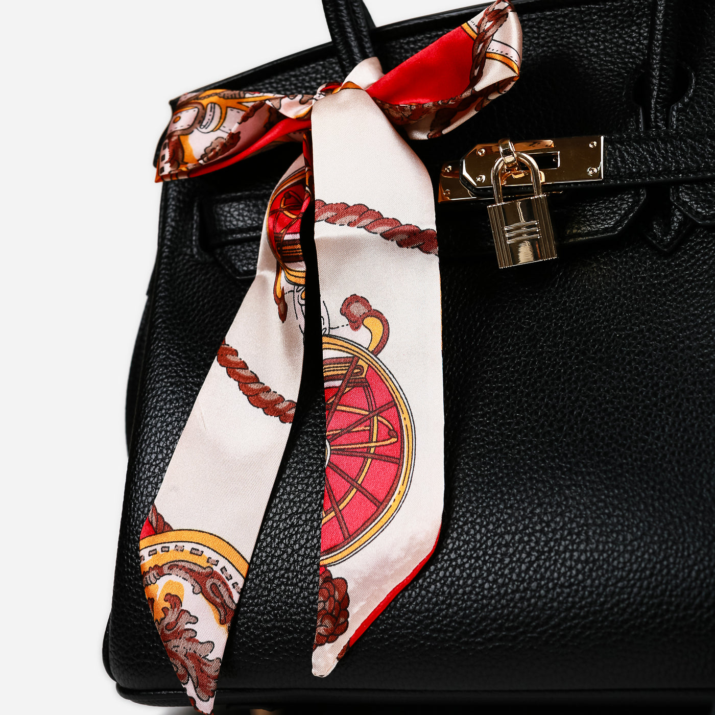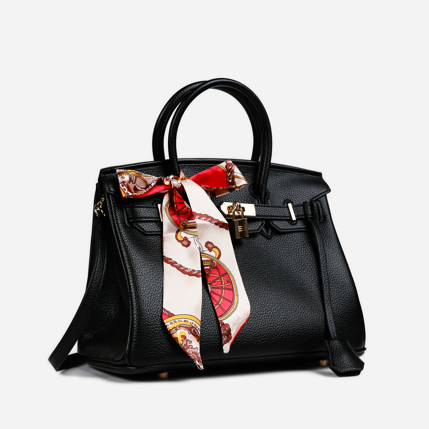 Sleek, timeless, and effortlessly chic, this structured handbag is a statement of classic sophistication. Crafted with a rich textured finish, it features a polished lock closure and a contrasting printed scarf accent that adds a refined touch of personality. Designed to be both stylish and functional, it’s the perfect companion for polished everyday looks or elevated occasions.