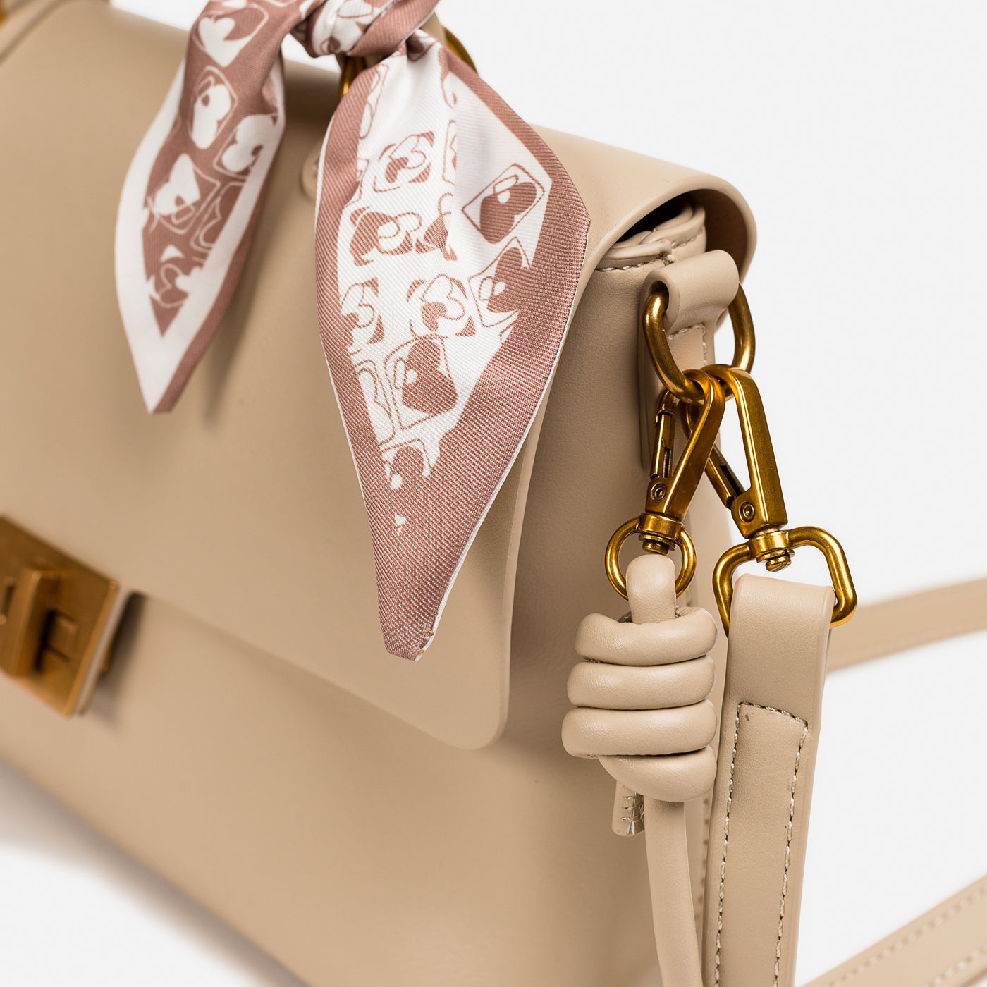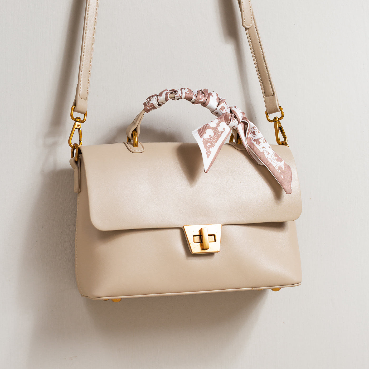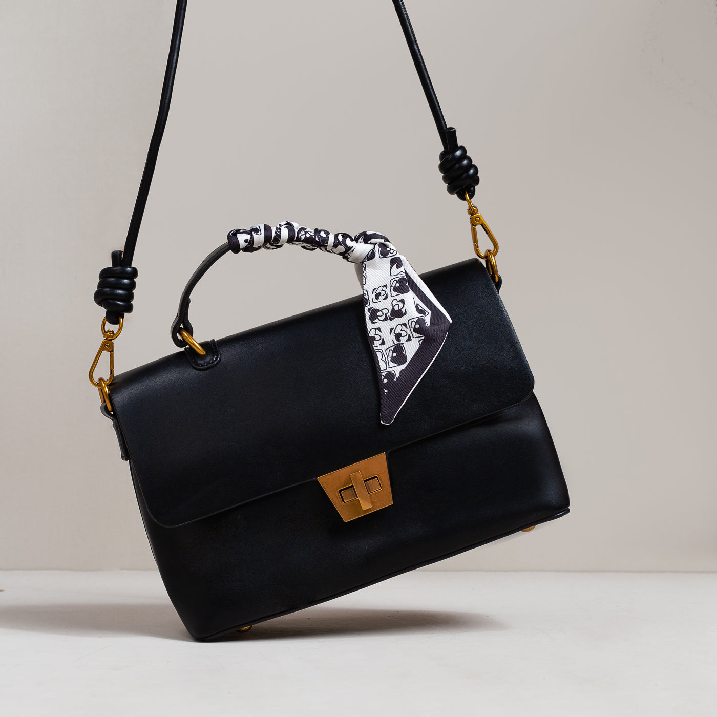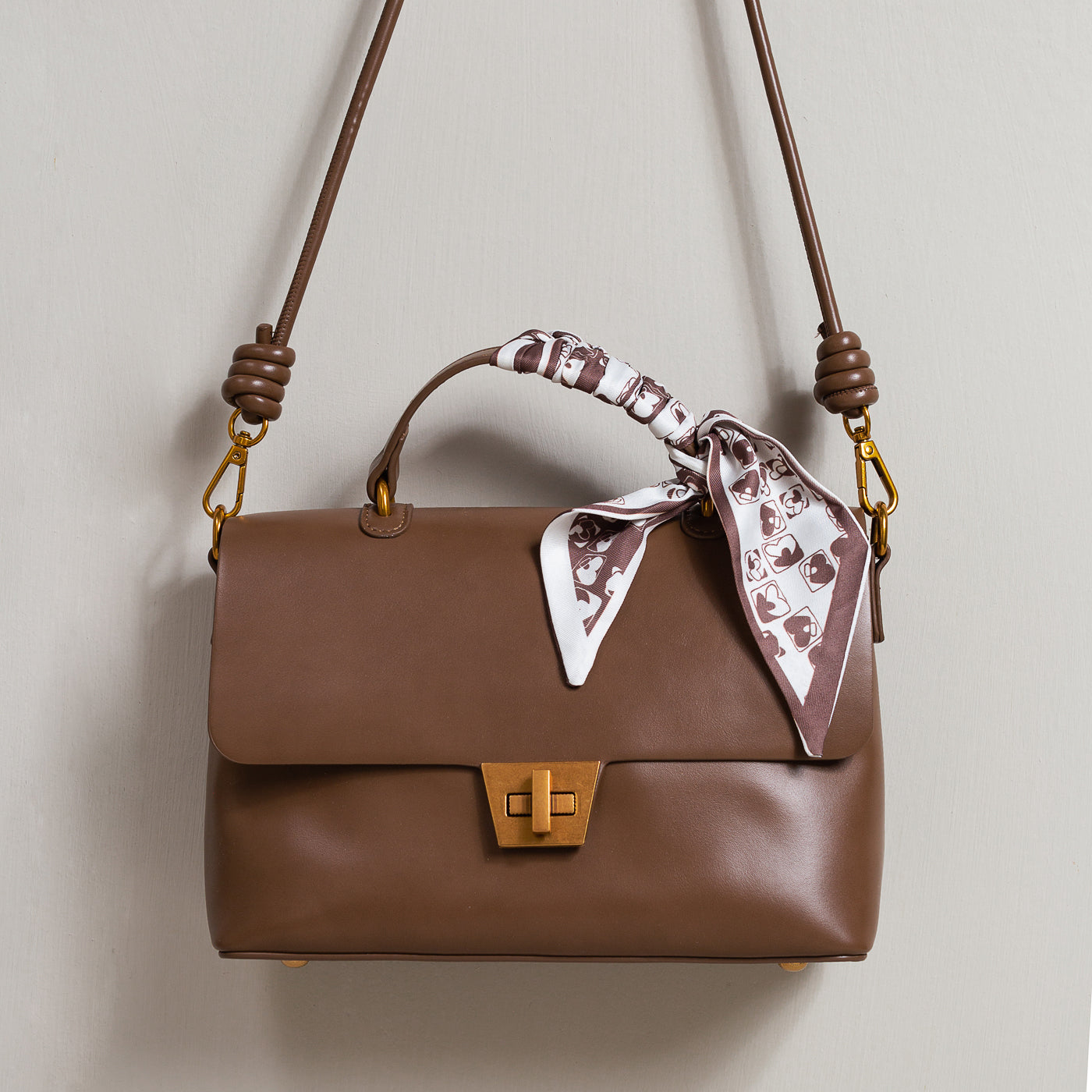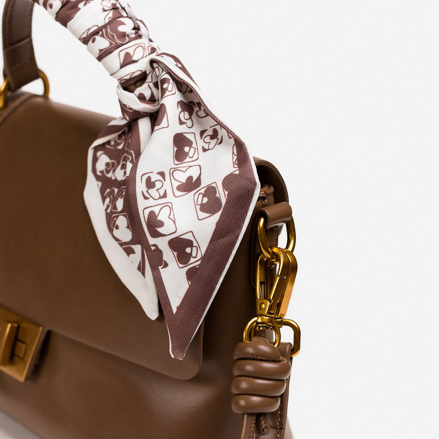 A classic yet contemporary handbag that exudes effortless grace. The structured design is elevated with refined gold hardware and a neatly folded flap closure. Its standout feature—a delicately wrapped handle with a printed scarf—adds a touch of sophistication and charm. A timeless piece that transitions seamlessly from polished workwear to chic weekend style.