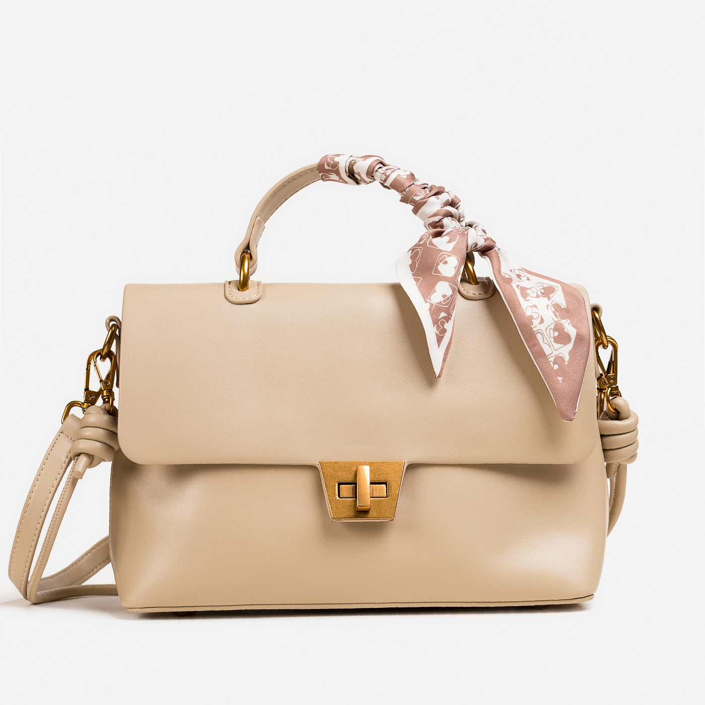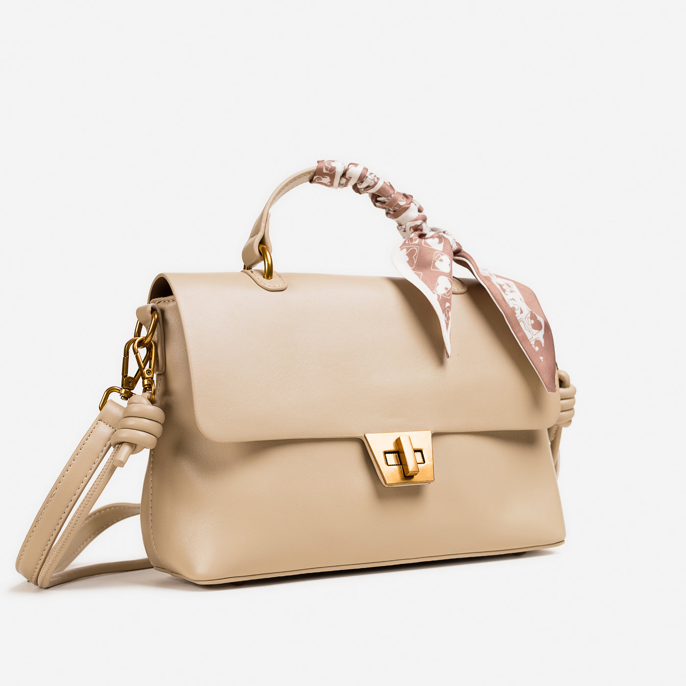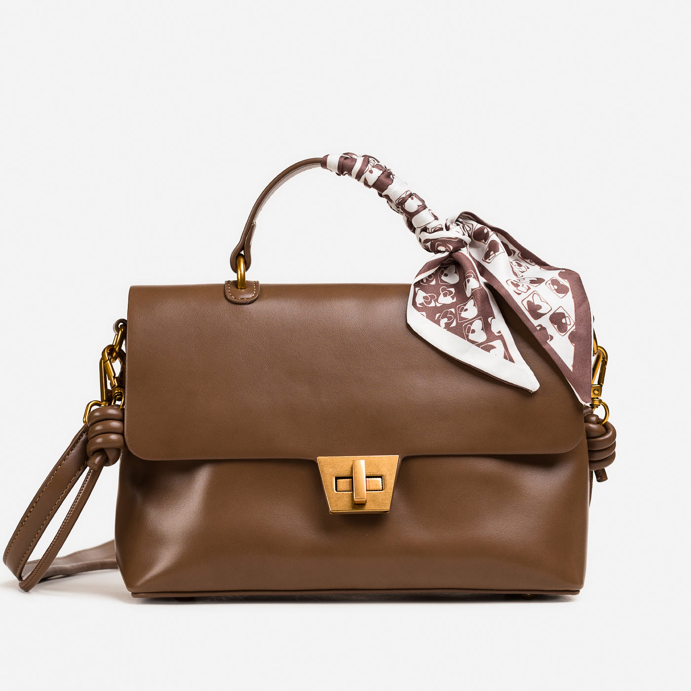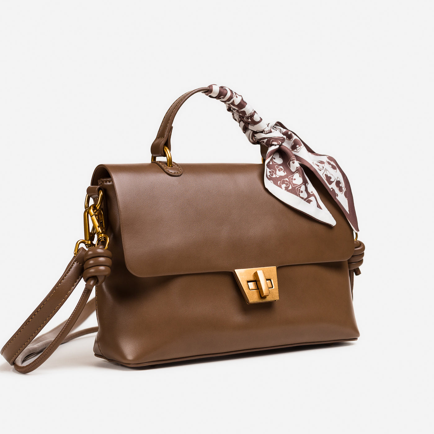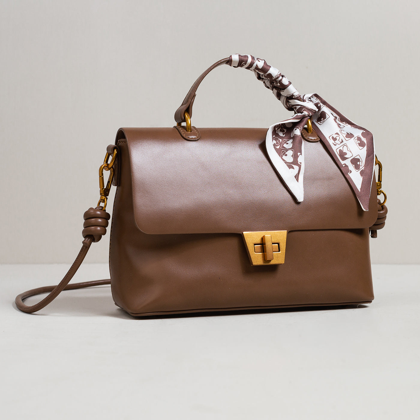 A classic yet contemporary handbag that exudes effortless grace. The structured design is elevated with refined gold hardware and a neatly folded flap closure. Its standout feature—a delicately wrapped handle with a printed scarf—adds a touch of sophistication and charm. A timeless piece that transitions seamlessly from polished workwear to chic weekend style.