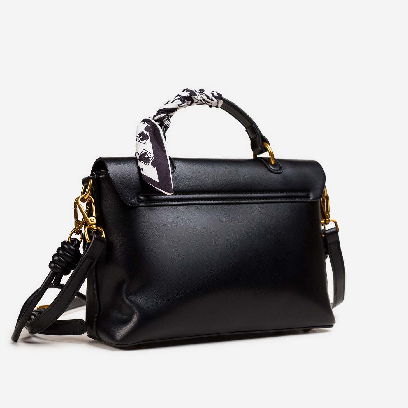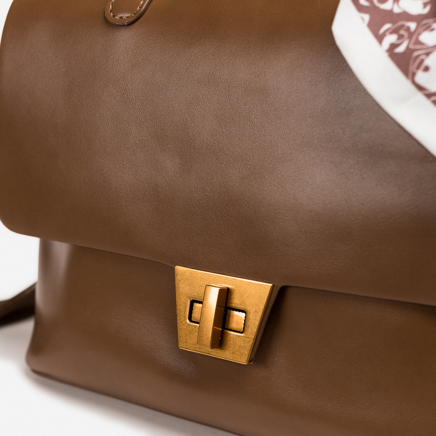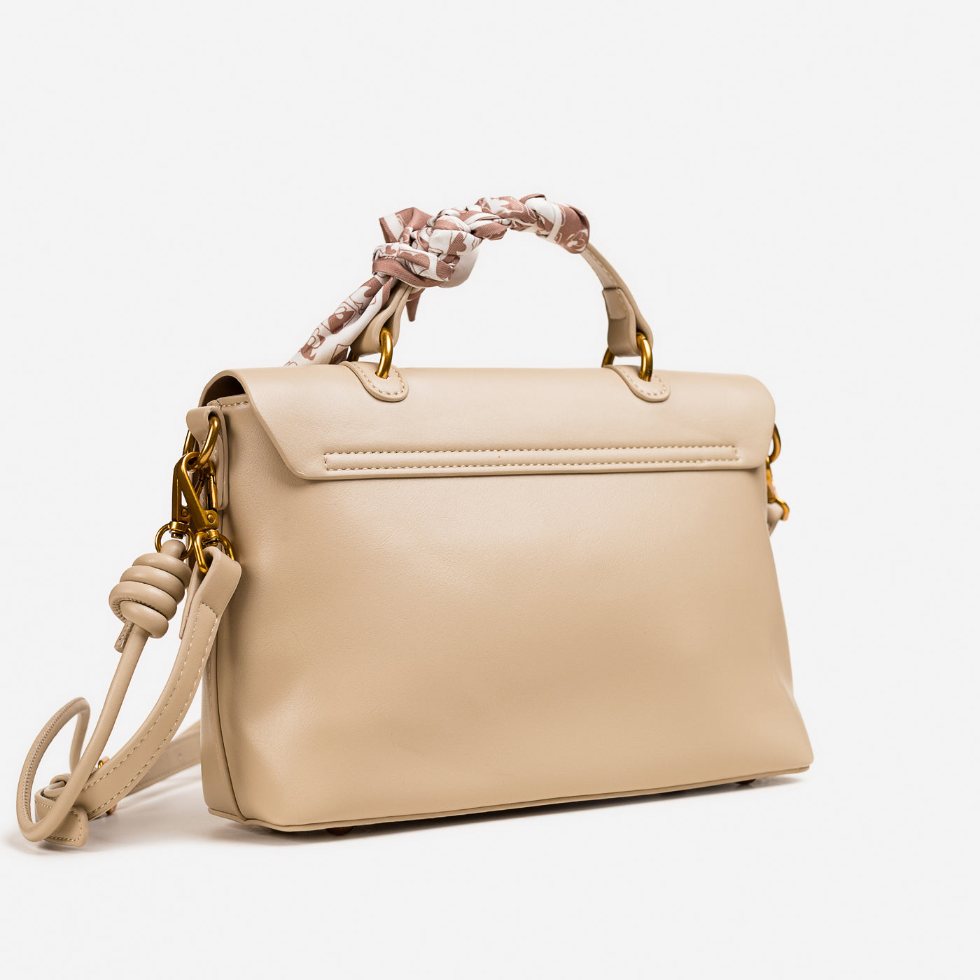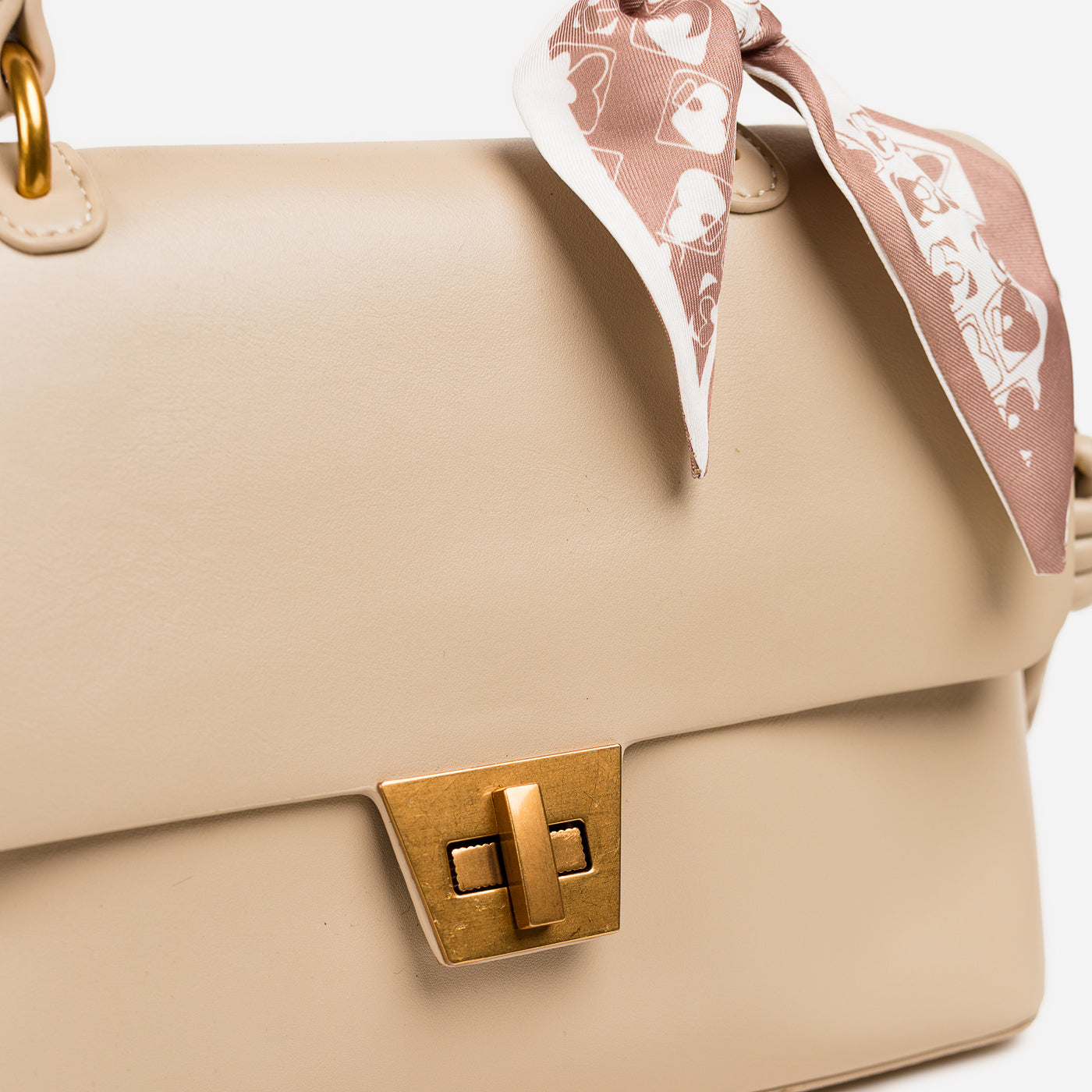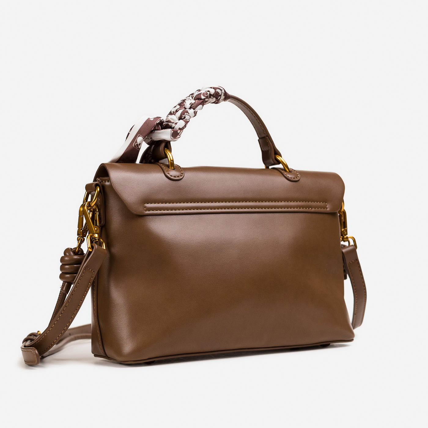 A classic yet contemporary handbag that exudes effortless grace. The structured design is elevated with refined gold hardware and a neatly folded flap closure. Its standout feature—a delicately wrapped handle with a printed scarf—adds a touch of sophistication and charm. A timeless piece that transitions seamlessly from polished workwear to chic weekend style.
