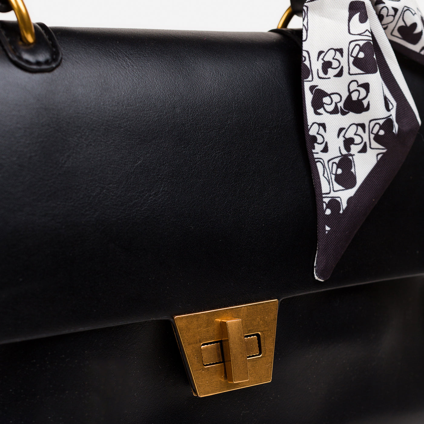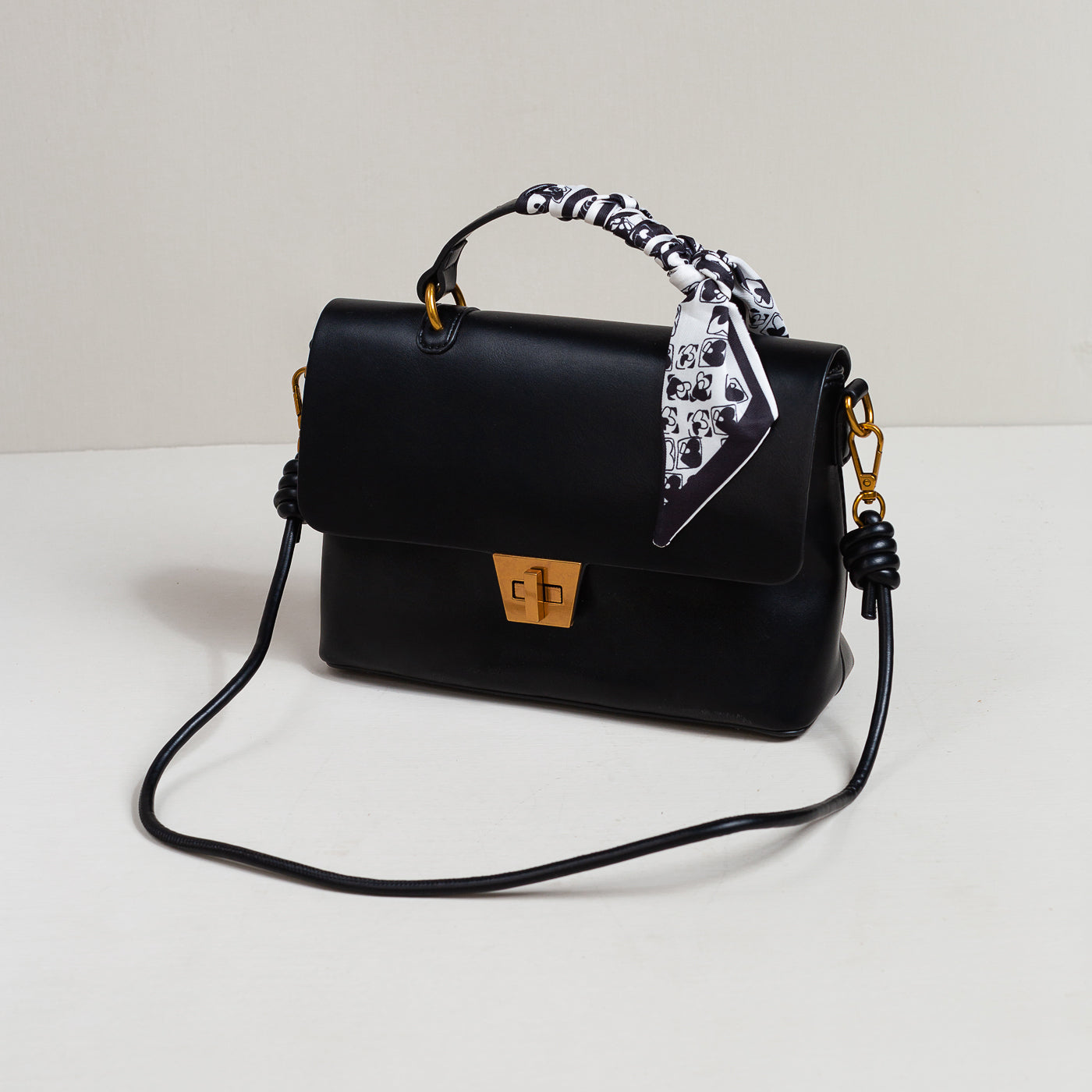 A sleek and refined handbag that defines modern elegance. The structured body is accentuated with gold hardware and a chic top handle wrapped in a printed scarf, creating a perfect balance of sophistication and charm. Its minimalist silhouette and versatile design make it a timeless companion for both workwear and evening ensembles.