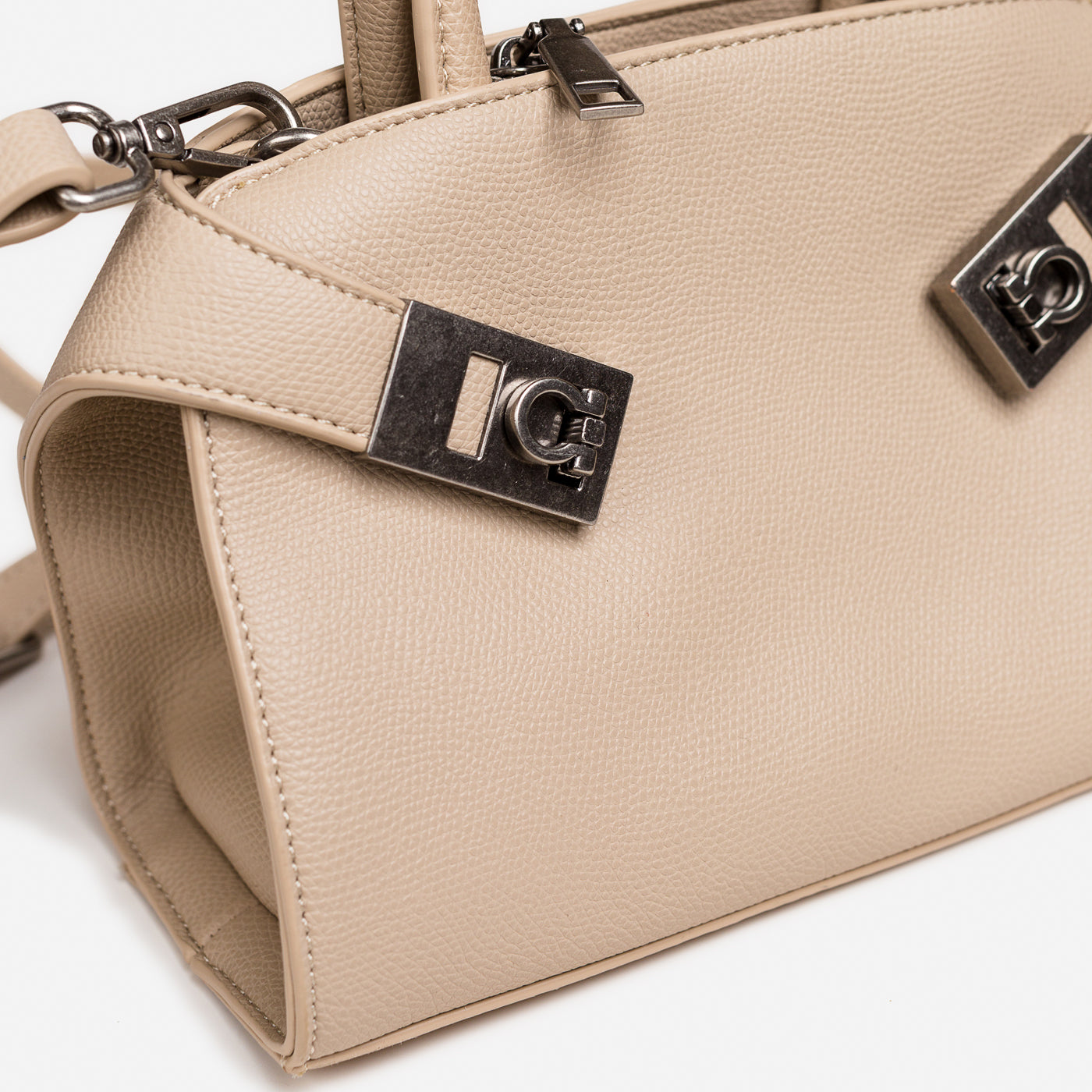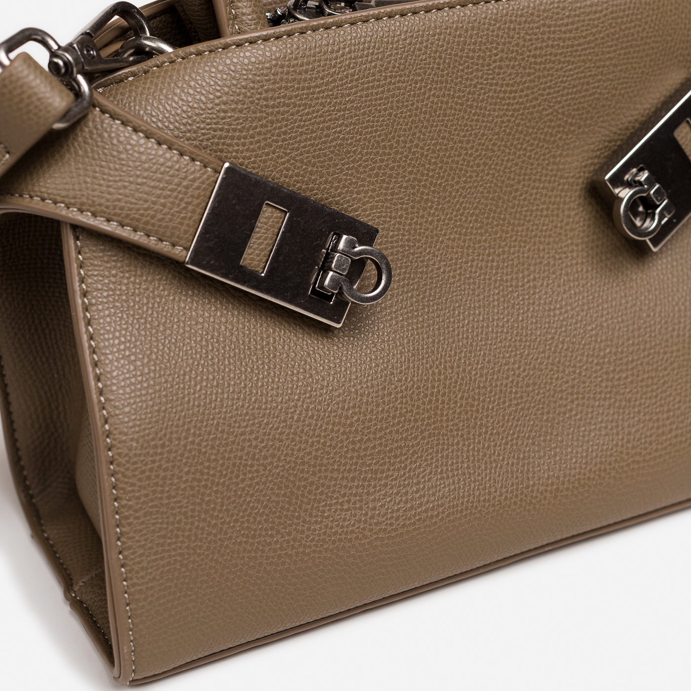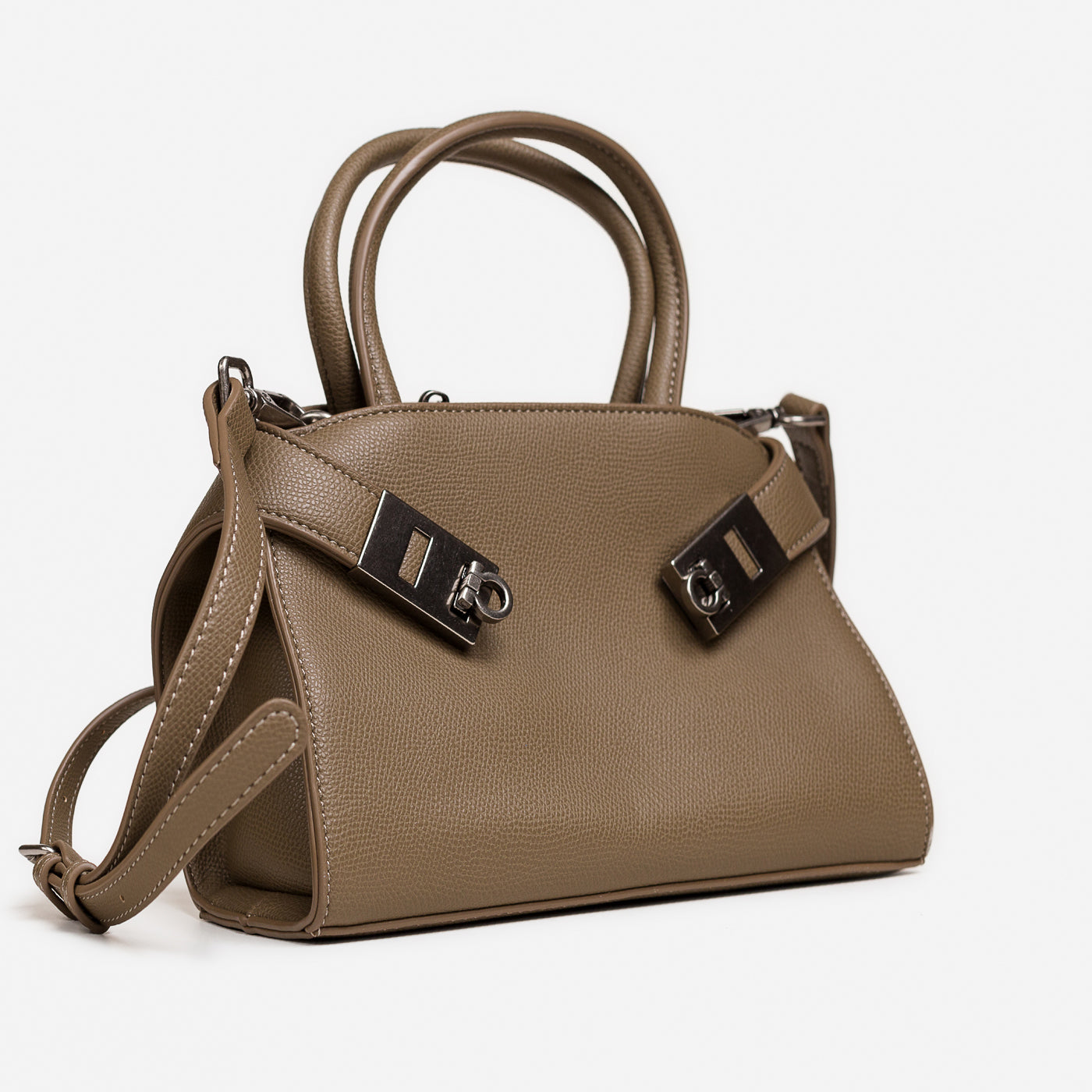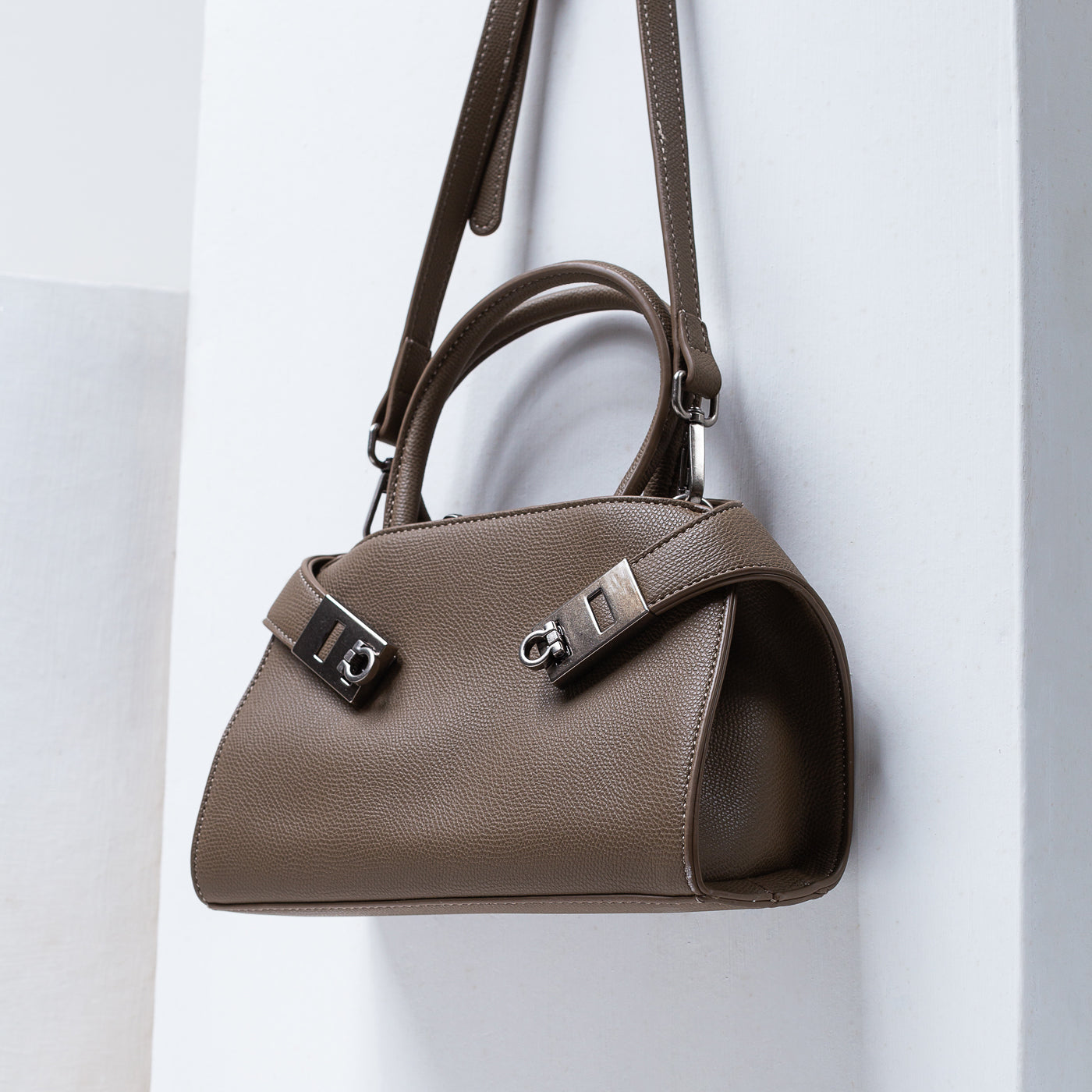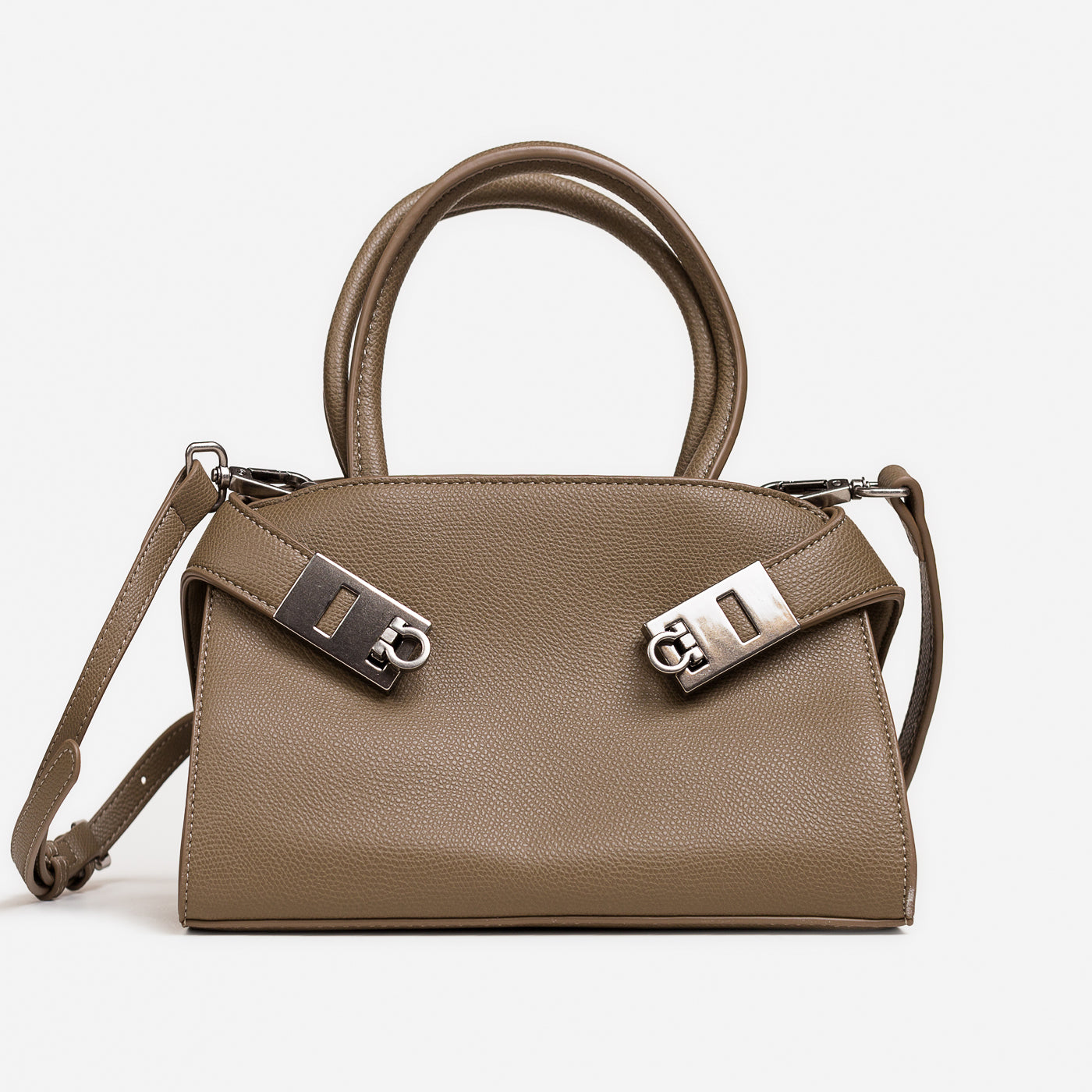 Adoro’s Prestige Satchel embodies understated luxury. Crafted from premium textured leather in a versatile taupe grey shade, it features a structured silhouette accented with polished silver hardware. Dual top handles and a detachable shoulder strap offer styling flexibility, while the secure clasp detail adds a refined touch. Spacious yet elegant, this satchel transitions seamlessly from business meetings to evening outings with timeless sophistication.