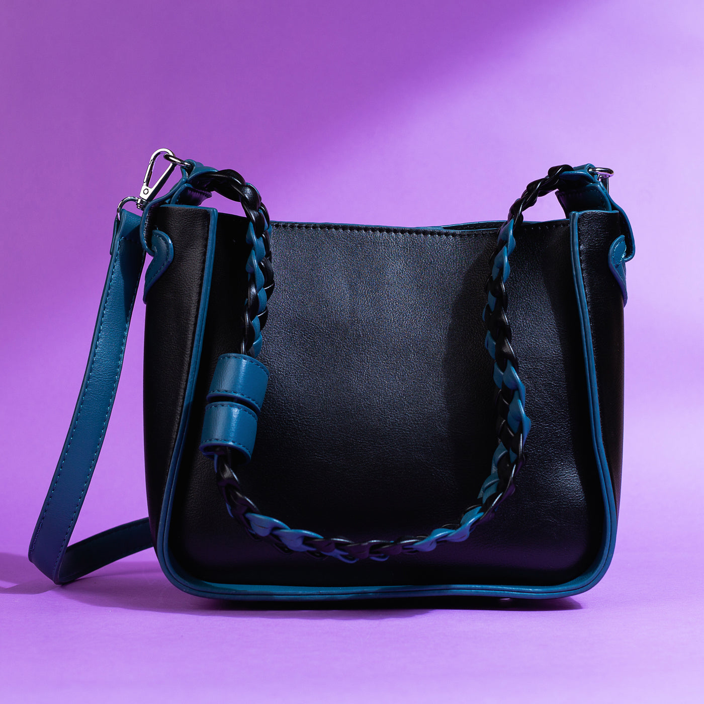 Bold, sleek, and unapologetically modern the Twist & Trend Crossbody brings attitude to everyday style. Its smooth black finish is framed with striking teal edges, while the braided contrast handle adds a playful, sculptural twist. Designed for movement and versatility, the adjustable strap lets you go hands-free and effortless, from day errands to evening hangs. Compact yet roomy enough for essentials, this piece blends function with standout style perfect for the confident trend-setter who loves a pop of edge.