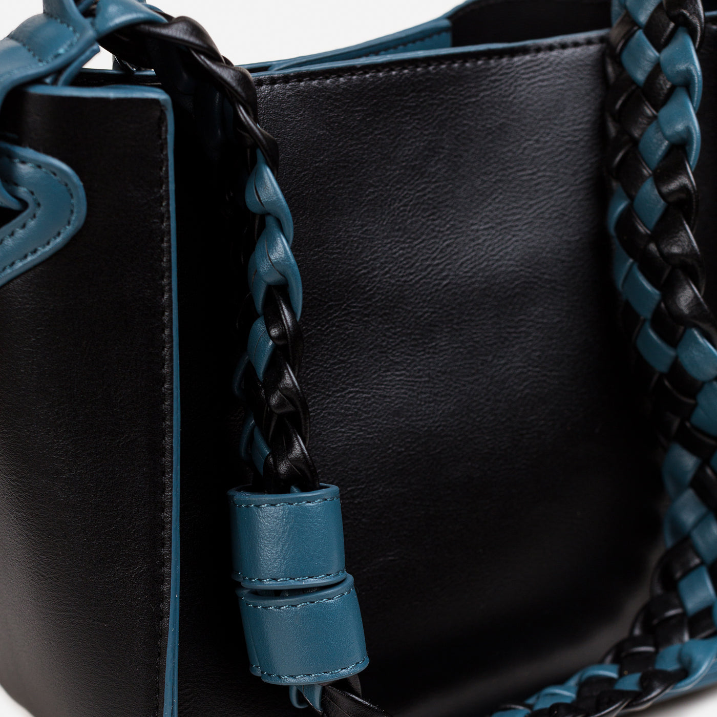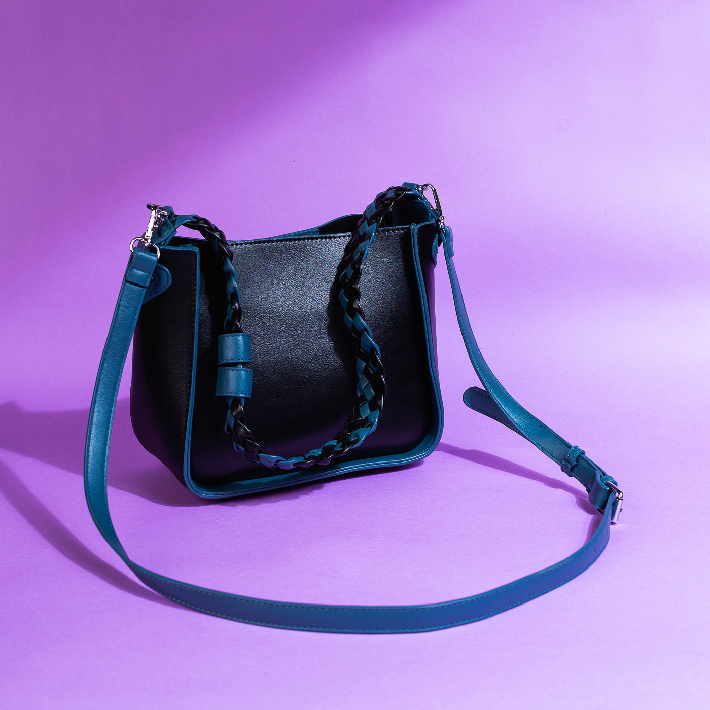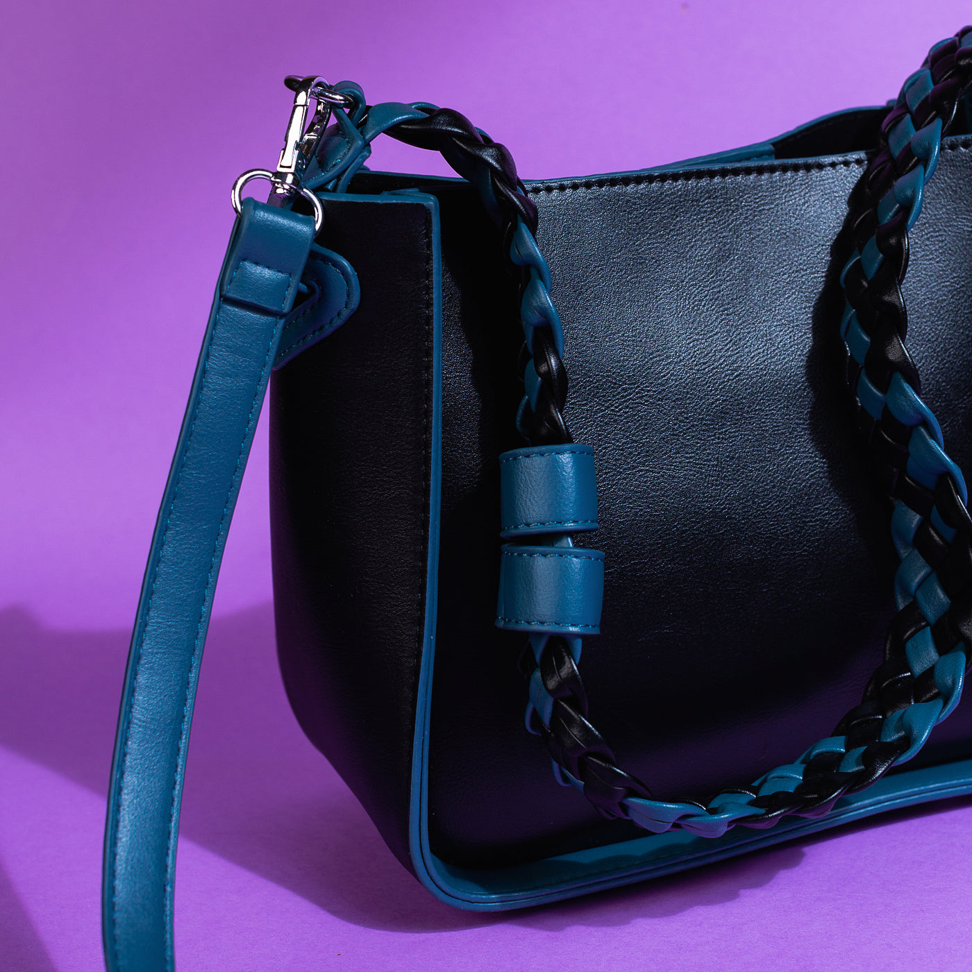 A sleek black bag elevated with striking teal edges and braided strap details, blending structure with a touch of playful edge. Minimal design, maximum statement perfect for everyday style with attitude. Crafted for both comfort and style, it features a roomy interior ideal for daily essentials while still keeping a refined silhouette. The contrast leather details add sophistication, making it your go-to accessory from casual outings to chic city evenings. Carry it crossbody or by hand either way, it turns heads effortlessly.