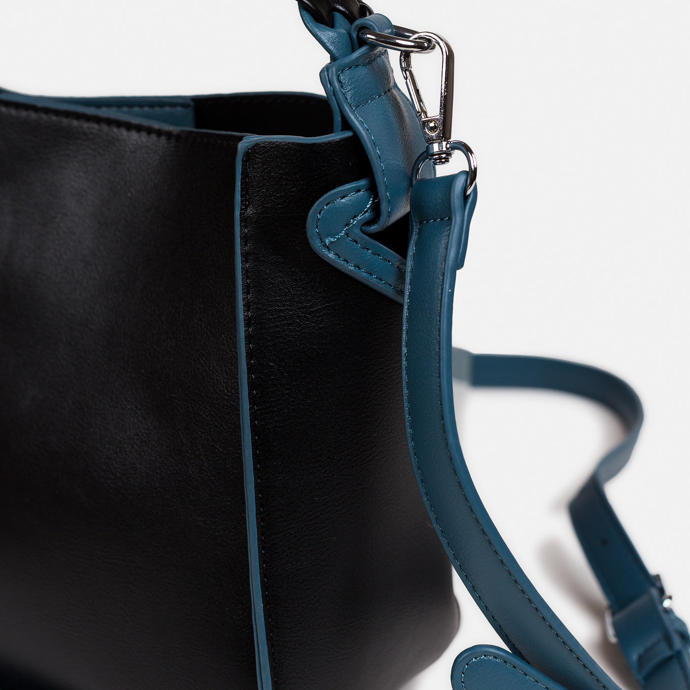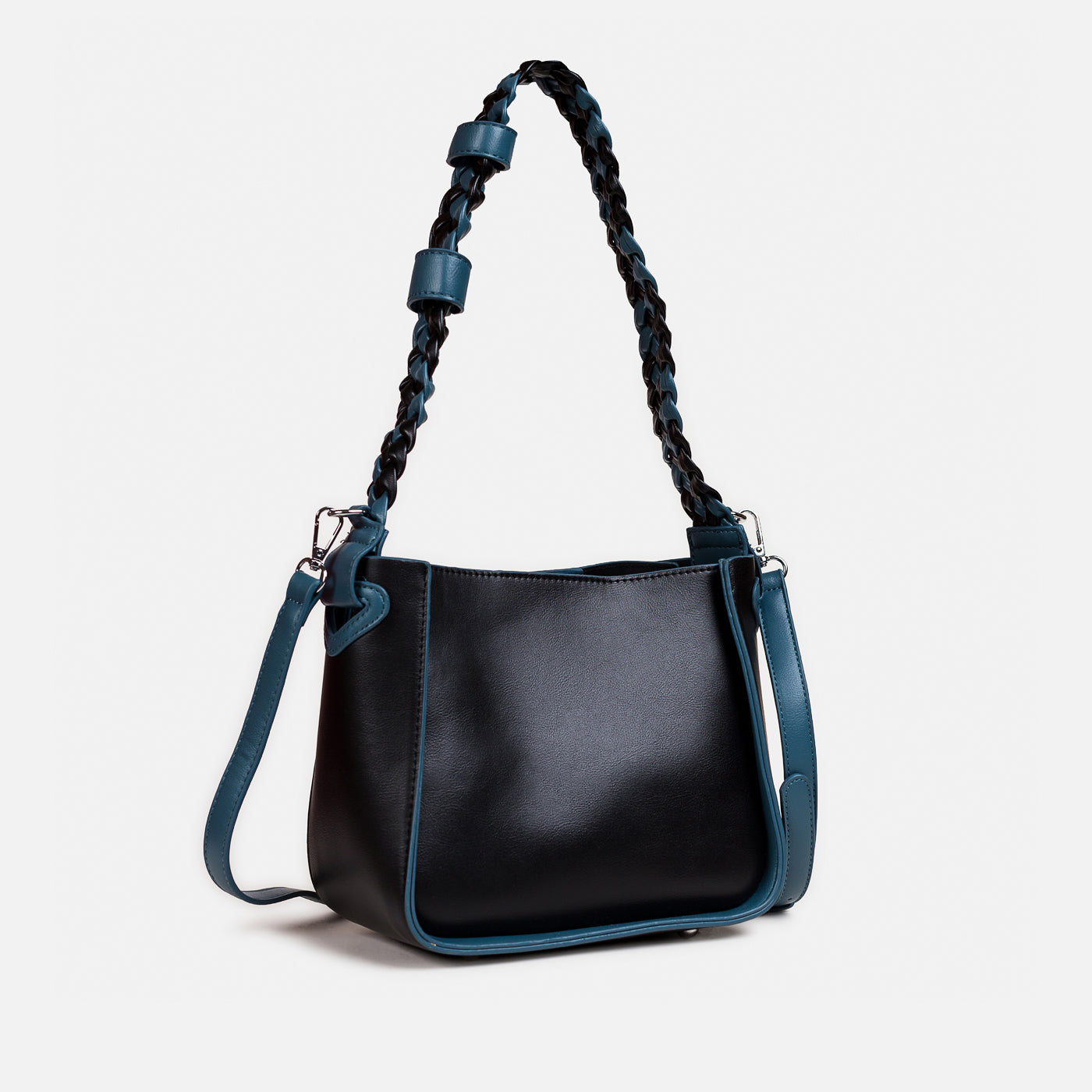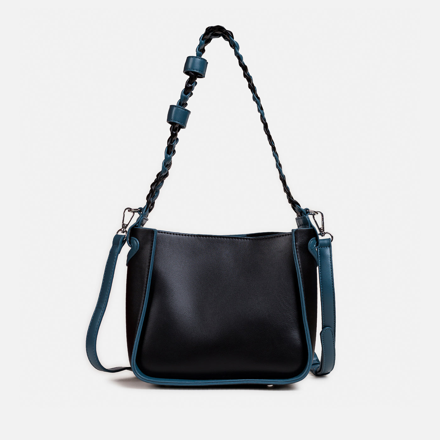 A sleek black bag elevated with striking teal edges and braided strap details, blending structure with a touch of playful edge. Minimal design, maximum statement perfect for everyday style with attitude. Crafted for both comfort and style, it features a roomy interior ideal for daily essentials while still keeping a refined silhouette. The contrast leather details add sophistication, making it your go-to accessory from casual outings to chic city evenings. Carry it crossbody or by hand either way, it turns heads effortlessly.