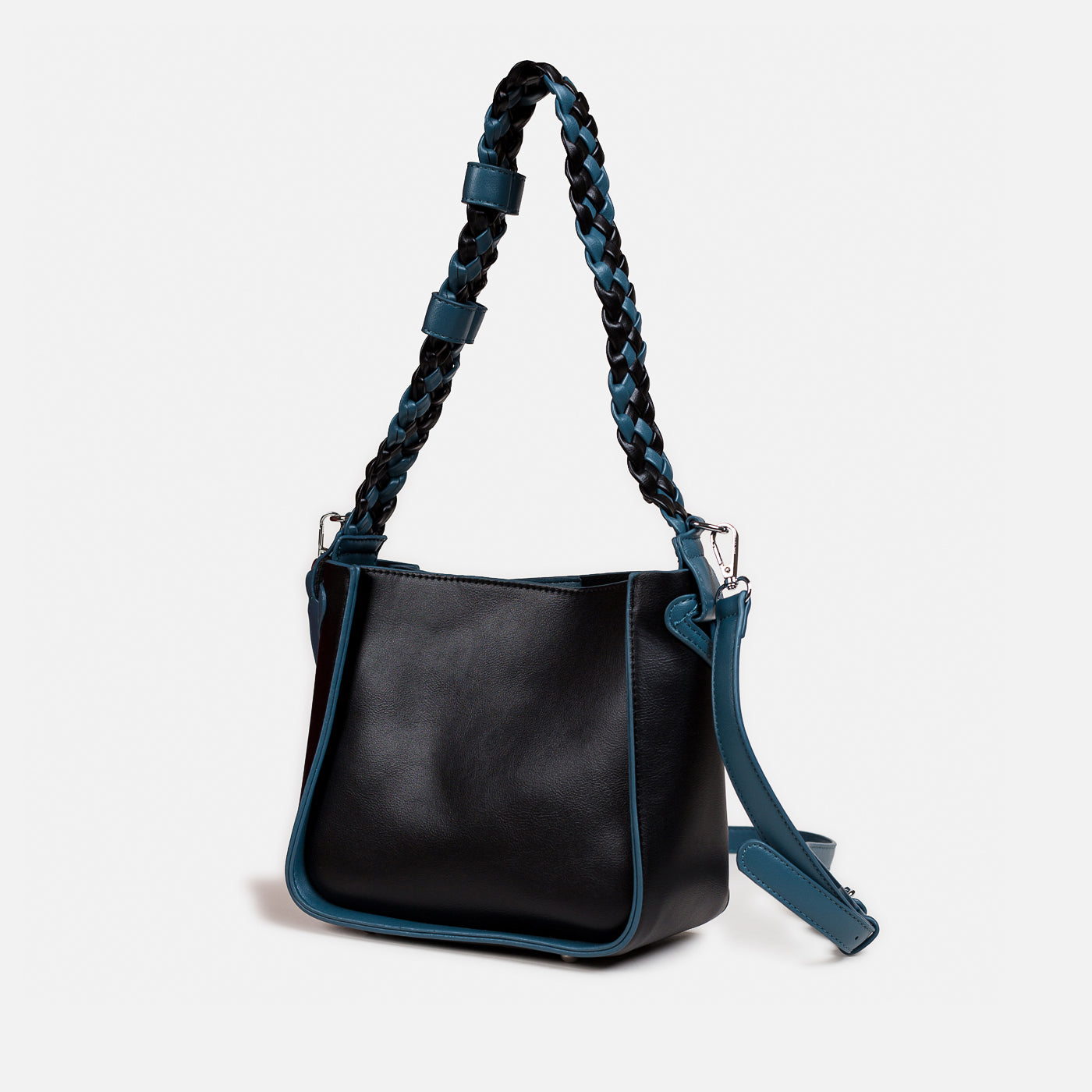 The sleek black body is framed by striking teal accents, with bold braided detailing adding a unique sculptural touch. Lightweight yet structured, it’s designed for day-to-night versatility.