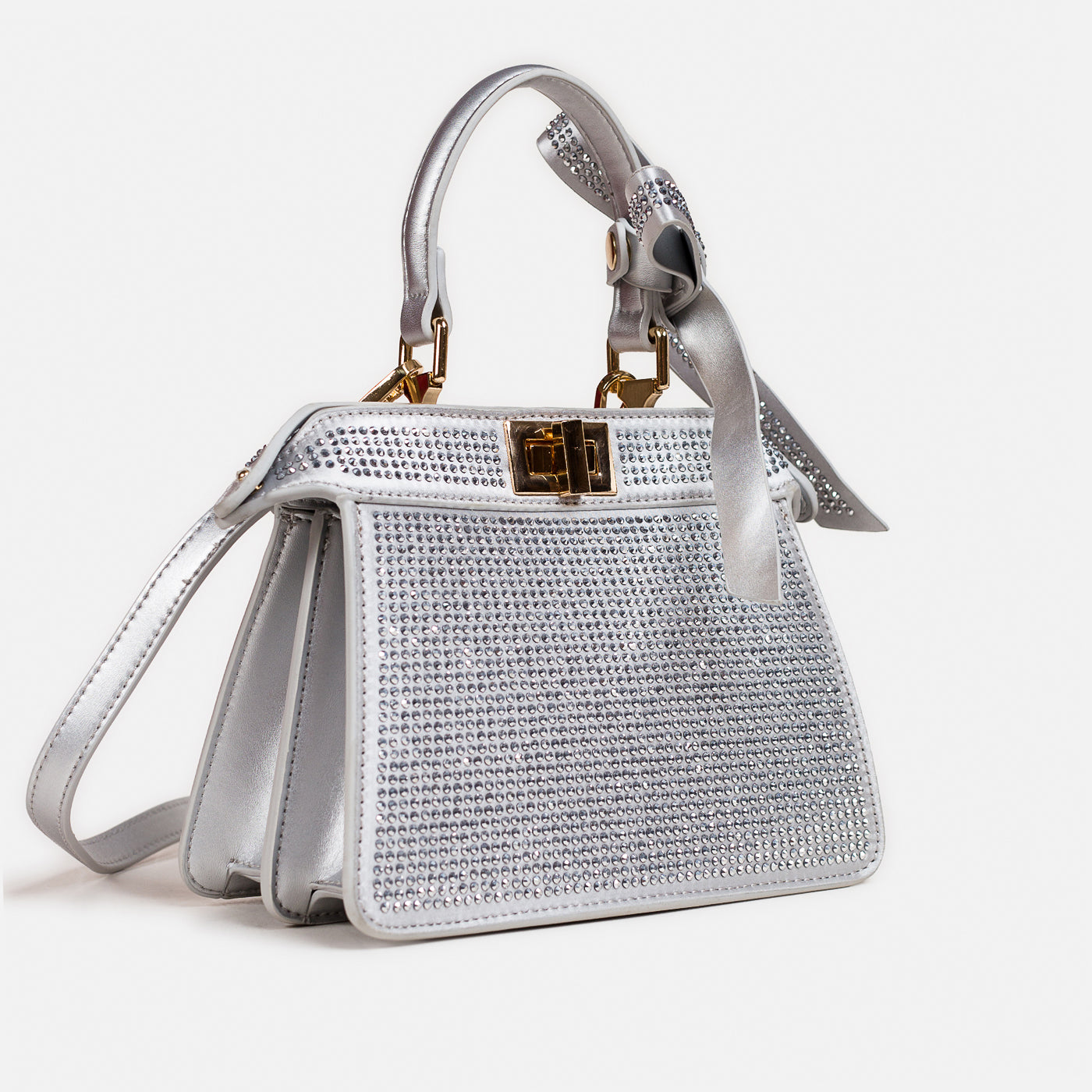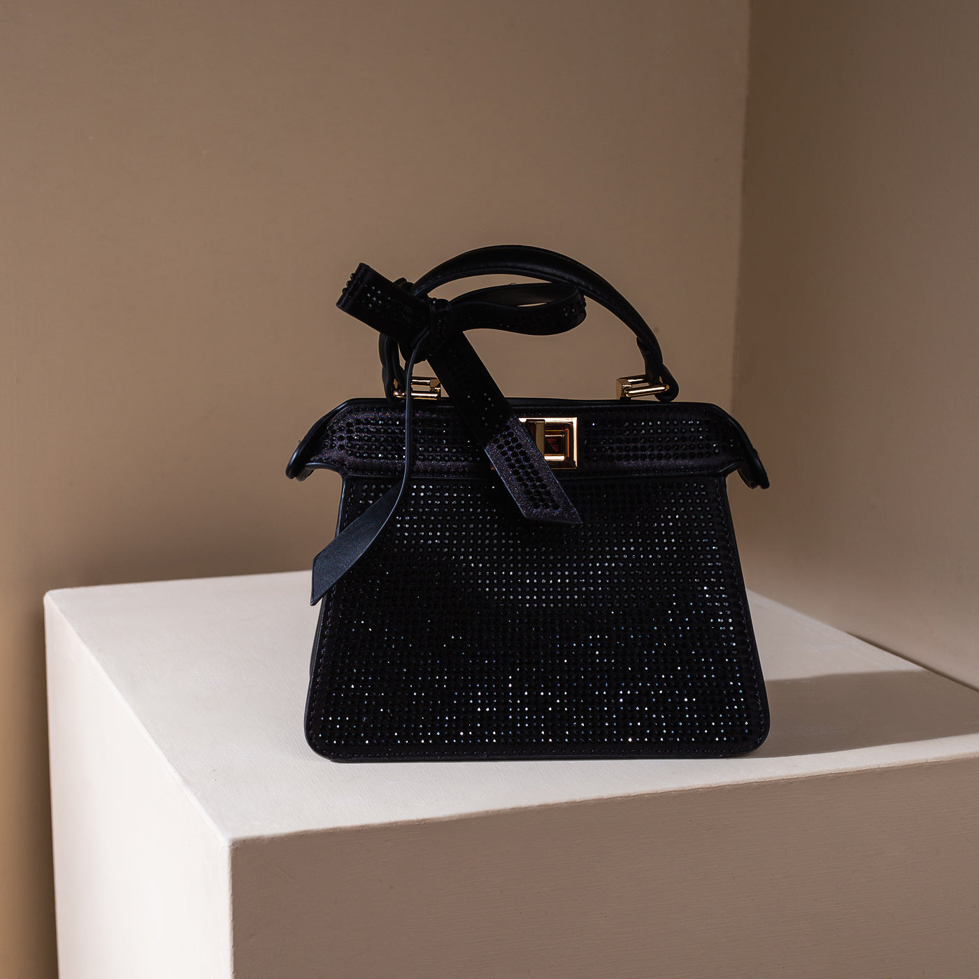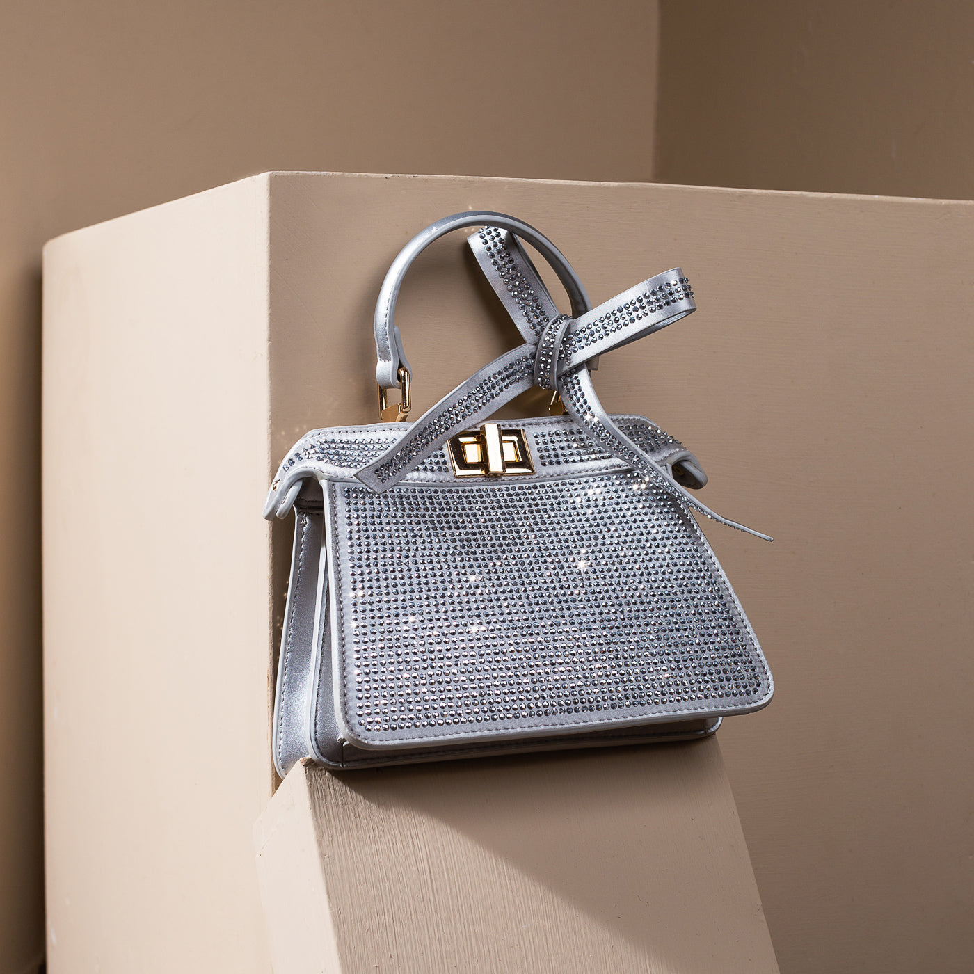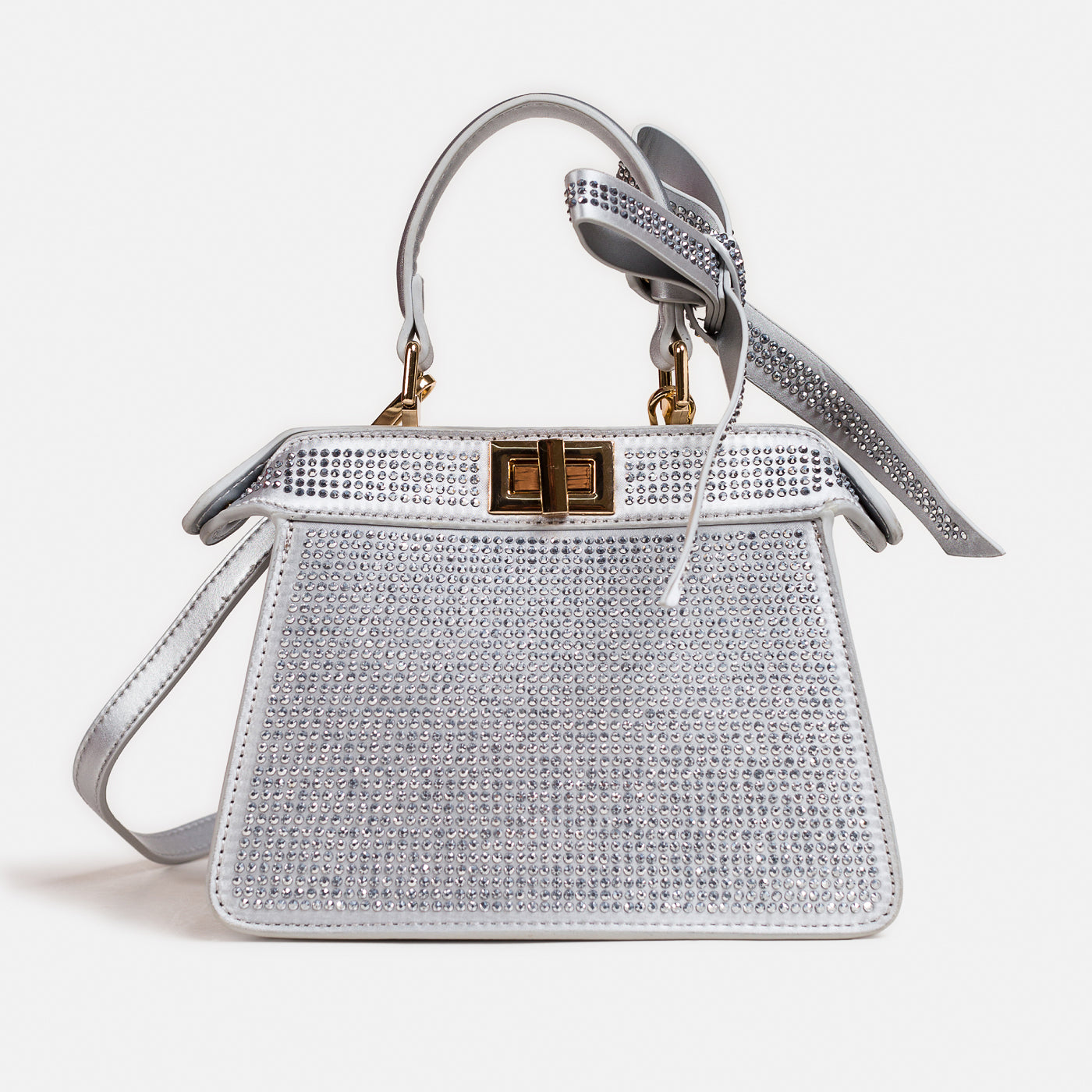 The Gleam & Grace Satchel embodies timeless elegance with a sparkling modern twist. Its structured frame is fully embellished with radiant crystals, creating a refined shimmer that instantly elevates any look. The standout bow accent along the handle adds a graceful charm, making it both feminine and sophisticated. Designed with versatility in mind, it features a classic top handle for a chic carry and a detachable strap for hands-free ease. The secure twist-lock closure and spacious interior ensure practicality without compromising style. Whether for festive evenings, weddings, or a glamorous night out, this satchel is your perfect companion to shine with confidence and grace.