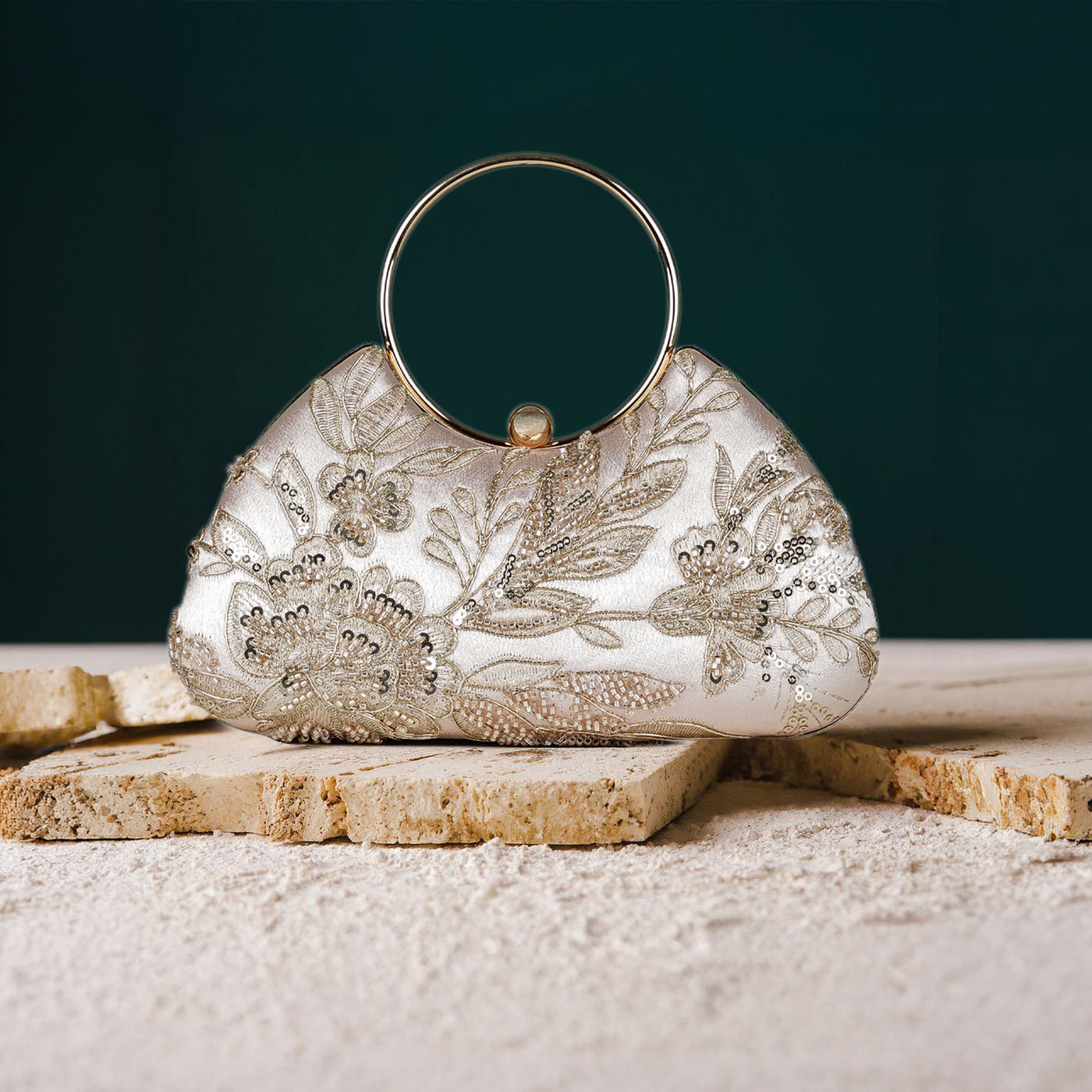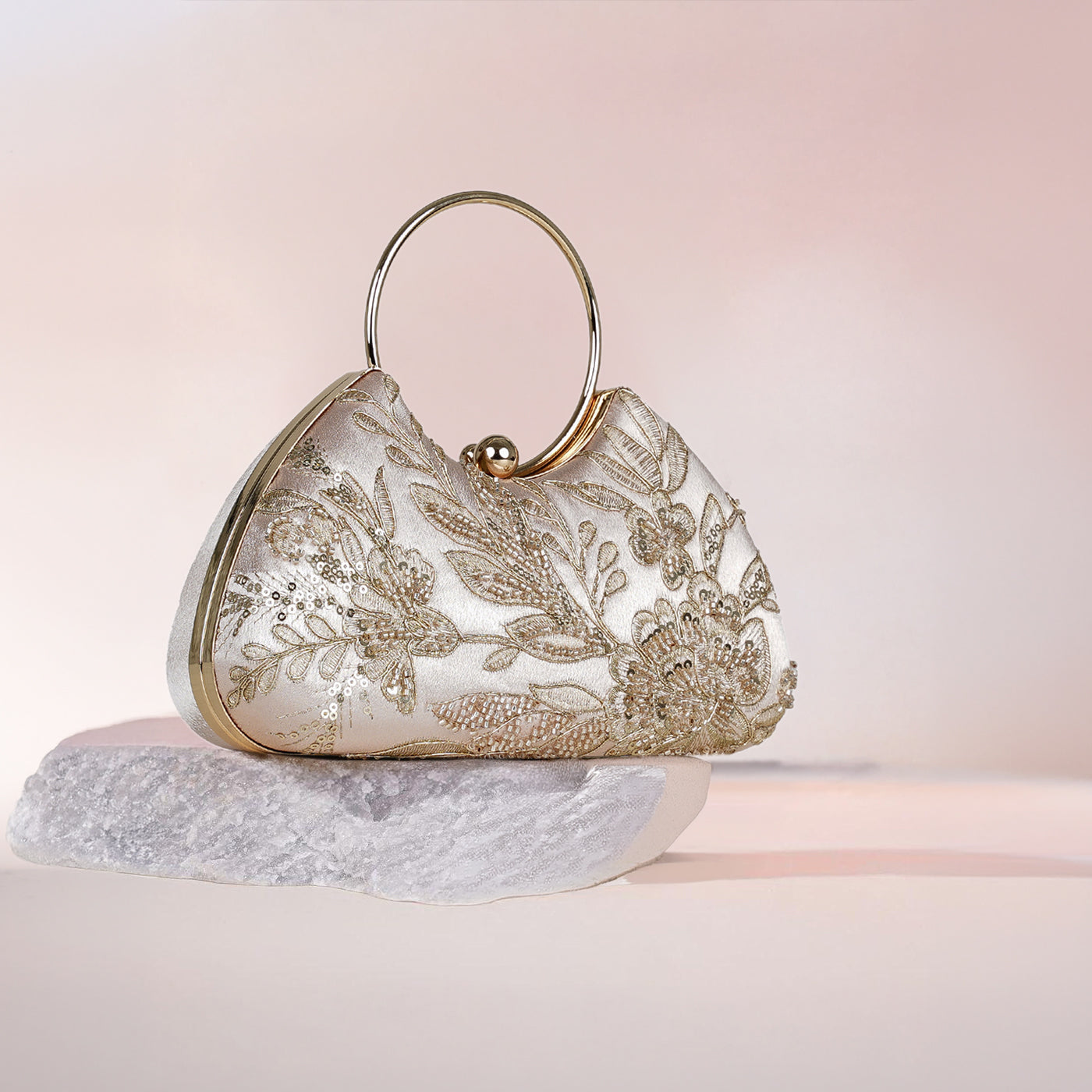 The slim gold ring handle sits naturally between the fingers or over the wrist, with the fixed circular form providing a secure grip during carry and the polished gold finish coordinating with the frame and embellishment tone across both variants. The wide domed frame opens fully via the kiss clasp, providing access to a compact interior that accommodates a phone, cards, a lipstick, and small evening essentials. The full-surface floral embellishment and gold frame make this clutch suited for formal occasions, wedding events, festive gatherings, and modest bridal or evening dressing.