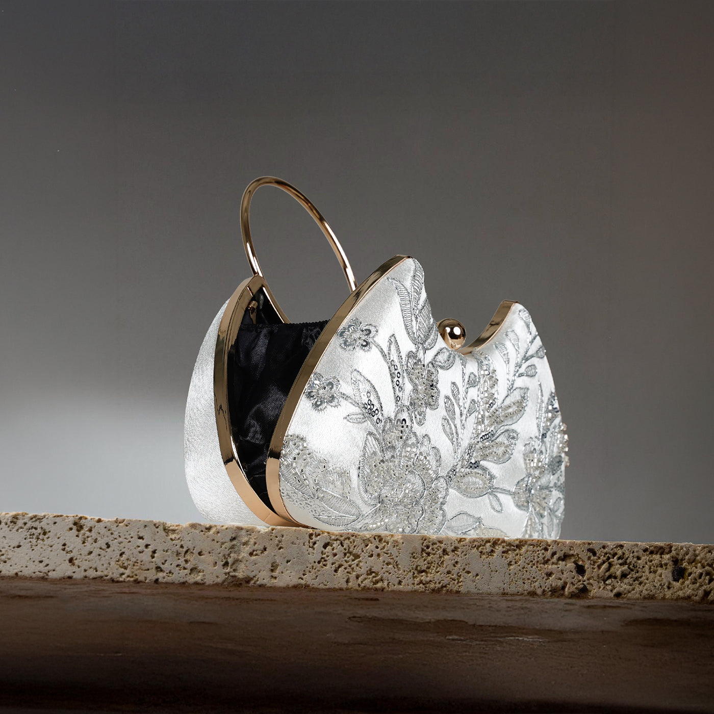 Hand-Embroidered Satin Clutch, Domed Half-Moon Frame.